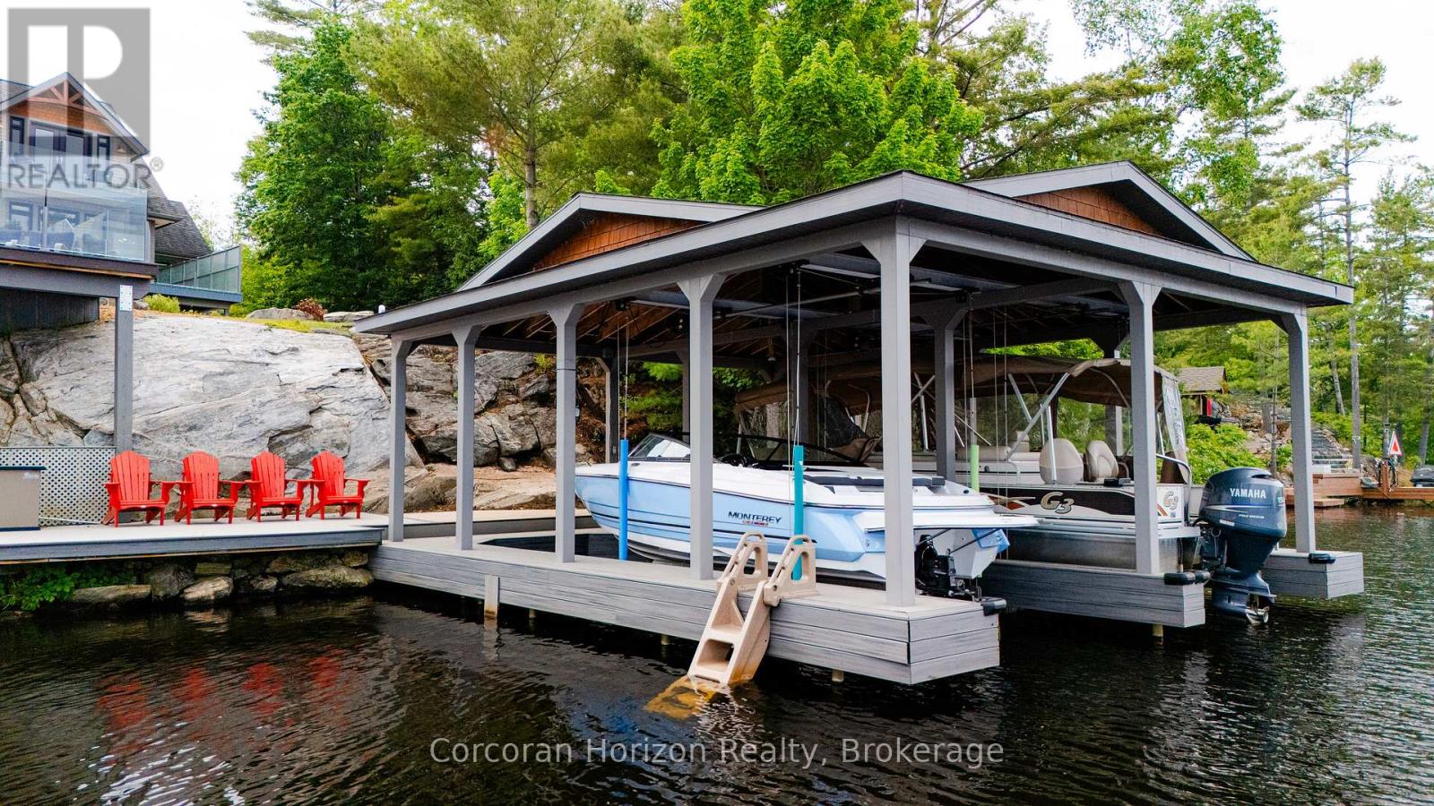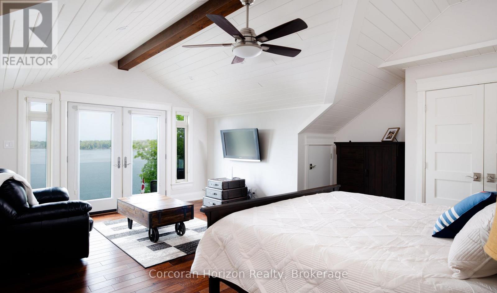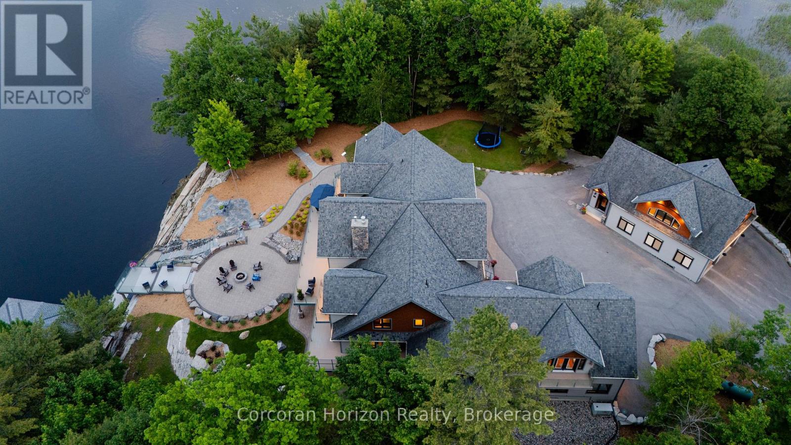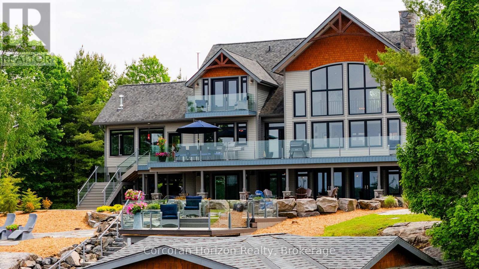 Welcome to the crown jewel of Ontario's world-renowned cottage country an exquisite combination of 10,000+ sq. ft. custom-built estate retreat perched on the exclusive southeast tip of Pilkington Island, one of only five estate lots with rare year-round road access and just 90 minutes from Toronto, minutes off Highway 400. This private peninsula offers over 550+ feet of pristine shoreline on Gloucester Pool, part of the historic Trent-Severn Waterway, featuring deep, clean water ideal for endless boating, swimming, and waterfront relaxation. A rare double-slip steel boat port, separate floating dock, and breathtaking panoramic views ensure every sunset is unforgettable. Inside, luxury abounds with a grand Great Room and floor-to-ceiling granite fireplace, a formal dining room for 16, a gourmet kitchen with professional appliances and walk-in pantry, a serene Muskoka Room, a main-floor Master and VIP suite, four upper-level bedroom suites with a loft and kids den, plus a walk-out lower level with two additional suites, granite fireplace, wet bar, games and exercise rooms. The estate also includes an oversized attached double garage, a detached garage with a nanny/in-law suite above, newly paved driveway, and fresh landscaping the ultimate blend of exclusivity, elegance, and the cottage lifestyle. (id:64974)