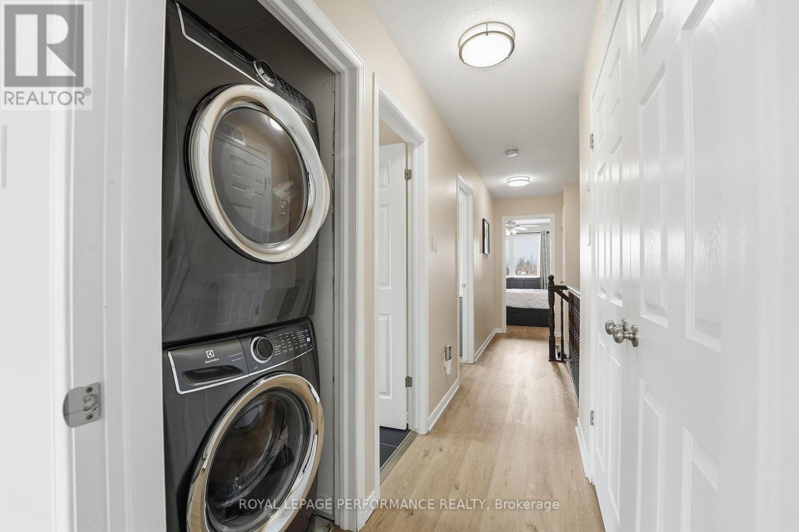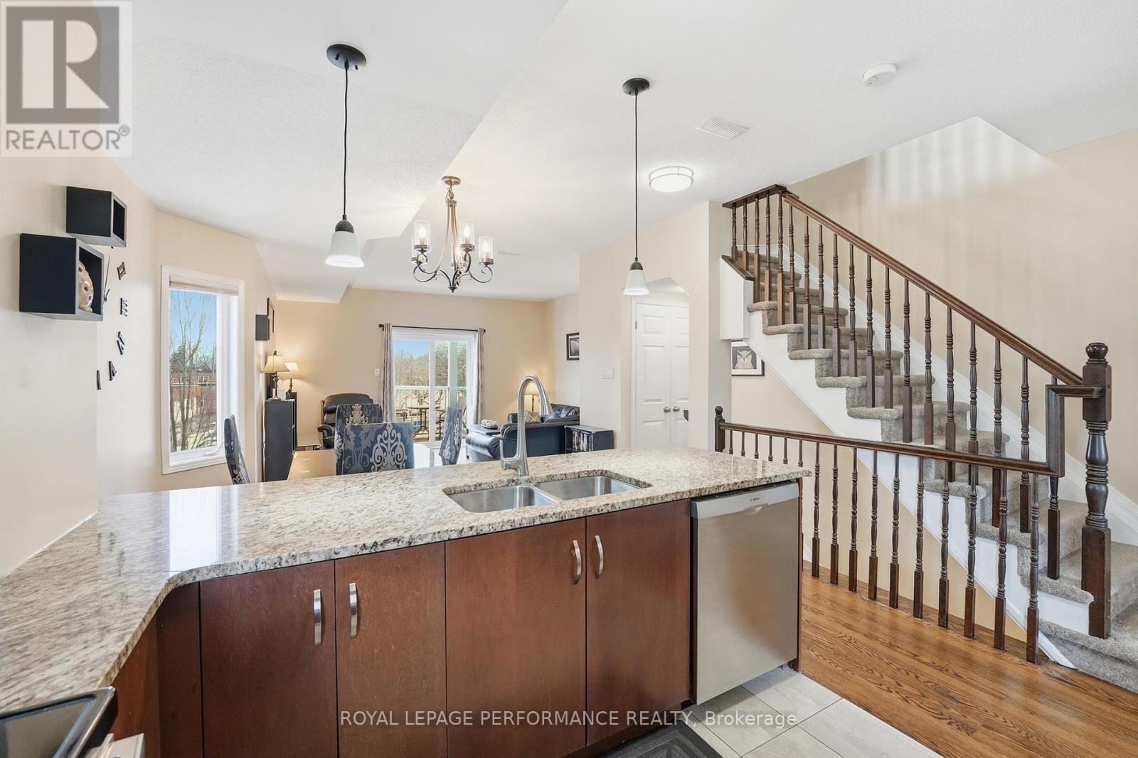 Welcome to this 3-bedroom + den, 2-bathroom upper-unit stacked condo in Kemptville Meadows, perfectly located on the edge of town where you can enjoy a quiet community while staying close to everything you need. This move-in ready and beautifully upgraded owner-occupied condo offers over 1,300 sq ft of living space and is ideal for first-time buyers, couples, young families and investors alike. The bright main floor features several windows, beautiful hardwood flooring, a versatile den perfect for a home office or playroom, an open-concept living space between the kitchen and living room, a convenient powder room & laundry area. The kitchen is stylish and functional, offering dark cabinetry, granite countertops, stainless steel appliances, and a breakfast bar with seating area. The living room is spacious and provides access to a large balcony. Upstairs, you'll find vinyl flooring throughout, three well-sized bedrooms, and a full bathroom. The primary bedroom offers two closets and its own private balcony. Additional highlights include two parking spaces and a location that puts you just minutes from schools, the hospital, parks, and the shops and restaurants of charming Old Kemptville. Updates since 2020 includes Trane Furnace and AC, Water softener, kitchen appliances, Powder room update & new cold air return venting. Parking # 12 (in front of unit) and # 169. (id:64974)
