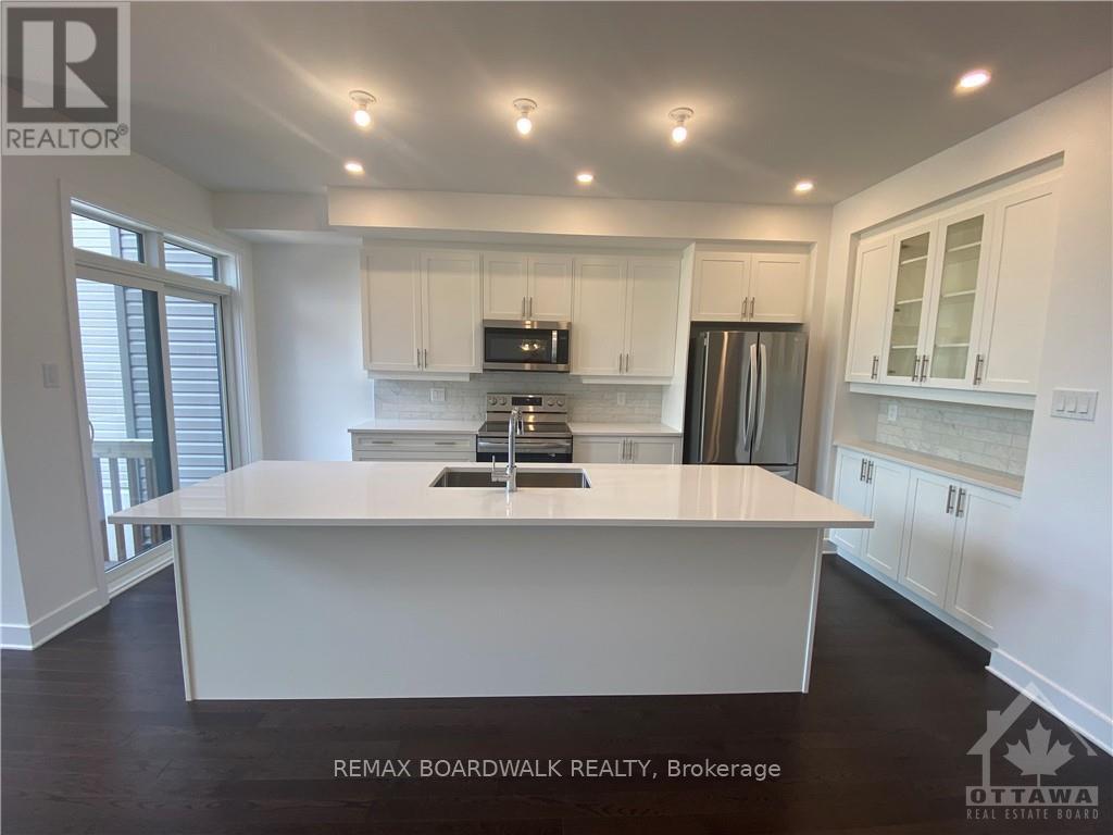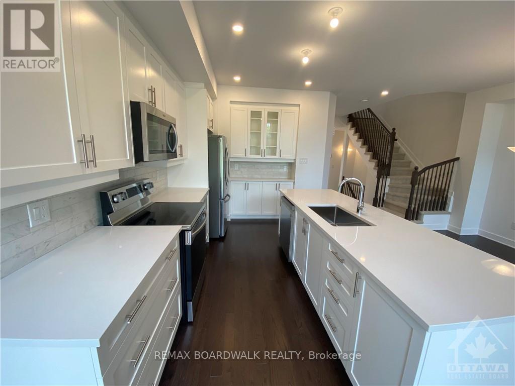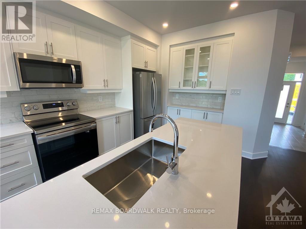 FOR RENT - Urbandale Galileo Model townhome ideally located in Kemptville with quick access to Hwy 416 and nearby amenities. The main floor features a bright open-concept layout with a modern kitchen, dining area, and family room complete with hardwood floors and a cozy natural gas fireplace. Upstairs offers 3 bedrooms, 2 full bathrooms, and convenient second-floor laundry, including a spacious primary suite with walk-in closet and ensuite featuring a separate tub and shower. The finished basement provides additional living space with a rec room and storage area. Includes all stainless steel appliances, automatic garage door opener, luxury cascade shades in the living room, and blackout roller shades in all bedrooms. No pets. No smoking. Currently tenant occupied; photos taken prior to tenancy. Rental application required with proof of income, credit check, ID, and references. Available June 1, 2026. (id:64974)