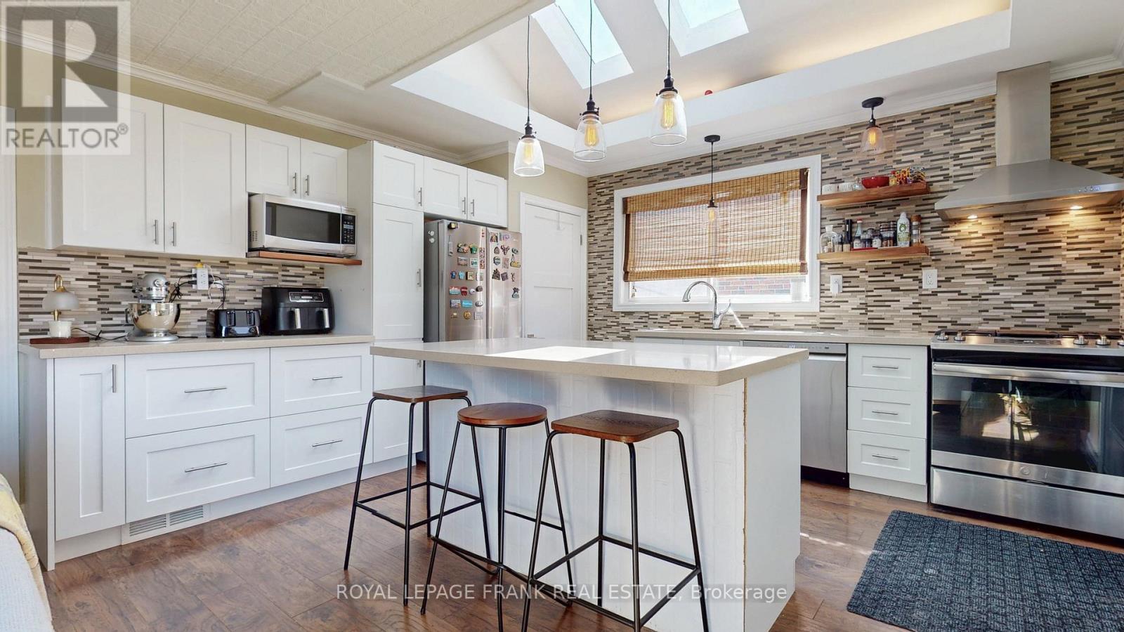 Unpack, relax... everything has been done for you. This superbly upgraded home will impress you with the quality of upgrades it contains. Enter into the sun drenched home highlighted by two airy skylights and vinyl windows. The modern kitchen has a sizable island, stainless appliances, range hood, quartz counters, and pantry, sure to delight your inner chef. The living room comes equipped with a tv console and TV wall mount. The primary bedroom enjoys a wonderful wall treatment and the second bedroom with a walk-out to the deck also includes the very smart feature of a Murphy's bed. The main bath has a stunning walk in glass shower and modern vanity. Downstairs with it's private side entrance is a perfect space for the inlaws or adult children returning to the nest. The entire home has been professionally painted in '25. The exterior features new modern siding, soffits, eaves and fascia, 2 sizable new decks (14'x14') &(8'x20') with wrought iron railings that adds incredible outdoor living space to this home. Fully fenced '20, with a double wide gate that allows access to the garage and additional parking. The garage itself is a gentleman's dream! Built in 2023, it measures 28' x 18' with 10' ceilings and an 8'x9' insulated door. It will function well for woodworkers, car enthusiasts, even a home office as it has heat, a/c, 100 amp service, storage cupboards, separate side door, fan & LED lighting. The insulated walls, finished in shiplap make for a very comfortable workspace. Outside, continues to offer features such as 2 exterior doors replaced in '19, 4x6 storage shed, a driveway that parks 4 vehicles, roof shingles '17. Furnace & central air '17. Upgraded insulation. Show it before it's gone!! (id:64974)