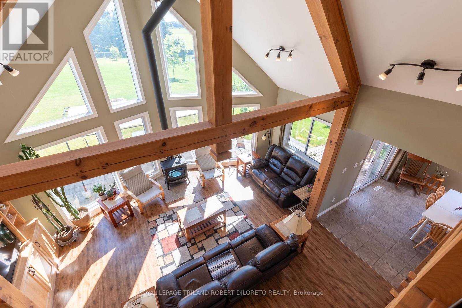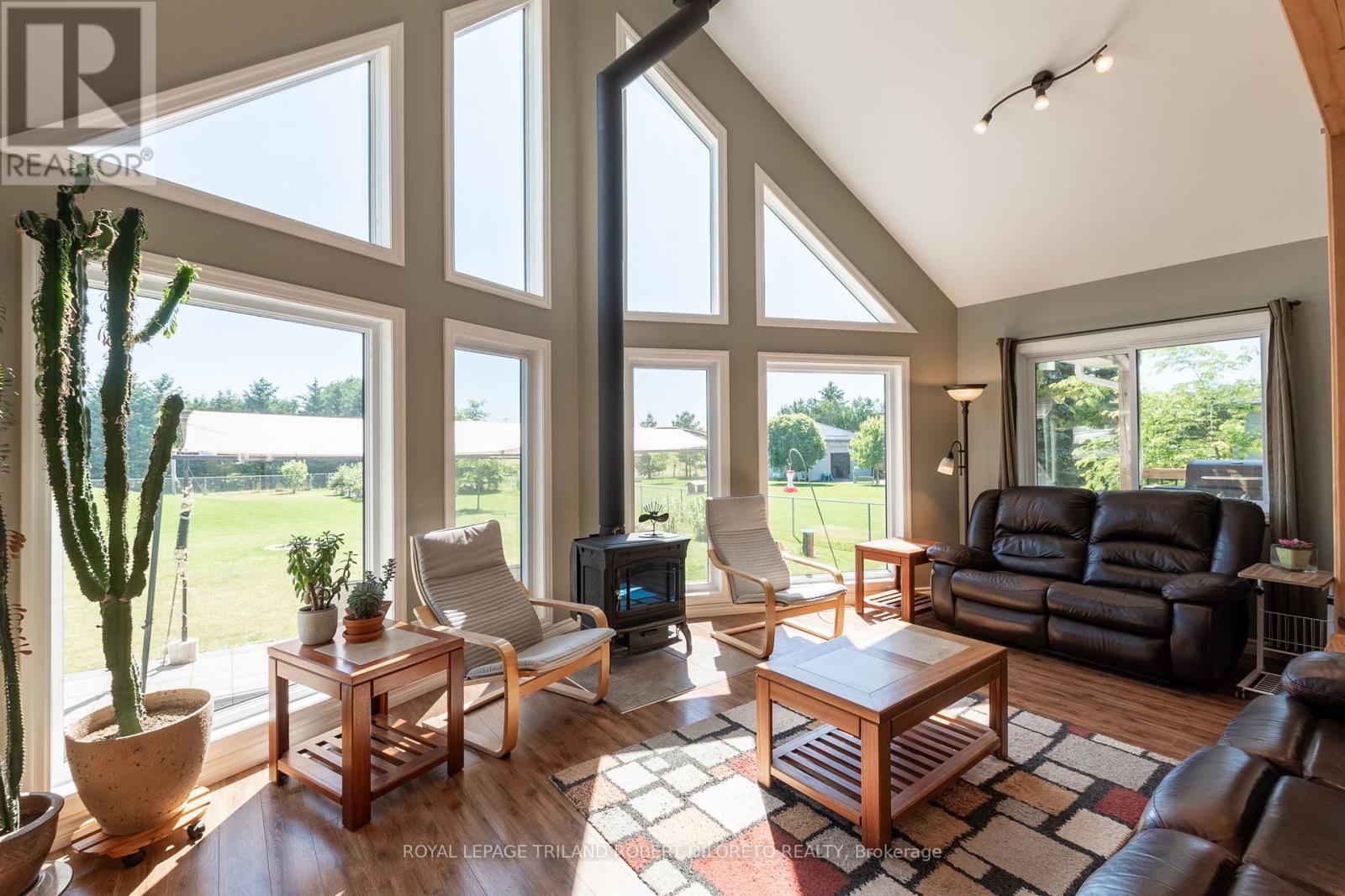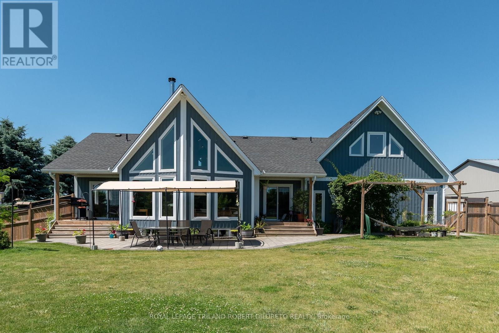 Beautiful custom built residence One floor home with oversized double attached garage on almost 3/4 ACRE lot surrounded by picturesque countryside in hamlet of Bryanston north of London. This amazing home is ideal for home based business w/bonus 2nd floor loft and office area with private exterior access + huge 26'8"X24"11" garage/workshop complete w/heat, hydro, water, AC + separate storage! Custom built in 2017 by the current owner, this amazing home boasts elegant curb appeal and craftsman-inspired front elevation w/stone accents, landscaping and large multi-car driveway; the light filled & carpet free open concept interior boasts dramatic 2-storey great room with wall of windows, vaulted ceiling with solid wood post & beam construction, WETT certified wood stove, custom built-in cabinets with concealed convenient wood box accessed by rear deck; entertainment sized open plan dining area and kitchen features access to covered deck from dining area, all custom built cabinetry, Corian counters, island w/seating, stainless steel appliances including gas stove; main floor primary bedroom with walk-in closet, access to private covered deck & luxurious ensuite; powder room privileges; main floor laundry/mudroom with washer & gas dryer; fully finished lower level features 2 additional bedrooms with oversized windows; family room with custom built-ins including convenient hand crafted "wall bed" for guests, 4pc bath, loads of storage and delightful reading alcove beneath the stairs; the unique design of the upper level loft boasts lounge area, large office & 2pc washroom -- is perfect for home office/business or separate in-law / guest suite. The fully fenced exterior is simply breathtaking and manicured to perfection with loads of grass space, large patio & thoughtfully situated septic system conveniently oriented on the north side of the yard to allow for plenty of space for future pool! Added features: 260ft deep dug well by Hayden Water Wells, owned hot water tan (id:64974)