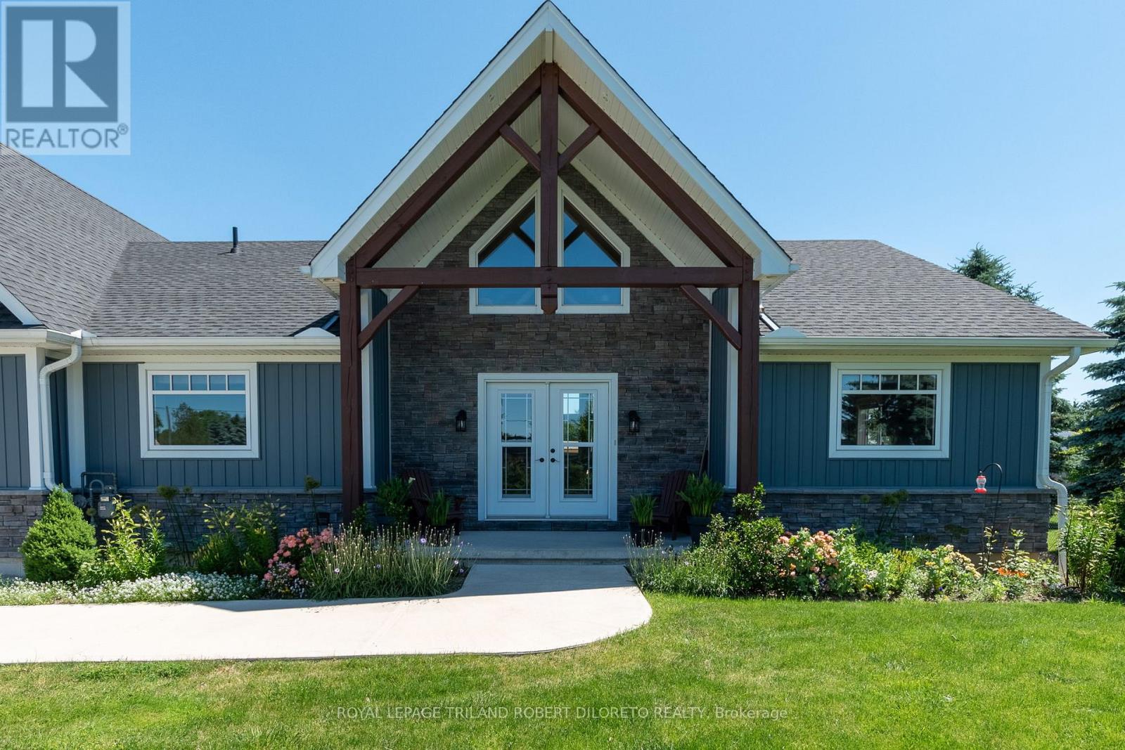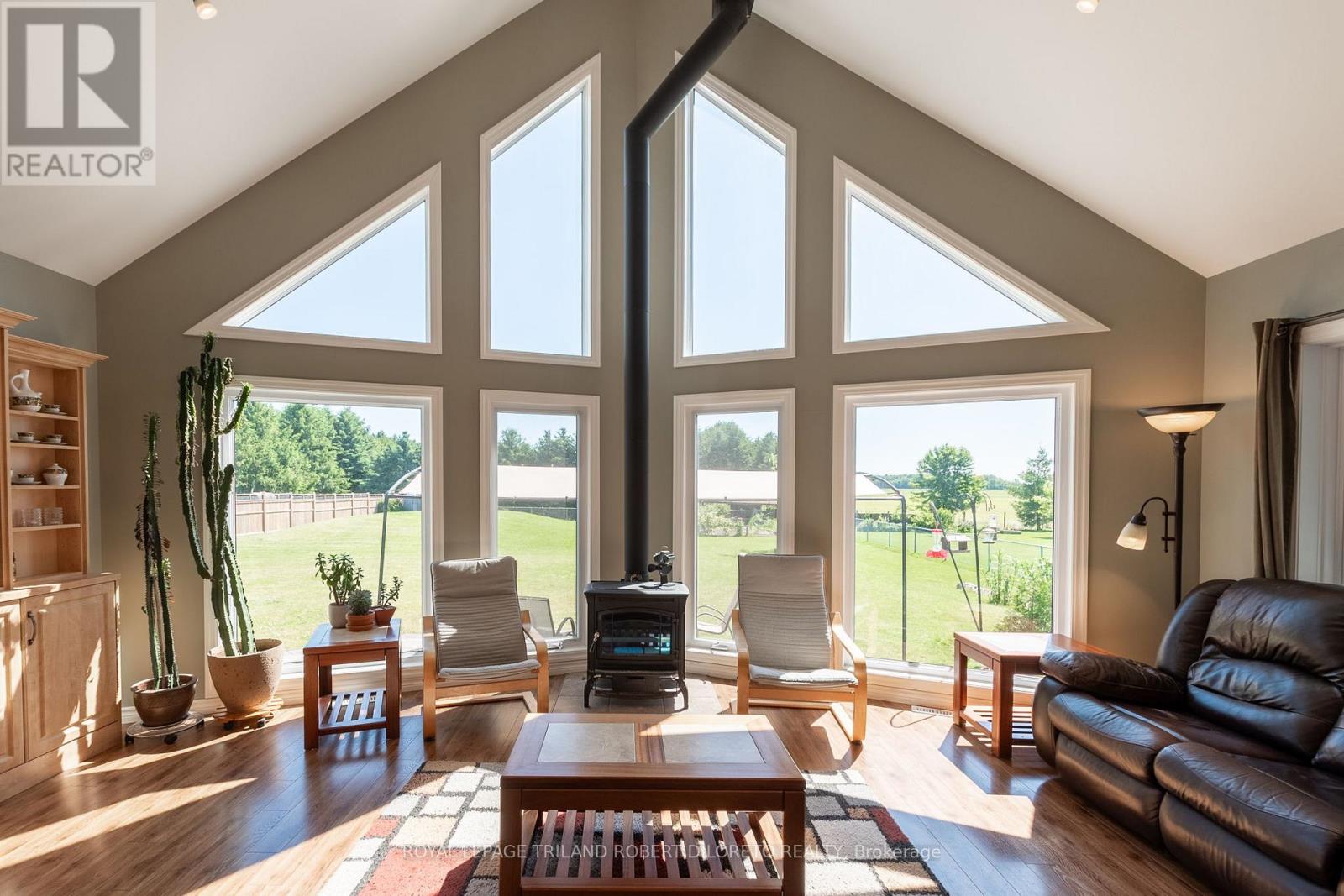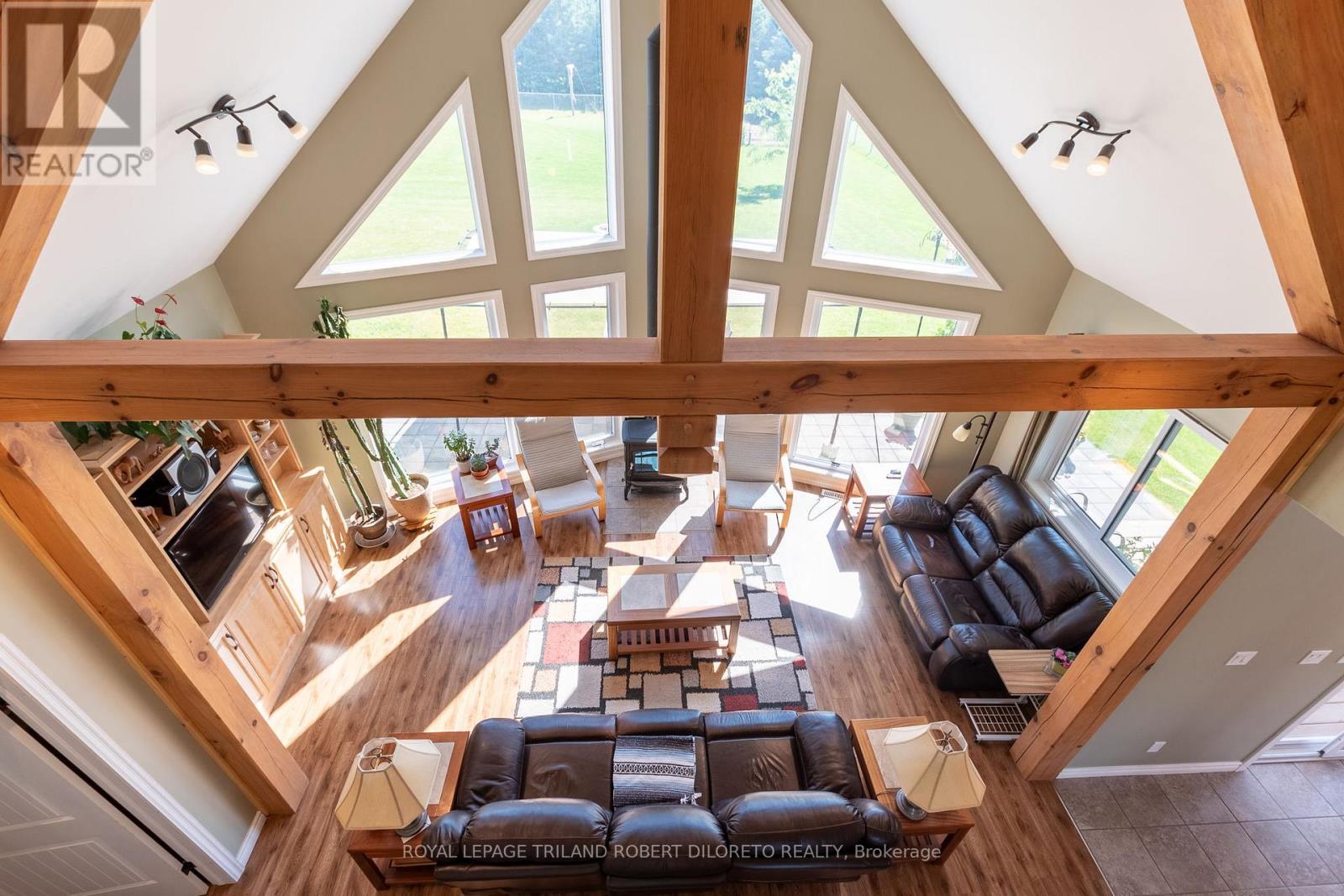 Beautiful custom built residence One floor home with oversized double attached garage on almost 3/4 ACRE lot surrounded by picturesque countryside in hamlet of Bryanston north of London. This amazing home is ideal for home based business w/bonus 2nd floor loft and office area with private exterior access + huge 26'8"X24"11" garage/workshop complete w/heat, hydro, water, AC + separate storage! Custom built in 2017 by the current owner, this amazing home boasts elegant curb appeal and craftsman-inspired front elevation w/stone accents, landscaping and large multi-car driveway; the light filled & carpet free open concept interior boasts dramatic 2-storey great room with wall of windows, vaulted ceiling with solid wood post & beam construction, WETT certified wood stove, custom built-in cabinets with concealed convenient wood box accessed by rear deck; entertainment sized open plan dining area and kitchen features access to covered deck from dining area, all custom built cabinetry, Corian counters, island w/seating, stainless steel appliances including gas stove; main floor primary bedroom with walk-in closet, access to private covered deck & luxurious ensuite; powder room privileges; main floor laundry/mudroom with washer & gas dryer; fully finished lower level features 2 additional bedrooms with oversized windows; family room with custom built-ins including convenient hand crafted "wall bed" for guests, 4pc bath, loads of storage and delightful reading alcove beneath the stairs; the unique design of the upper level loft boasts lounge area, large office & 2pc washroom -- is perfect for home office/business or separate in-law / guest suite. The fully fenced exterior is simply breathtaking and manicured to perfection with loads of grass space, large patio & thoughtfully situated septic system conveniently oriented on the north side of the yard to allow for plenty of space for future pool! Added features: 260ft deep dug well by Hayden Water Wells, owned hot water tan (id:64974)