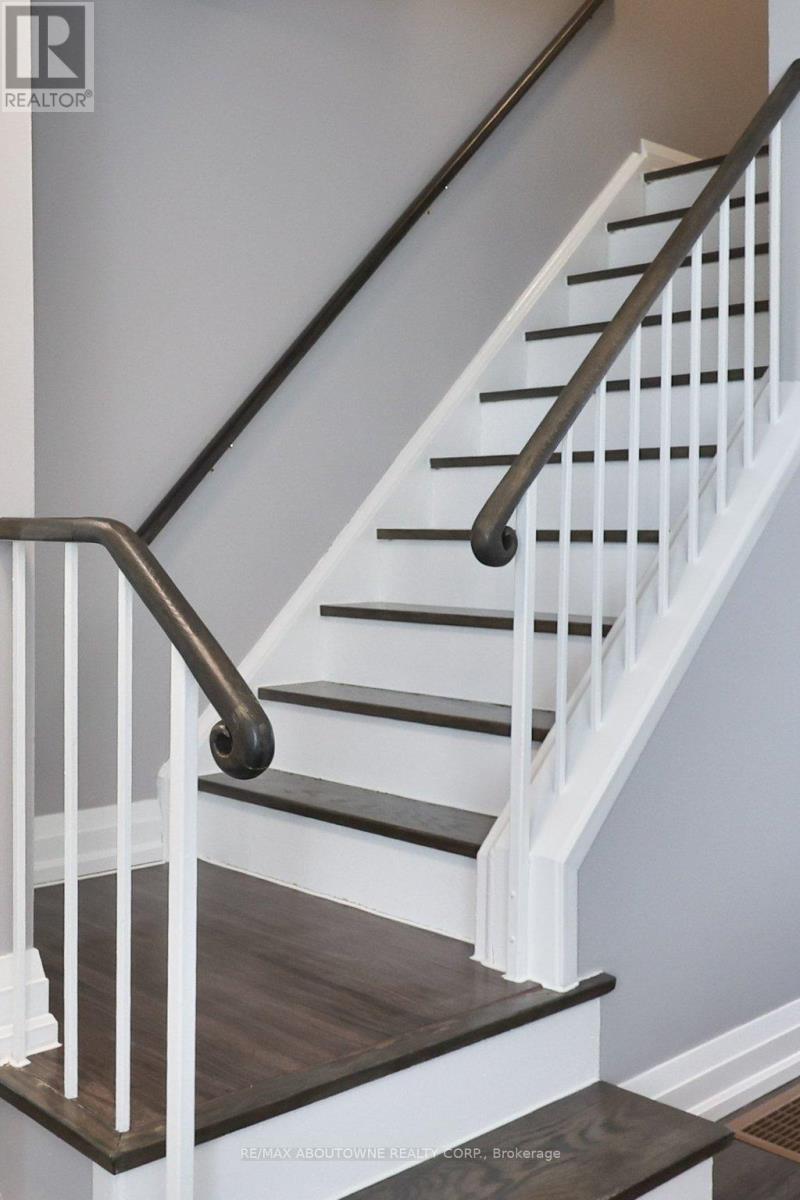 Beautifully renovated with a true open plan design, this 3 bedroom townhome in desirable College Park offers a rare sense of space, light and everyday livability. The main level has been fully opened to create a seamless flow between kitchen, dining and living areas, with extended sightlines that enhance both light and volume. A walkout from the dining area leads to a private rear garden backing onto green space, offering a quiet setting well removed from Upper Middle Road. The updated kitchen features shaker style cabinetry, stainless steel appliances, subway tile backsplash and ample counter space, directly connected to the dining area for everyday ease. The living room is notably wide and well proportioned, with a large front window that fills the space with natural light and reinforces the open feel of the home. Updated flooring, trim and interior doors add to the clean, cohesive finish throughout. Upstairs, three well sized bedrooms offer comfortable accommodation for families, guests or a home office, including a spacious primary bedroom with excellent proportions, complemented by an updated main bathroom. The finished lower level adds meaningful additional living space with a large recreation room, a renovated 3 piece bathroom, laundry and storage. A significant upgrade includes conversion from electric baseboard heating to gas forced air with central air conditioning, along with updated windows, providing improved comfort and efficiency throughout the year. One covered parking space under carport plus ample visitor parking. Quiet, predominantly owner occupied complex within walking distance to schools, parks, trails, Sheridan College, shopping and transit, with easy access to major highways. A move in ready home offering exceptional space, upgrades and overall livability. (id:64974)