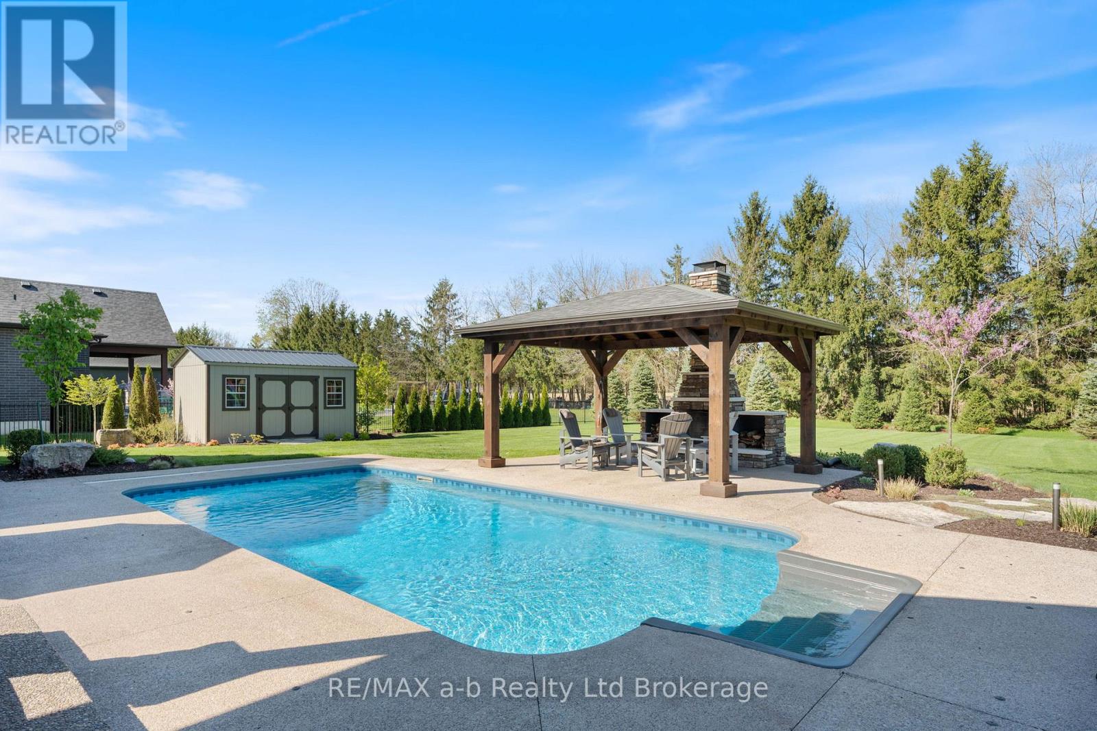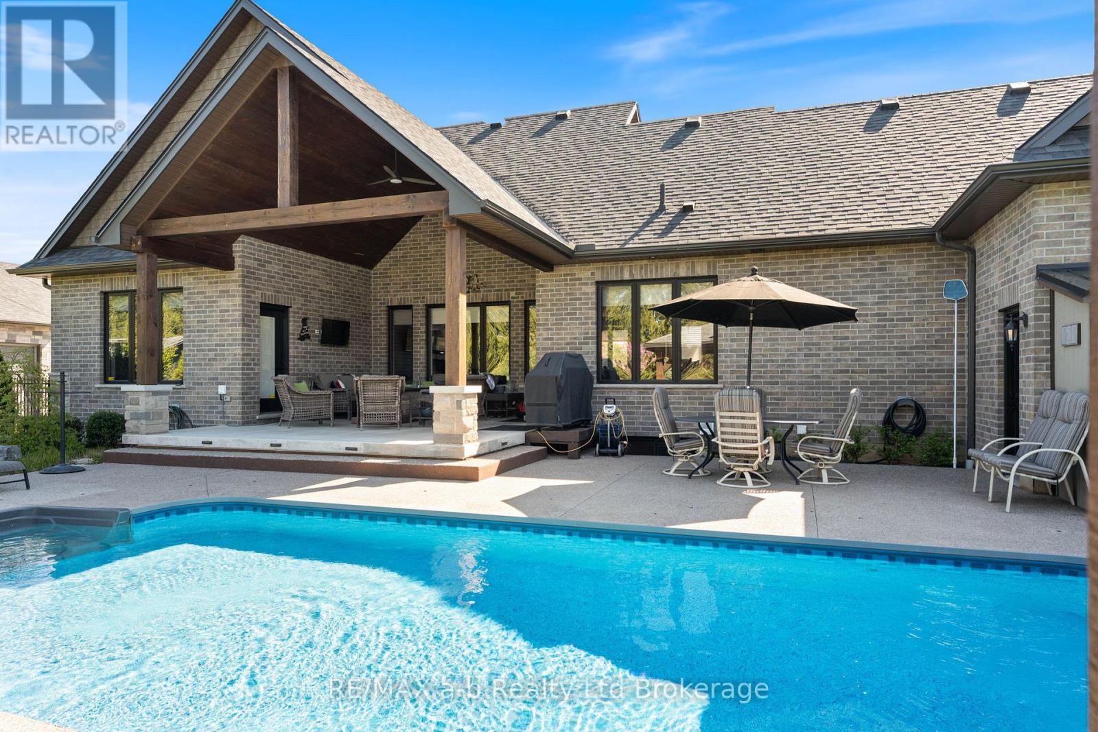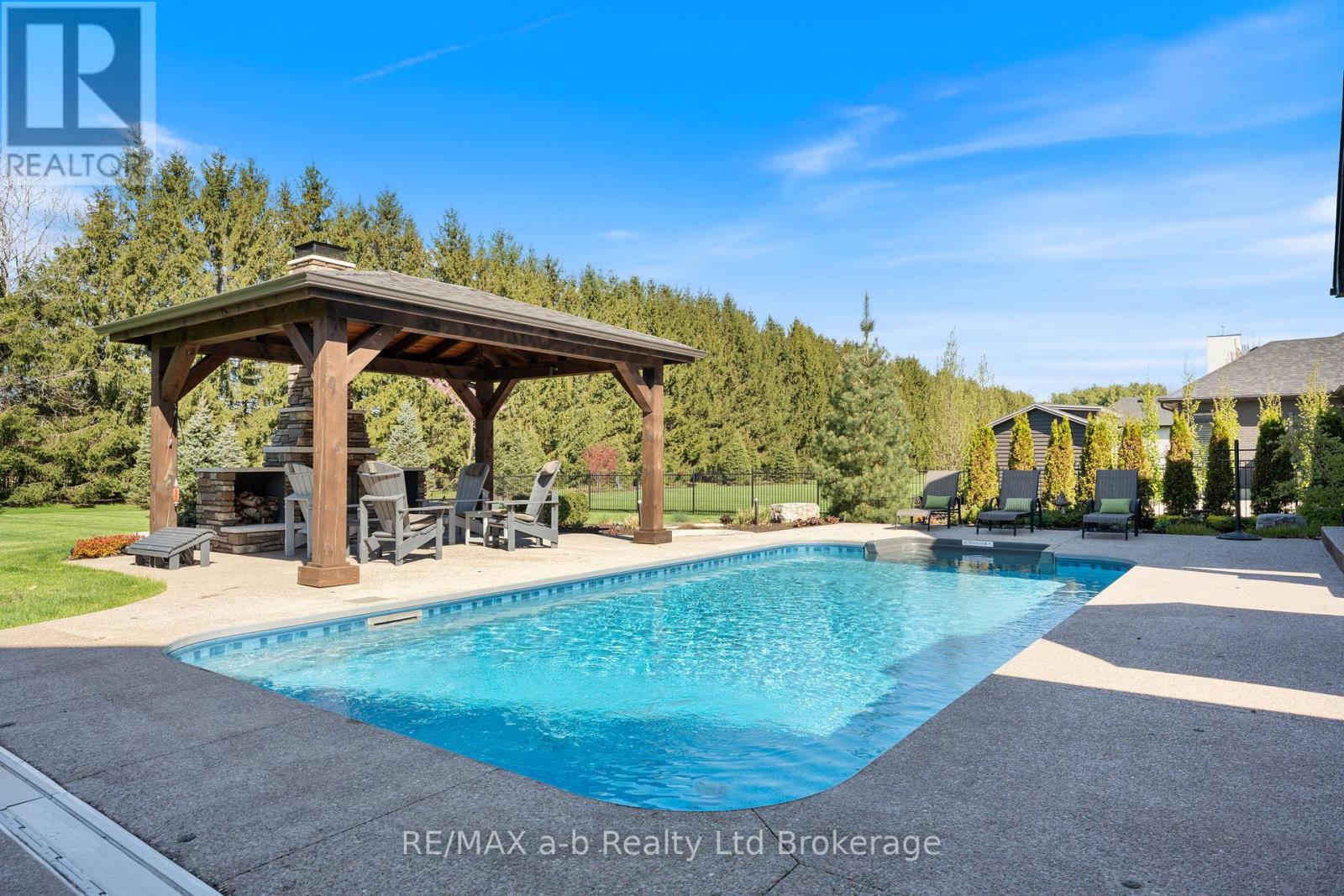 Absolute perfection inside and out, welcome to 23 August Crescent in Otterville! A quiet Crescent of Executive homes in a quaint town, hosts this stunning ranch with beautiful stone detail, indoor parking for up to 4 vehicles and a luxurious dream backyard. The lavish backyard is fully fenced with iron for expansive views with fields beyond, an in-ground heated salt-water pool with coordinating Timber cabana featuring a stunning wood burning fireplace, as well as a beautiful covered rear porch with timber accents this backyard is an entertainers dream. There is extensive hardscape, lush landscaping with accent lighting and mature trees creating a scenic view from every window. This quality built home has been impeccably cared for with approximately 3,500 sq.ft. of total finished living space, offering 4 bedrooms, 3.5 bathrooms and excellent space for entertaining, an custom kitchen with walk-in pantry, quartz countertops and a stunning gas fireplace. The basement features a second entrance, ideal for an in-law suite, it has a kitchenette/ bar, large open space suitable for games area and family room, an office space, plus the 2 lower level bedrooms and full bathroom. The property is .7 of an acre, the huge attached garage has a finished loft currently used as a recroom. The home features a security system, stand-by generator, it is on Municipal water but also has a drilled well for outdoor watering and sprinkler system. Make 23 August Crescent in Otterville your dream come true. (id:64974)