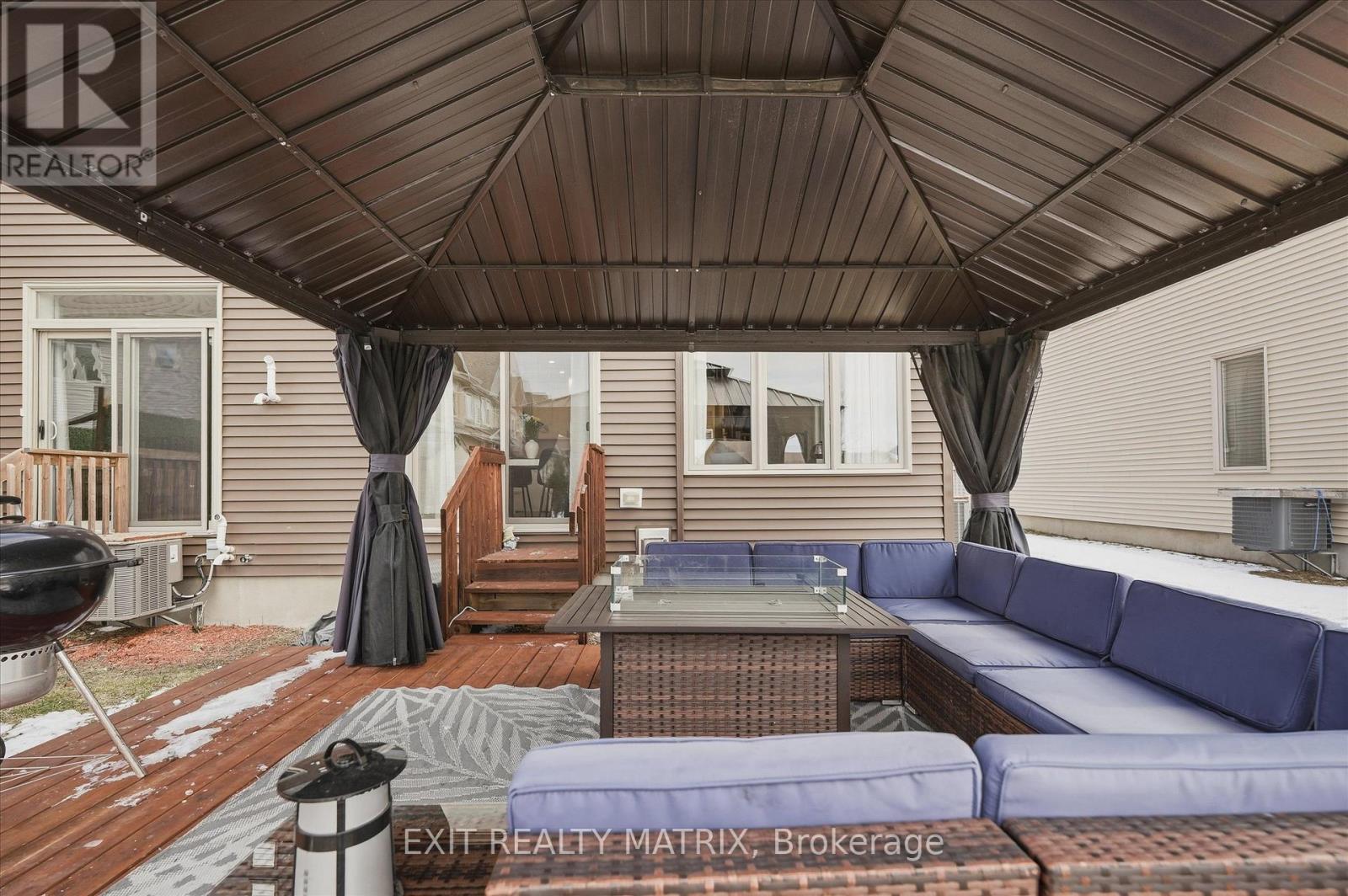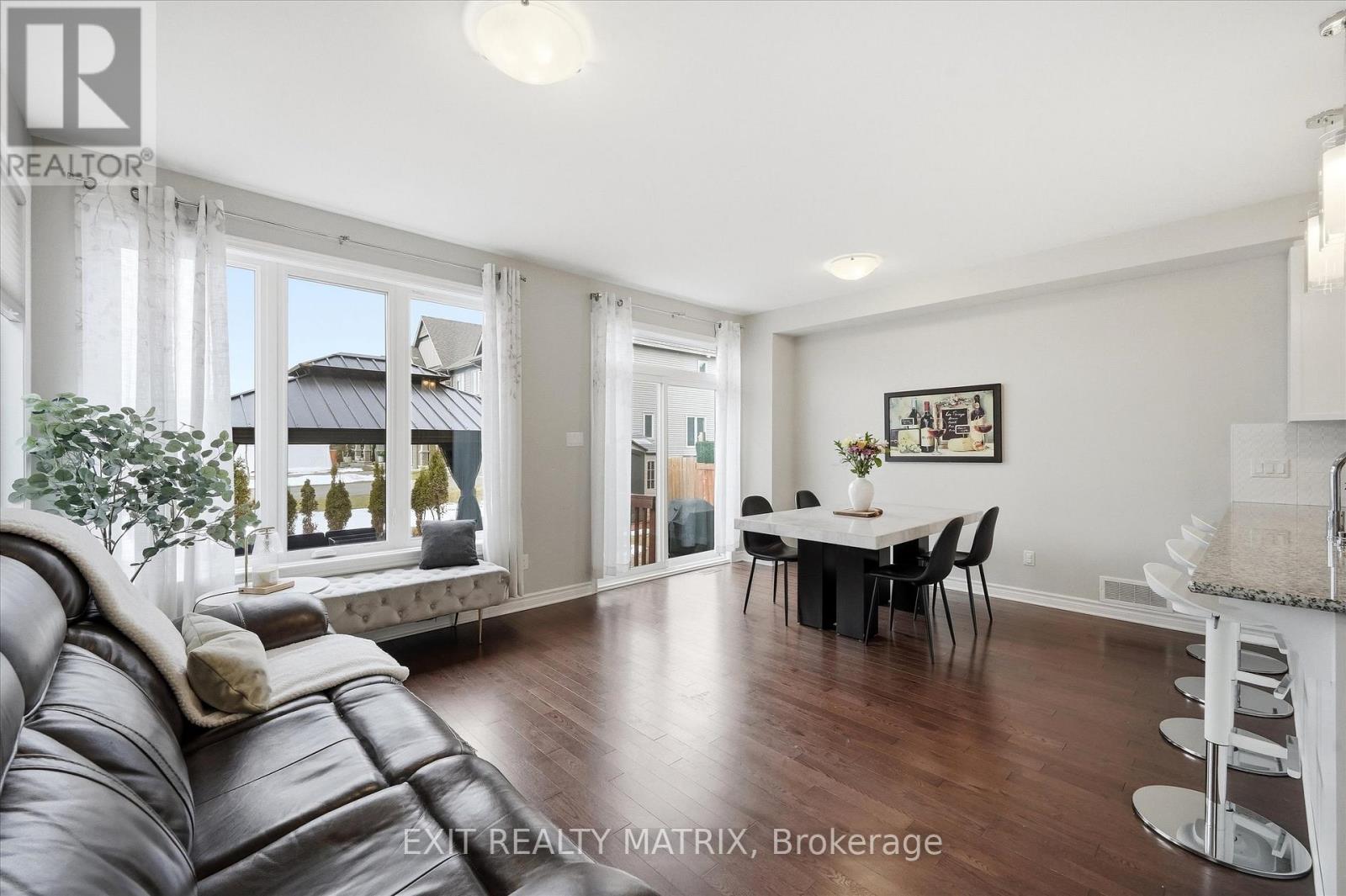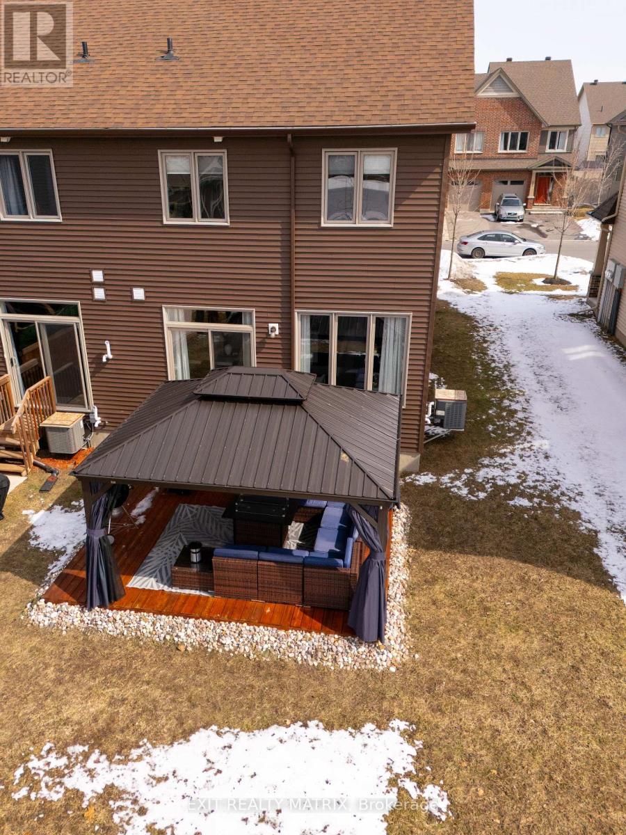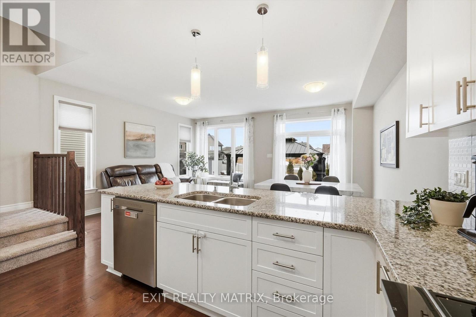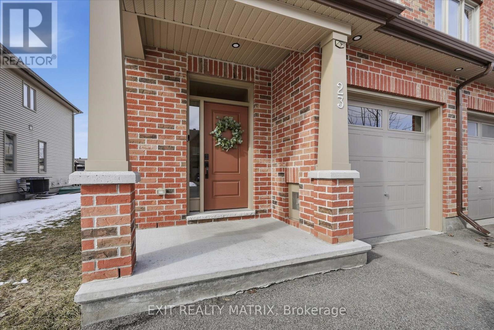 OPEN HOUSE SUNDAY APR. 12TH, 1-3 PM. Welcome to 23 Duncanville St., ideally situated in the heart of the village of Russell. This charming 3-bedroom end-unit home is filled with natural light, thanks to its many large windows. Upon entry, you're greeted by a spacious foyer that leads into a bright, open-concept main floor. The functional kitchen features an oversized island, ample cabinetry, and generous counter space-perfect for both everyday living and entertaining. The dining and living areas flow seamlessly, with patio doors opening to a deck and gazebo. A convenient powder room completes the main level. Upstairs, you'll find three well-sized bedrooms, including a large primary suite with a walk-in closet and a private ensuite featuring a glass shower. A full bathroom and second-floor laundry add to the home's practicality. The finished lower level offers additional living space with a cozy gas fireplace, plenty of storage, and a rough-in for a future bathroom. The double-wide laneway accommodates up to four vehicles. Enjoy being just a short walk from the pond and take in the area's beautiful sunsets. Located in a desirable neighbourhood steps to the 10 km paved New York Central Recreational Trail, Russell Fair Grounds, arena, four schools, library, conservation area, sports dome, restaurant, cafe and more. New amenities coming soon include the Russell Recreation Complex with 3 ice rinks, a 25-meter indoor pool, plus The Russell Station Trail / Eadie Park incl. a tennis and pickleball courts, splash pad and play structure (fall 2026). Book your viewing today! (id:64974)