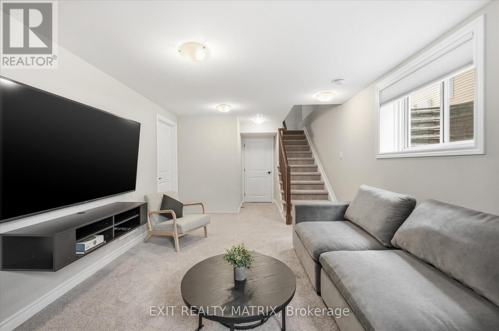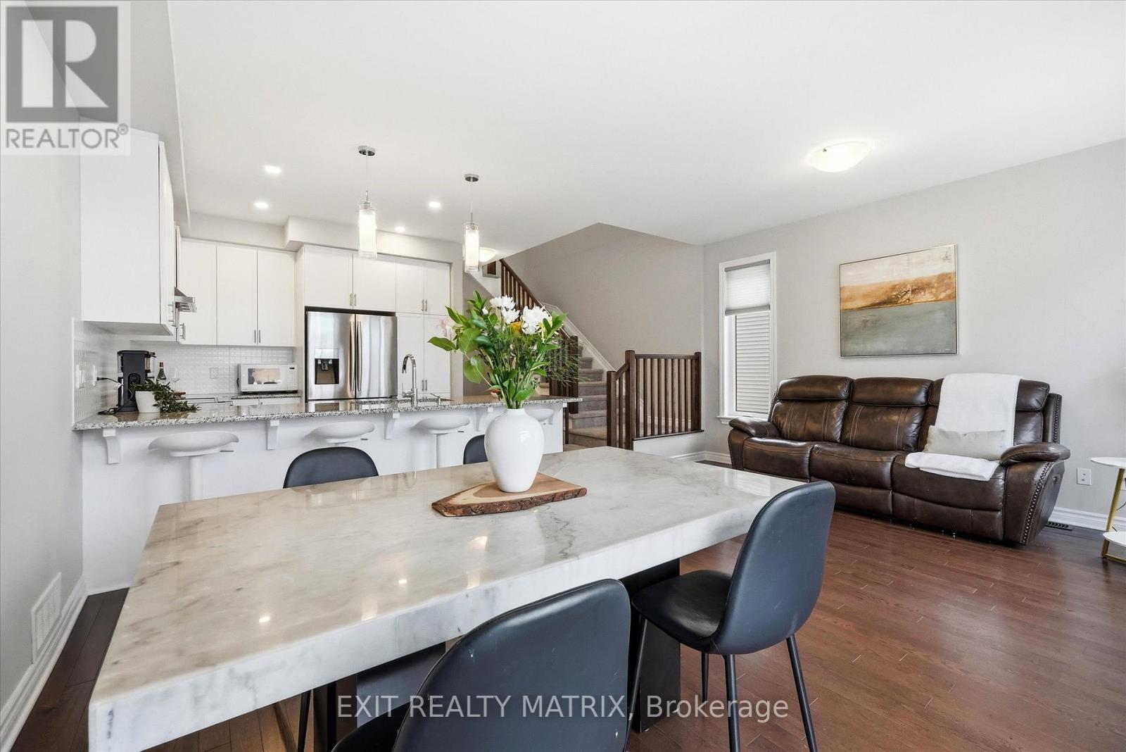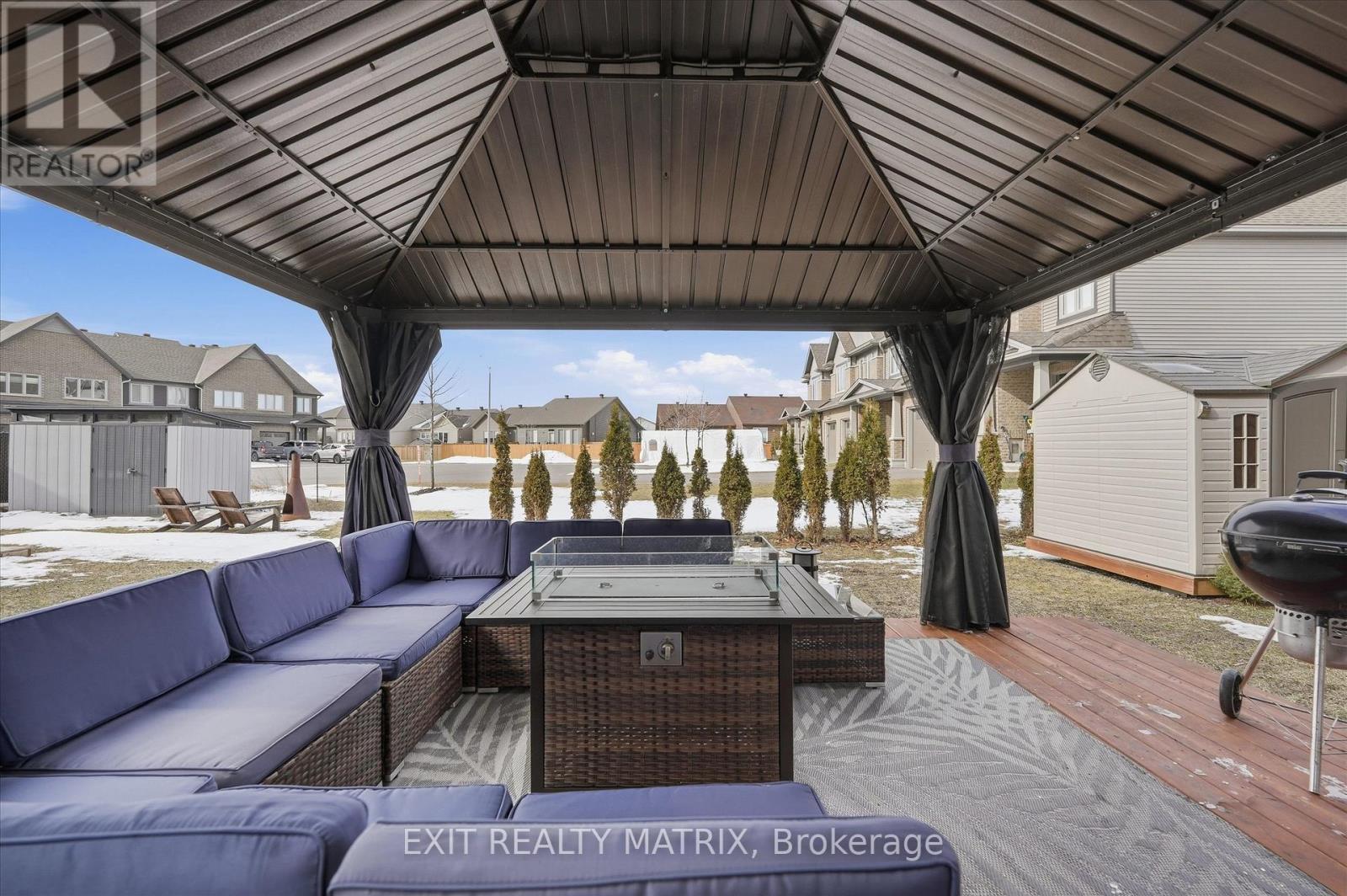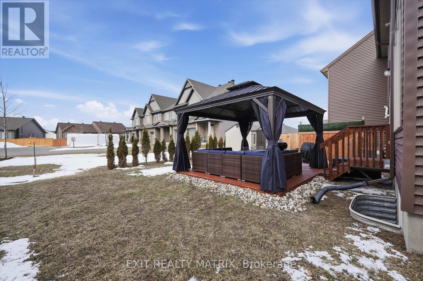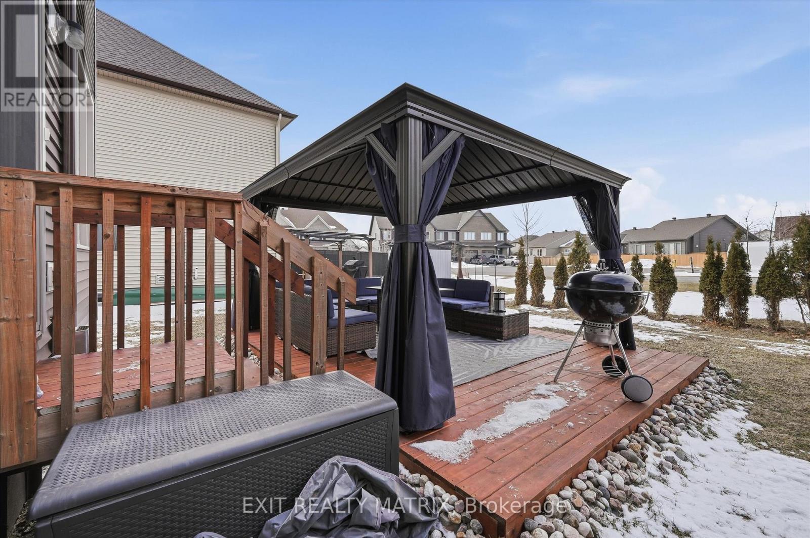 OPEN HOUSE SUNDAY APR. 12TH, 1-3 PM. Welcome to 23 Duncanville St., ideally situated in the heart of the village of Russell. This charming 3-bedroom end-unit home is filled with natural light, thanks to its many large windows. Upon entry, you're greeted by a spacious foyer that leads into a bright, open-concept main floor. The functional kitchen features an oversized island, ample cabinetry, and generous counter space-perfect for both everyday living and entertaining. The dining and living areas flow seamlessly, with patio doors opening to a deck and gazebo. A convenient powder room completes the main level. Upstairs, you'll find three well-sized bedrooms, including a large primary suite with a walk-in closet and a private ensuite featuring a glass shower. A full bathroom and second-floor laundry add to the home's practicality. The finished lower level offers additional living space with a cozy gas fireplace, plenty of storage, and a rough-in for a future bathroom. The double-wide laneway accommodates up to four vehicles. Enjoy being just a short walk from the pond and take in the area's beautiful sunsets. Located in a desirable neighbourhood steps to the 10 km paved New York Central Recreational Trail, Russell Fair Grounds, arena, four schools, library, conservation area, sports dome, restaurant, cafe and more. New amenities coming soon include the Russell Recreation Complex with 3 ice rinks, a 25-meter indoor pool, plus The Russell Station Trail / Eadie Park incl. a tennis and pickleball courts, splash pad and play structure (fall 2026). Book your viewing today! (id:64974)