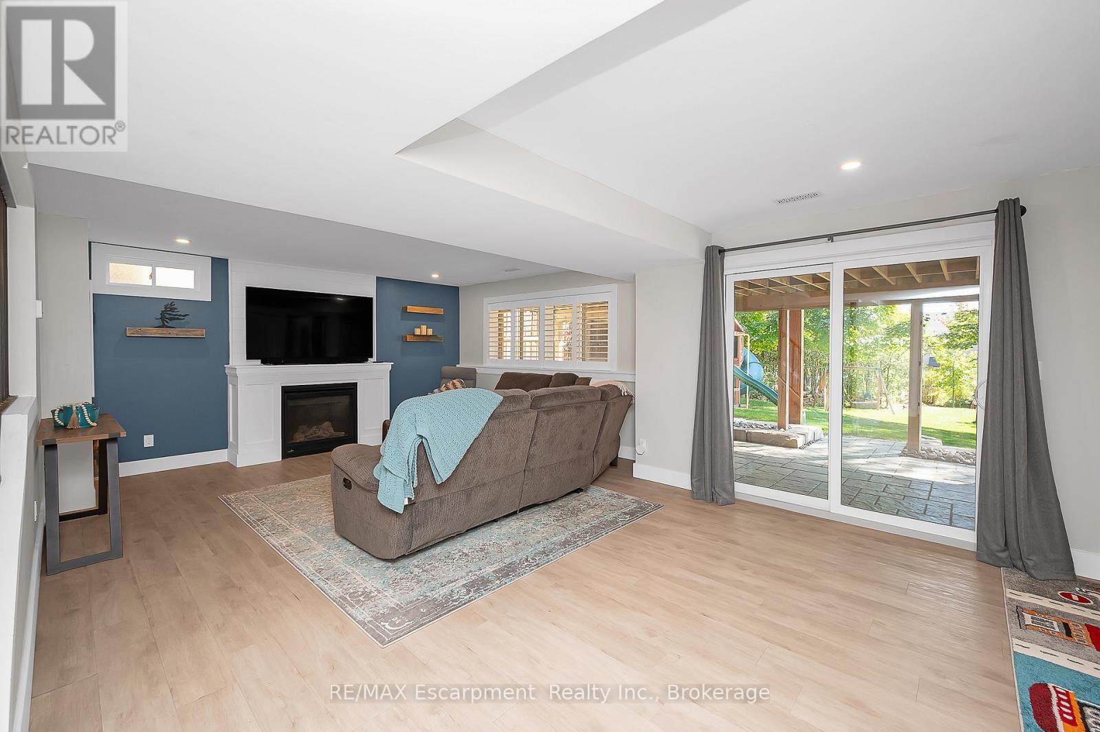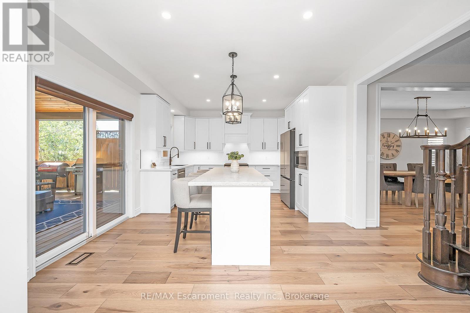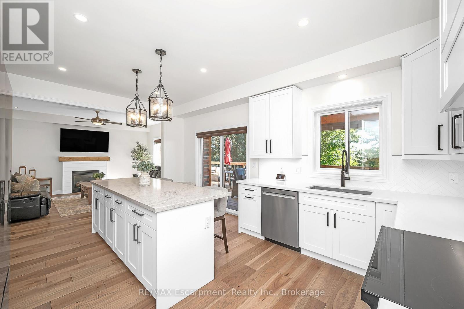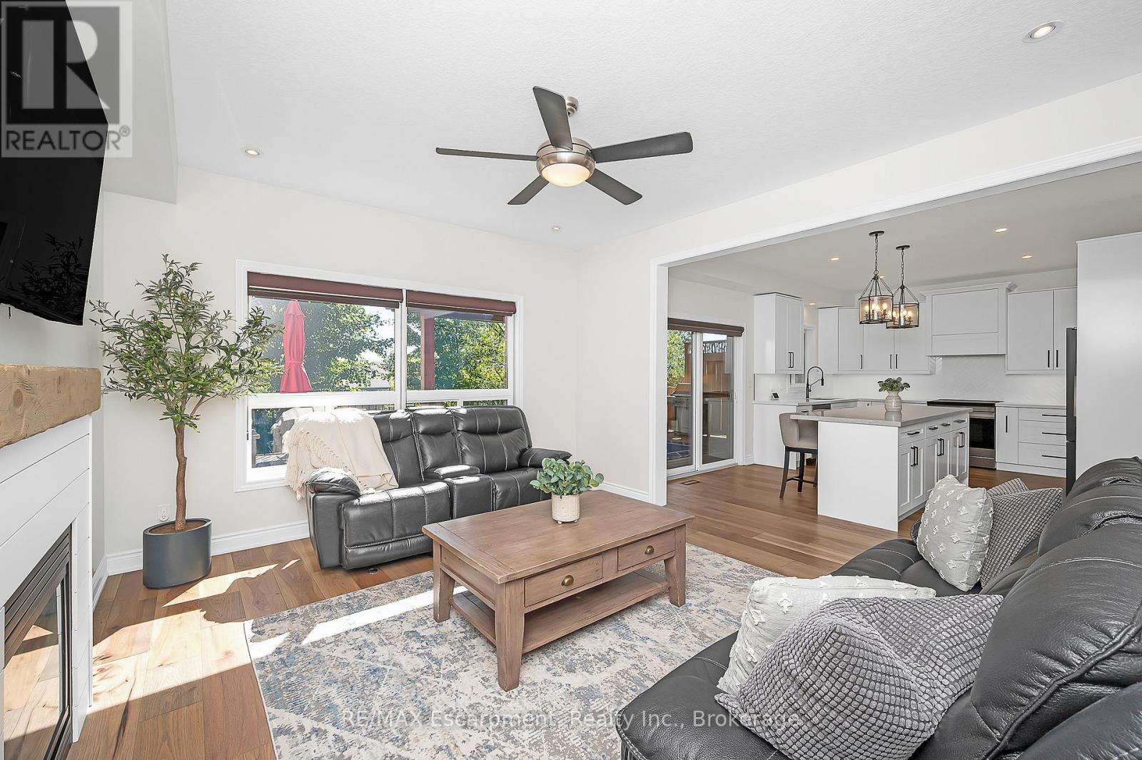 Welcome to this beautifully updated detached two-storey home in the heart of Ayr, the lot is nearly 200' deep and has a bright walk-out basement. With 4 bedrooms, 4 bathrooms, and extensive 2024 renovations, this home blends modern comfort with everyday functionality. The main level showcases a stunning transformation with engineered hardwood and tile flooring, a newly redesigned kitchen with cabinetry, coffee bar, and stainless steel appliances, plus a stylishly renovated powder room. The open-concept layout flows seamlessly from the dining room into the living room, where an oversized window and cozy fireplace create a warm and inviting atmosphere. A sliding door leads to the deck with a custom enclosure (2020)perfect for morning coffee or evening entertaining. Practical touches include a spacious laundry room and new front entry door (2024). Upstairs, the primary suite offers a large walk-in closet and a fully renovated spa-like ensuite (2024) with double vanity, stand alone tub and glass shower. Three additional bedrooms and a refreshed full bathroom provide space for family and guests. The fully finished walk-out basement adds even more living space, featuring an oversized recreation room with fireplace, a wet bar, a renovated full bathroom, and a dedicated home office (2024). Sliding doors open to a private patio, expanding your entertaining options. The backyard is truly exceptional, offering expansive green space for play, gardening, or future outdoor upgrades. Additional highlights include a heated and fully insulated garage, upgraded electrical panel (2024), soffits with switch-operated outlets for holiday lighting, and a reinforced, wired area ready for a hot tub. With its thoughtful upgrades, modern finishes, and an incredible lot, this Ayr home is move-in ready and designed for years of enjoyment. (id:64974)