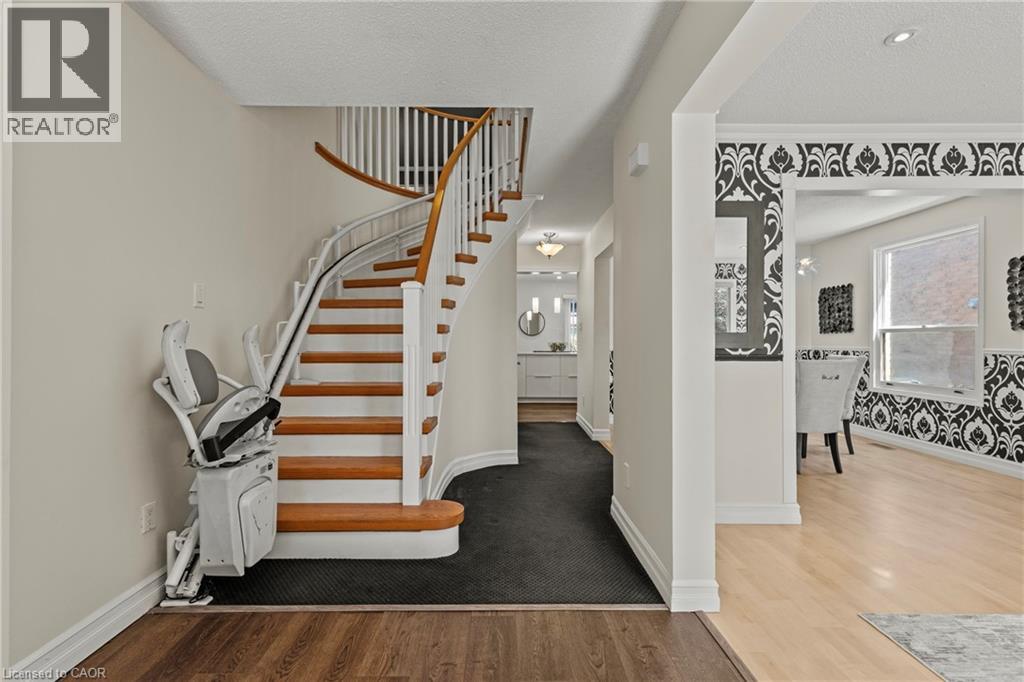 Make a splash this summer with your very own pool! Tucked away on a quiet court, this upgraded 4+1 bed, 3.5 bath, 2 storey home offers just over 2700 sqft of finished living space and many incredible features perfect for a growing family. The main level contains a welcoming foyer next to a joined living/dining room with large windows and an electric fireplace. Cook in this modern open concept kitchen (2016) with large island, stone countertops, tile backsplash, and built-in stainless steel appliances that overlooks a cozy sunken family room with a brick fireplace with gas insert. A laundry room with access to a powder room, garage, and side entrance rounds out the convenient main floor features. The second level contains 4 generous sized bedrooms with a modern main bathroom (2015) with glass shower and a huge primary bedroom with ensuite and large closets. The fully finished basement contains an exercise room, 5th bedroom, large rec-room, 3 piece bathroom (2022), and tons of storage. Step outside to a fully fenced yard containing a huge wooden deck surrounding an above ground pool (new liner 2024), perfect for relaxing in the sun or entertaining guests. The property offers unique accessibility features such as wheelchair accessible entryway and electric stair lift. Conveniently located near highway access, shopping (LimeRidge Mall), restaurants, and everyday amenities (Fortinos). Additional Upgrades: A/C (2023), Furnace (2020), Backflow Valve (2019), Roof (2018), Electrical Panel (2016), 2nd Floor Windows (2016). Won't last long! (id:64974)