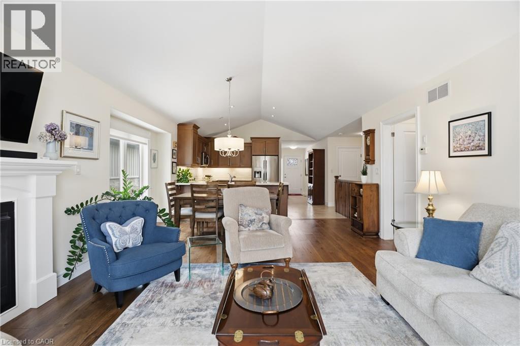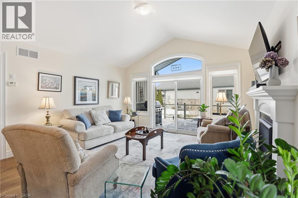 Beautifully maintained 2 bedroom, 1.5 bathroom semi-detached home located in a quiet enclave of Smithville. Built in 2018, this modern home offers 1,093 sq ft of thoughtfully designed living space, perfect for anyone seeking low-maintenance living in a growing community. Open concept main floor boasts a spacious living and dining area highlighted by a cozy gas fireplace. The kitchen flows seamlessly into the main living space, making entertaining effortless. A convenient powder room completes the main level. The generous primary bedroom includes a full 3 pc bathroom, offering comfortable and practical living space. Step outside to enjoy the private backyard featuring a walk-out to a 2 tiered patio with modern glass railings. Ideal space for summer barbecues or morning coffee. The unfinished basement provides excellent potential for future expansion, whether you envision a rec room, home office, or additional bedroom space. Low monthly fees that cover lawn maintenance, snow removal and Lawn sprinkler. This is one to see! (id:64974)