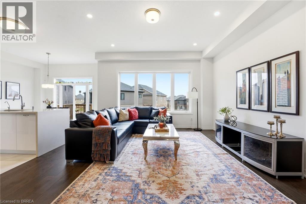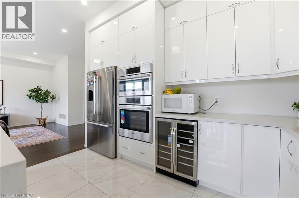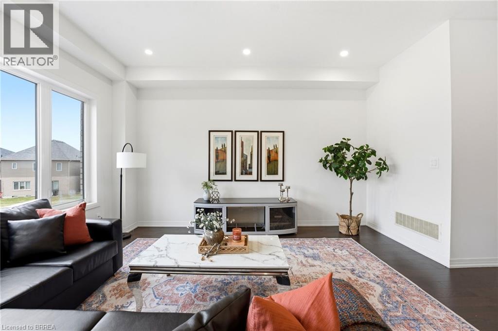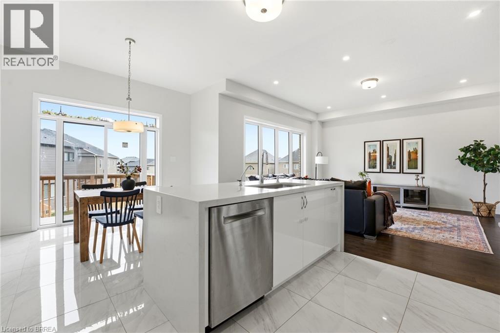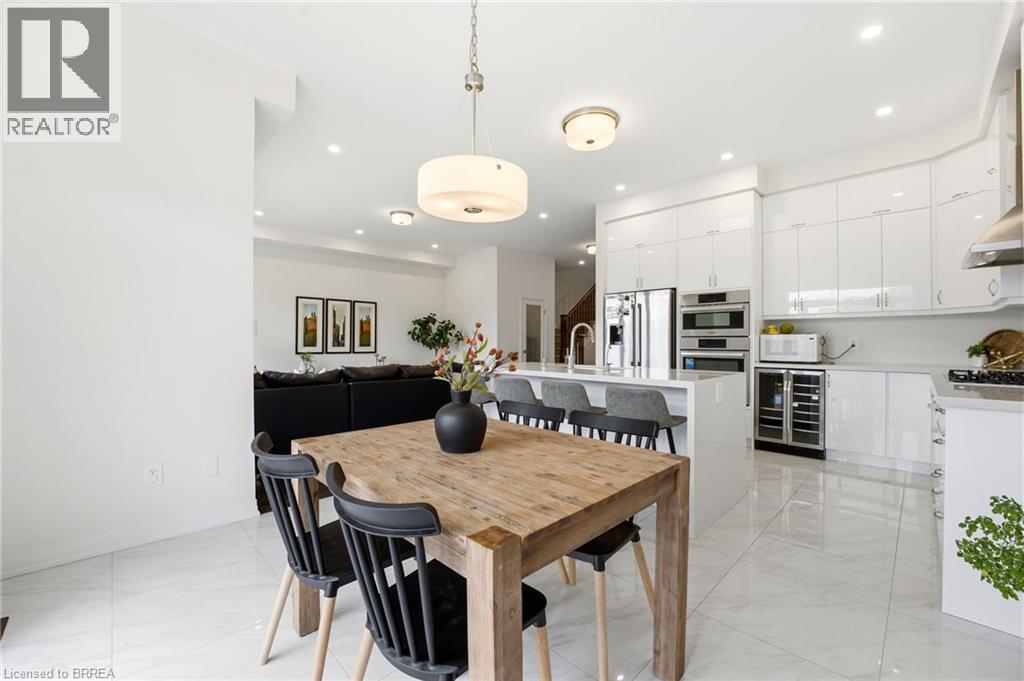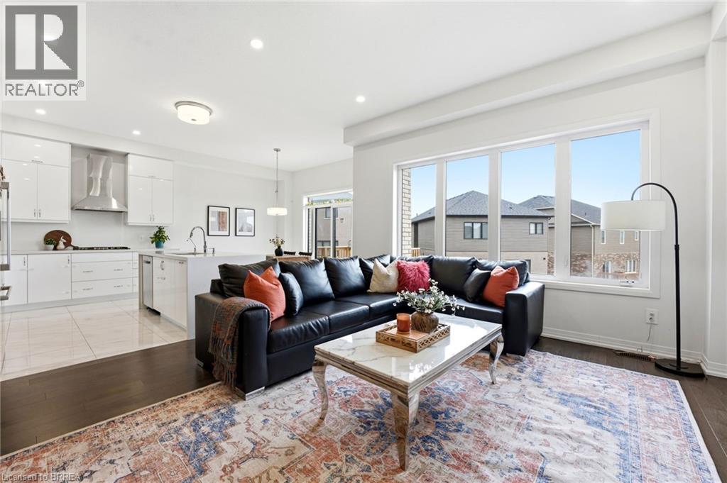Welcome to this stunning 2-storey home set on an oversized pie-shaped lot, just 2 years new and offering peace of mind with 5 years remaining on the Tarion warranty. Thoughtfully designed, the main floor welcomes you with a convenient 2-piece bath and direct access to the garage just inside the front entrance. Enjoy a bright, open-concept layout featuring a spacious kitchen and living room, complemented by a formal dining area. Large windows flood the space with natural light, highlighting the elegant California knockdown 10 ft. ceilings. The kitchen is a true showstopper with high-end Bosch appliances, including a gas cooktop, built-in wall oven and microwave, bar fridge, a large island with seating with a waterfall quartz countertop and walk-in pantry. Porcelain tile flooring completes the kitchen, while the living and dining rooms feature beautiful, engineered hardwood. Step out from the kitchen onto a private balcony—perfectly sized for your BBQ setup, complete with a gas hookup. Upstairs, you’ll find 4 generously sized bedrooms along with the convenience of upper-level laundry. The primary suite boasts a large 4-piece ensuite and 2 closets, while the second bedroom also enjoys its own private 4-piece ensuite. The remaining two bedrooms share a well-appointed 4-piece ensuite, ideal for family living. The unfinished lower level offers excellent potential and includes a walk-out to the backyard. Conveniently located just 5 minutes from downtown shops and restaurants, 2 minutes to Hwy 403, and within walking distance to the arena, this home combines comfort, style, and accessibility. (id:64974)