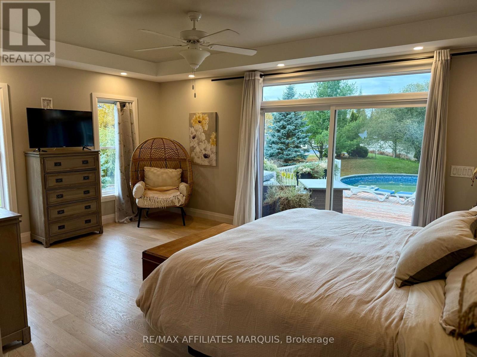 Striking modern home was custom built in a mature neighbourhood nestled into Lombard Glen Golf Course and surrounded by mature sugar maple trees. The light and airy living space blends seamlessly with the beauty of the outdoors with the elegance of well thought out interior design. Primary suite offers that "wow" factor with Italian Tile bathroom, sunsoaked walk in closest and garden doors that lead to a stunning pool and outdoor oasis area. The additional offset 2 bedrooms provide cozy retreats with walk-in closet and shared 4pc bathroom. The living room boasts 14' coffered ceilings, modern fireplace design and and opens onto spacious covered deck allowing you to feel one with nature. The kitchen is a delight with abundant cupboard and counter space perfect for hosting special dinners. The dining area, surrounded by pretty views on all sides is an idyllic setting for intimate gatherings. The large entrance foyer offers room to greet your guests while the bright office and laundry room with a feature wall make daily living a breeze. Add to that the bonus of a large above ground basement with ample windows for light and separate entrance and you could easily turn this home into one with an incredible in-law suite or income generating apartment. Basement is already partially drywalled and bathroom is roughed in ready for your own design downstairs. Woodstove added in 2023 for what could be a cosy reading nook in the basement alongside the large potential family room. Paved driveway with lots of parking, stamped concrete walkways, professionally hydroseeded yard, greenhouse, small orchard and raised bed gardens to enjoy. Pool, hot tub, hydrolink included. (id:64974)