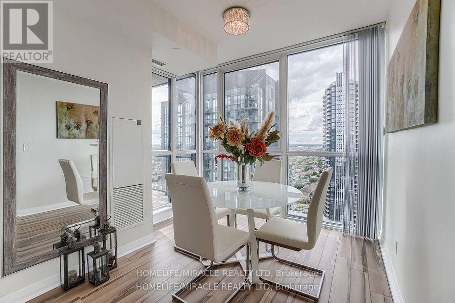 Welcome to this stunning 2,100 sq. ft. luxury corner penthouse, offering premium finishes and floor-to-ceiling windows that flood the space with natural light. With only four units on the floor, enjoy enhanced privacy and exclusivity. This spacious layout features 3 bedrooms plus a den and two full bathrooms. The open-concept living and dining area is surrounded by floor-to-ceiling windows, creating a bright and airy atmosphere. The generous primary bedroom includes a large walk-in closet, a 5-piece ensuite, and direct access to a private balcony. Enjoy top-tier building amenities including 24-hour security, a fully equipped gym, yoga studio, sauna, indoor swimming pool, and party room. Additional highlights include two large balconies, two parking spaces, and a spacious locker. Located in a prime area directly across from the new Hurontario LRT, this property offers excellent convenience and connectivity. The unit is currently leased for $5,000 per month, with a tenant willing to renew. (id:64974)