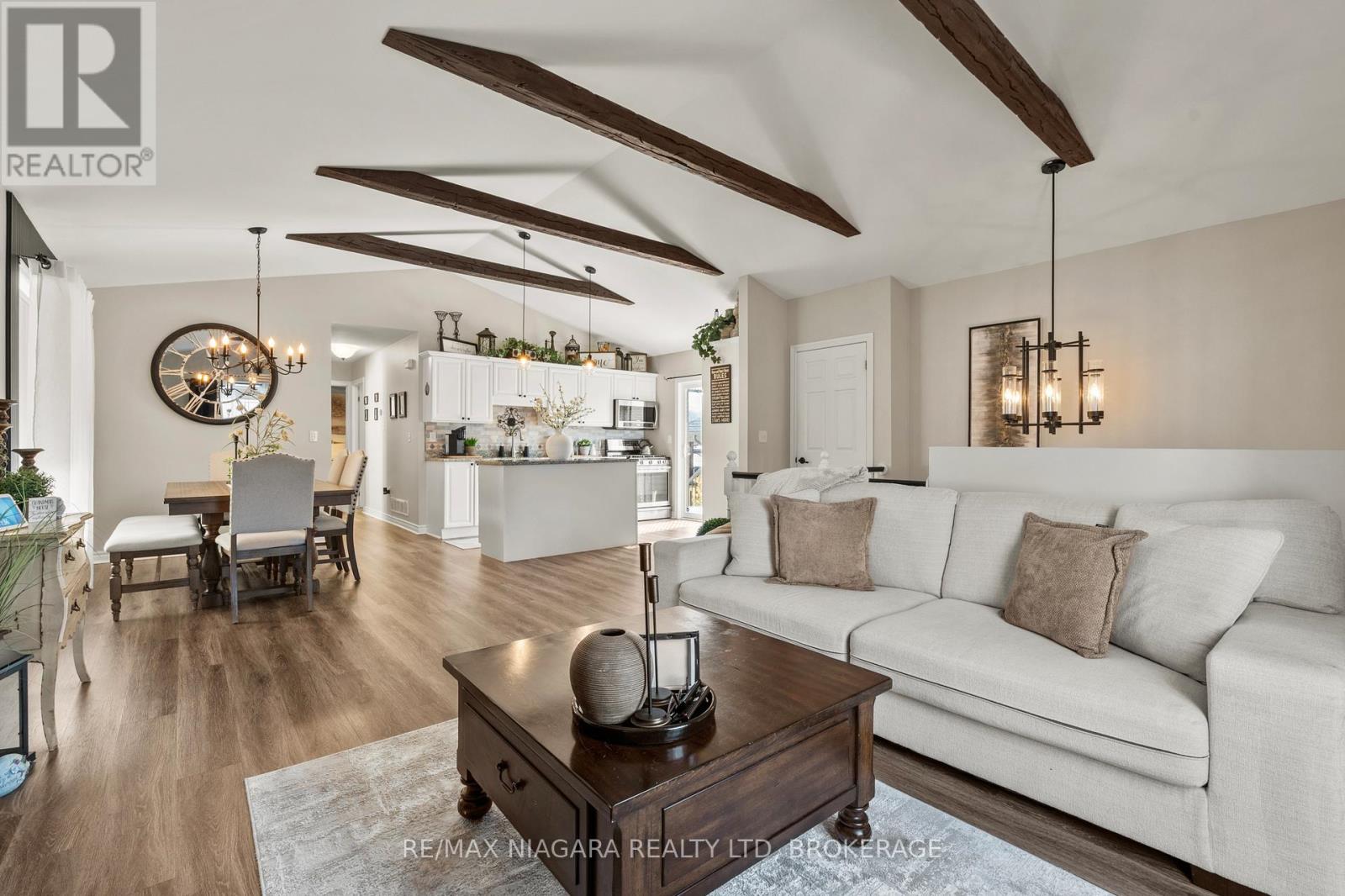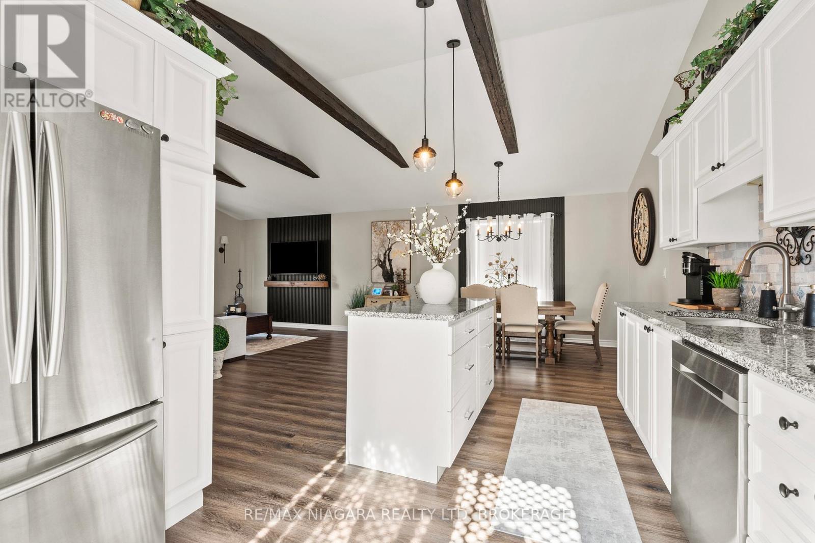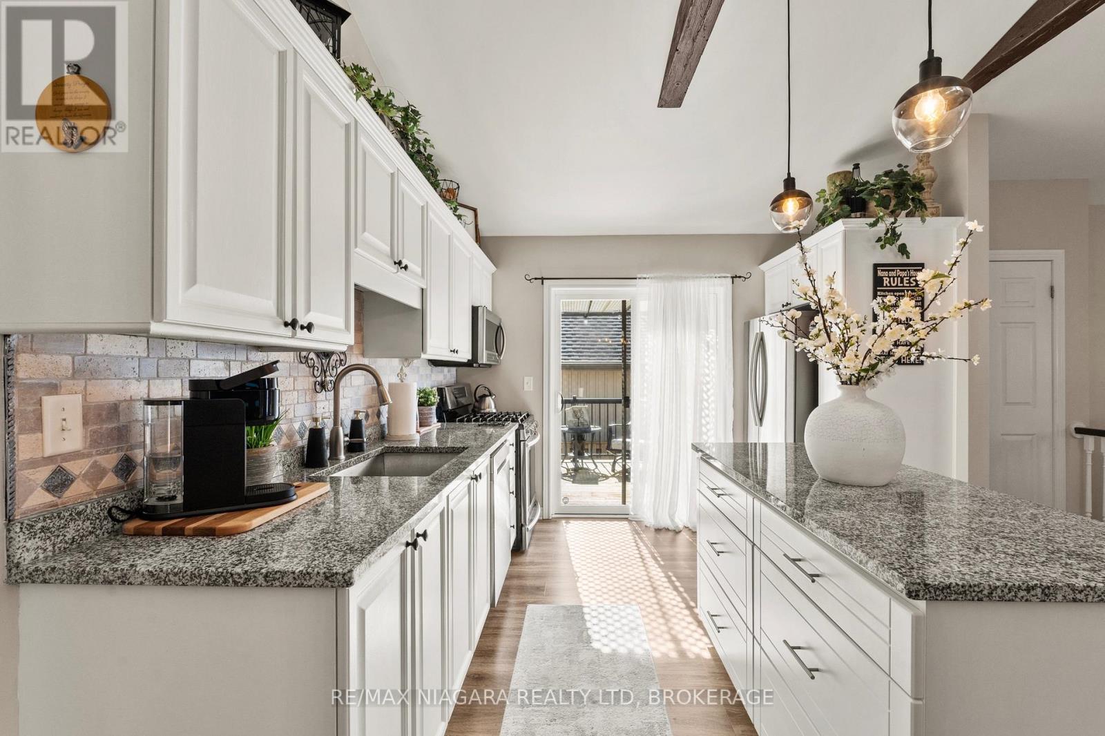 Just unpack and enjoy. This beautifully updated raised bungalow offers modern style, functional space, and an outdoor setup that truly sets it apart.Located in the charming community of Dain City, 232 Regatta Drive welcomes you with an inviting open-concept layout where the living room, dining area, and kitchen blend seamlessly together. Updated flooring flows throughout while a striking accent wall with fireplace anchors the space and adds warmth and character. Cathedral ceilings with exposed beams create an airy feel and give the home a polished, magazine-worthy look.The bright white kitchen features granite countertops, a central island perfect for gathering, and large patio doors that lead directly to the backyard. The dining area easily accommodates both family dinners and entertaining with friends. The main floor offers two bedrooms, including a spacious primary retreat, along with a well-appointed four-piece bathroom. The lower level is bright and incredibly versatile. A large finished rec room offers endless possibilities, family room, games area, or home office, while the additional bedroom and dedicated laundry room provide excellent functionality, with potential for a future second kitchen if desired. Step outside and you'll discover where this home truly shines. The upper deck is ideal for barbecuing, while the backyard showcases a stunning custom-built covered awning and expansive concrete patio designed for relaxing or entertaining rain or shine.With an attached garage, parking for up to six vehicles, and close proximity to parks, the recreational canal, shopping, and highway access, this home offers both comfort and convenience. Come experience why Dain City continues to be one of Welland's most desirable hidden gems. (id:64974)