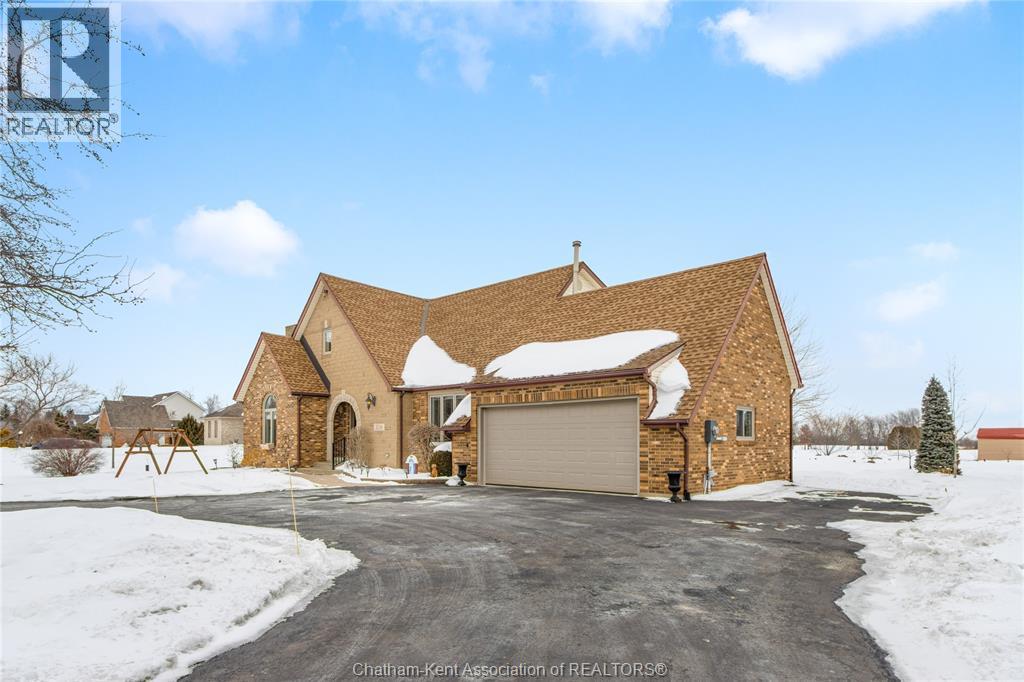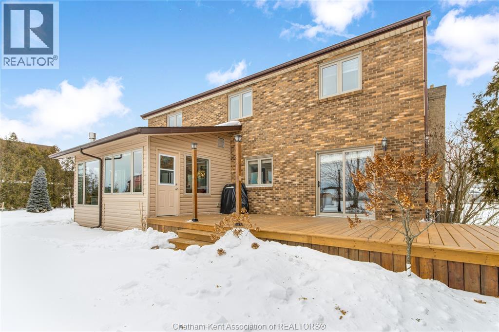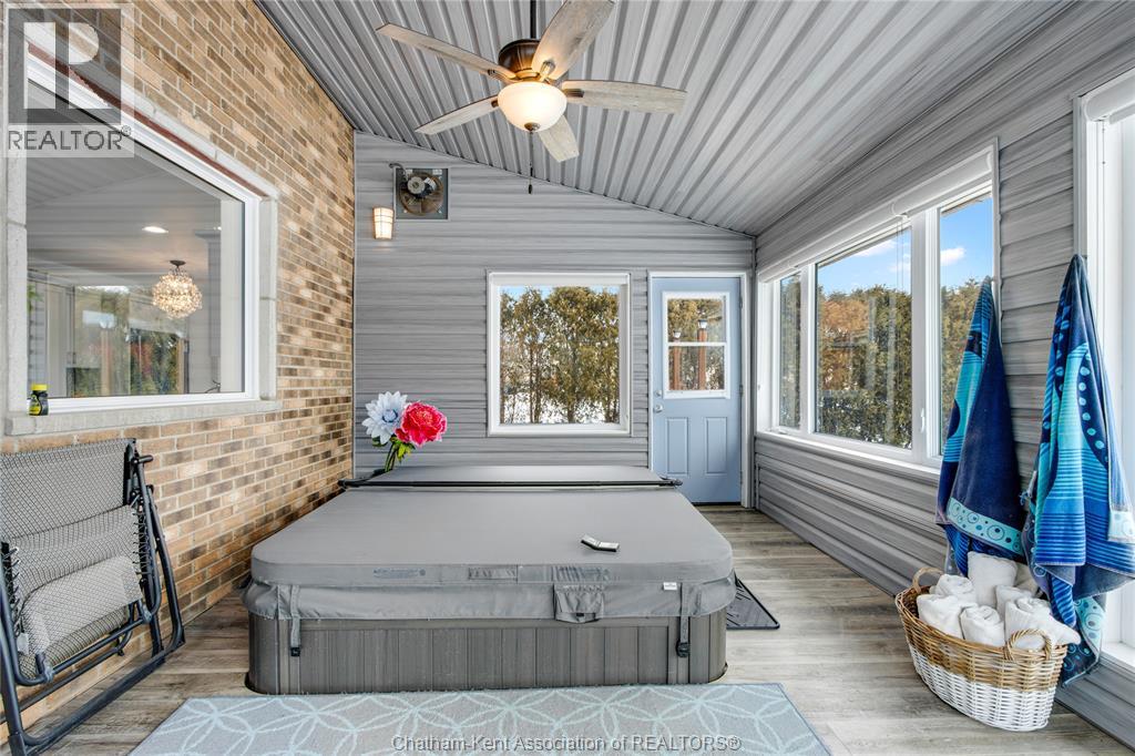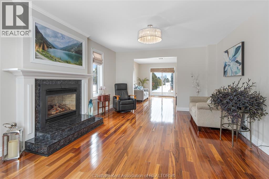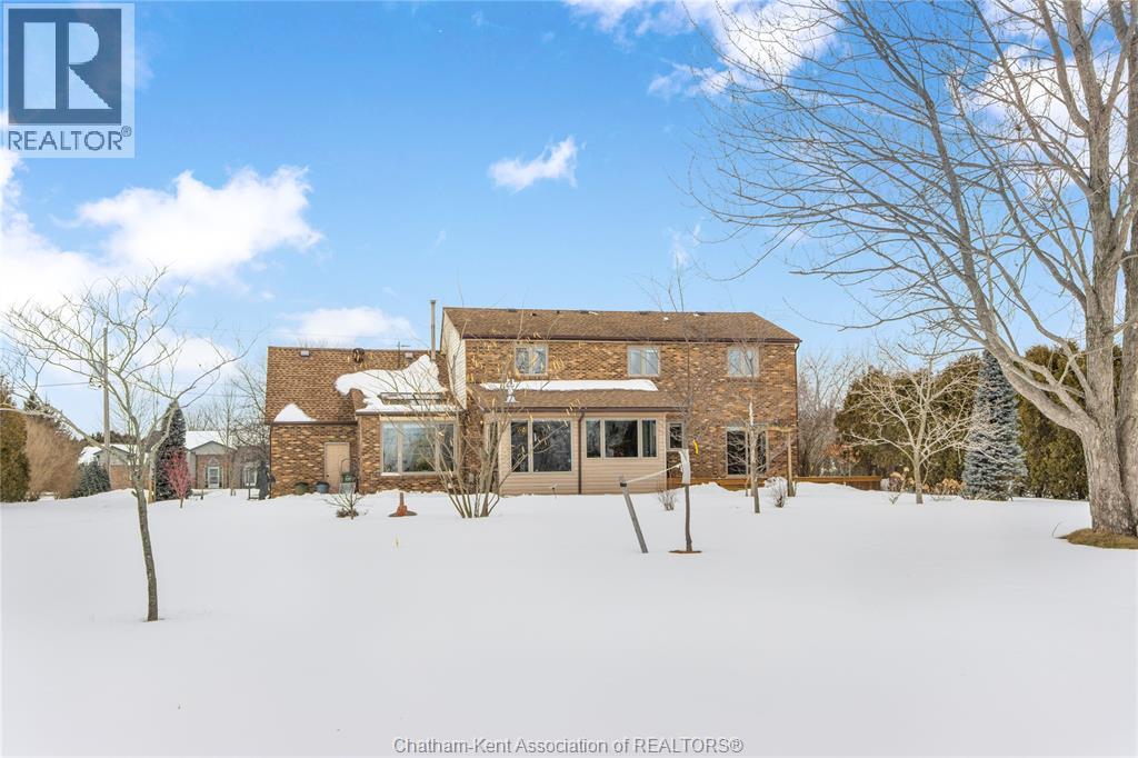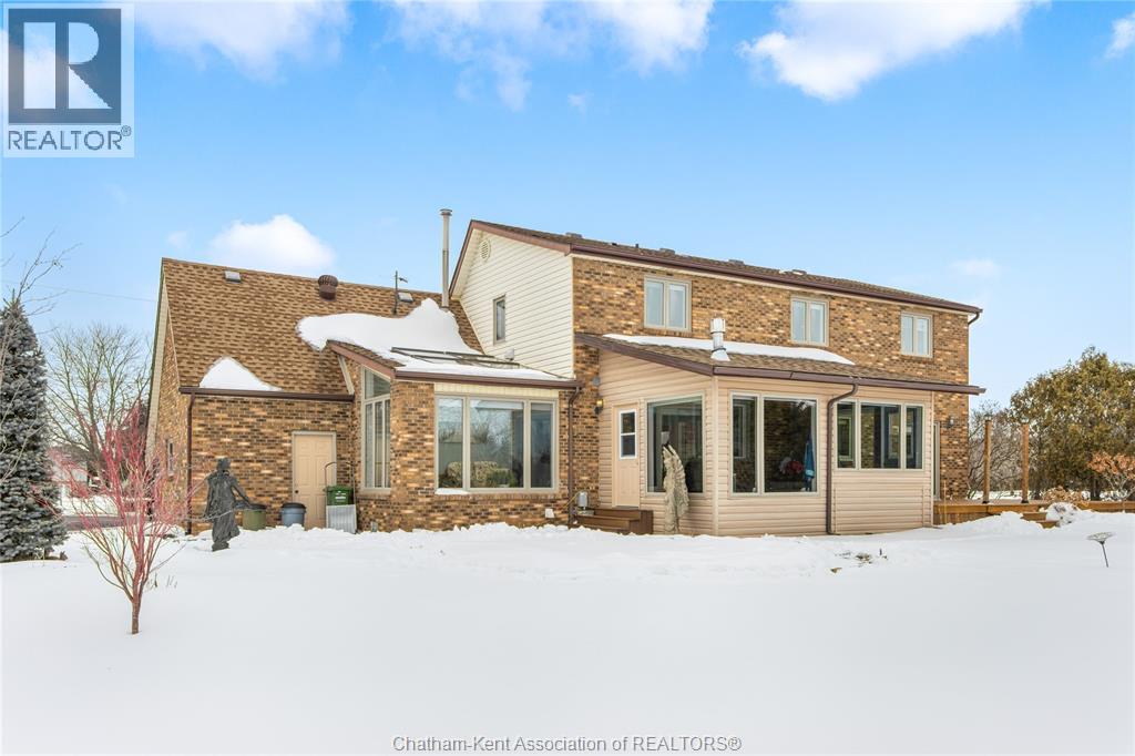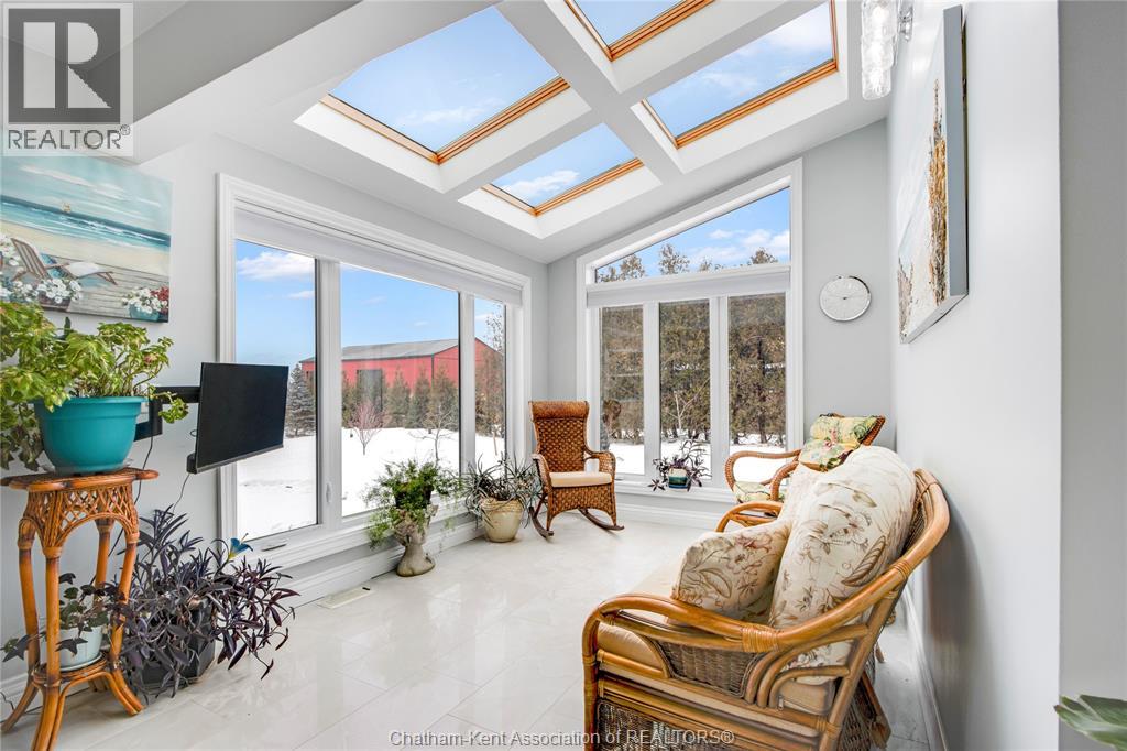 Situated on a large, private country lot with agricultural zoning at the rear, this unique two-storey home showcases true pride of ownership. Step inside and you’ll immediately notice the many upgrades, including Brazilian hardwood and porcelain tile throughout the main floor plus a sleek porcelain staircaise. A convenient office or main-floor bedroom is located just off the front entry. The heart of the home features a stylish kitchen with quartz countertops and a stunning waterfall edge that connects the dining area and sunroom featuring huge skylights. This bright, open space is filled with natural light, creating an incredible sun-soaked atmosphere throughout the day. The warmth continues into the 2nd sunroom where you’ll find ample windows, a hot tub and a cozy gas fireplace that is perfect for relaxing year-round. The living room also offers a gas fireplace and connects to a potential formal dining space, complete with a wet bar rough-in and patio doors leading to a large deck overlooking the deep treed backyard . Upstairs, you’ll find spacious bedrooms, including a primary suite with his-and-hers closets and a stylish ensuite featuring a walk-in marble-tiled shower. An adjacent bedroom offers direct access to the primary, making it ideal for a nursery, office, or impressive walk-in closet. Designed with convenience in mind, this home also includes a large walk in attic space for extra storage, a 21’ x 17’ shed, and a spacious horseshoe driveway leading to a double attached garage. Located just 10 minutes from Belle River, 25 minutes to Kingsville, and 30 minutes to downtown Windsor. Don’t miss this incredible opportunity—call today! (id:64974)