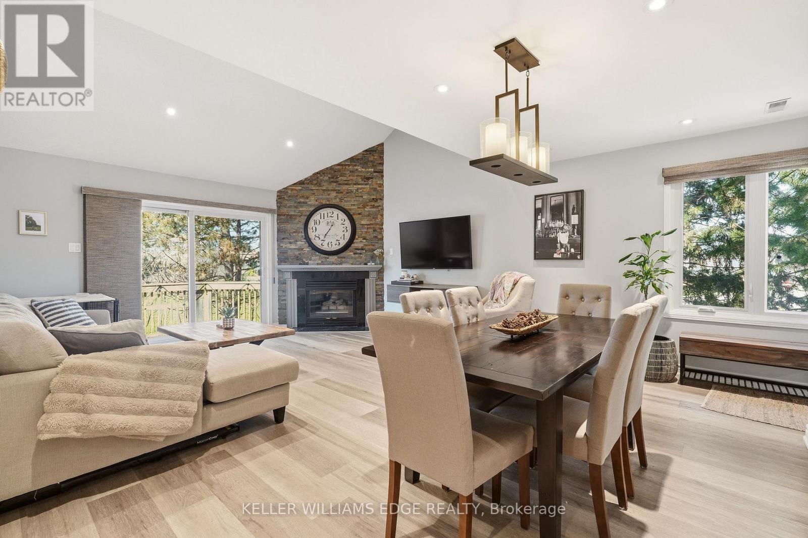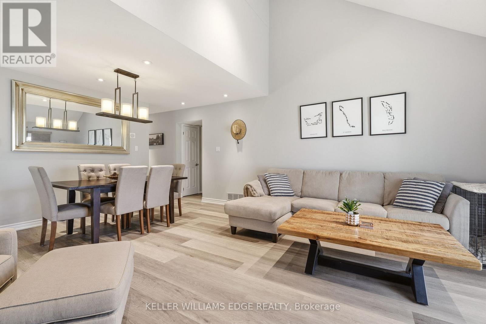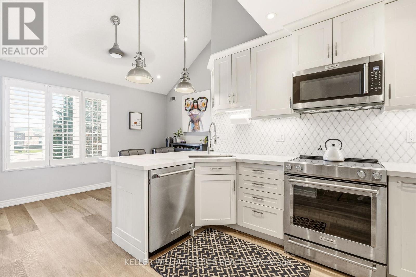 Welcome to this beautifully updated 3-bedroom, 2-bathroom end-unit townhouse in the highly sought-after HeadonForest neighbourhood of Burlington! This bright and stylish home features a newly renovated eat-in kitchen completewith quartz countertops and stainless steel appliances, offering both modern elegance and everyday functionality. Theopen-concept living and dining area boasts soaring vaulted ceilings and sliding door access to a private deck - perfectfor BBQing and entertaining. You will enjoy upgraded LED pot lights throughout the home, integrated with anautomated smart lighting system controllable via mobile app and customizable settings. Enjoy the convenience of mainfloor laundry, along with two generously sized, sun-filled bedrooms and a well-appointed 4-piece bathroom on the mainlevel. Upstairs, retreat to your own private primary suite, featuring a massive walk-in closet, juliette balcony, and a fullyrenovated ensuite with a luxurious soaker tub, heated floors and separate walk-in shower. Enjoy both a single cargarage, as well a 1 outdoor parking space. As an end unit, this home offers added privacy and direct access to adjacentlawn space - ideal for kids to play - while backing onto Cleaver Park with playground and walking trails. Located juststeps from shopping and restaurants, and easy access to highway access, this home combines comfort, style, andconvenience. Don't miss this incredible opportunity! (id:64974)