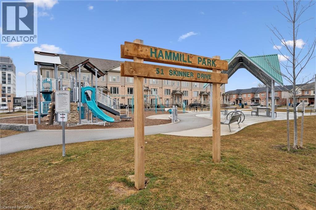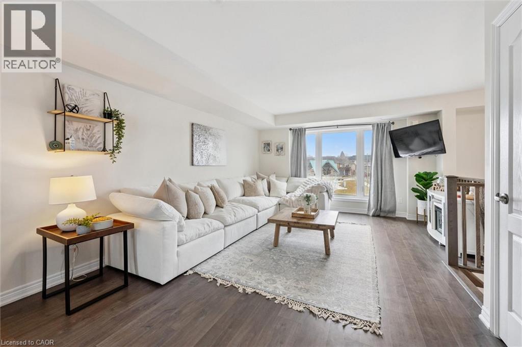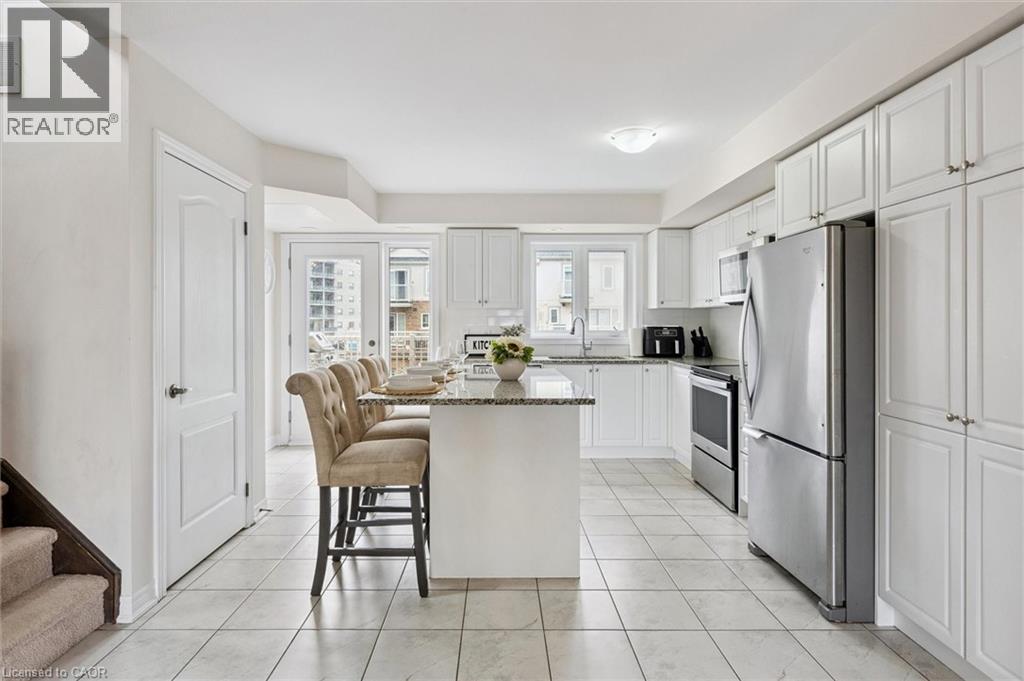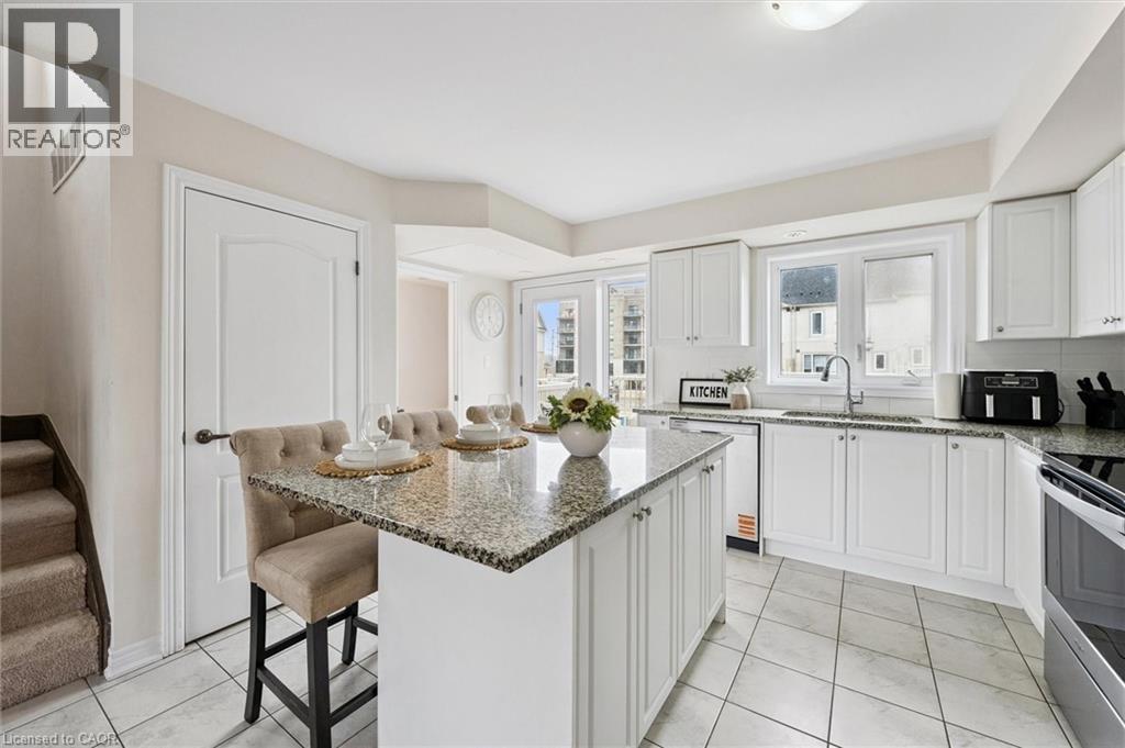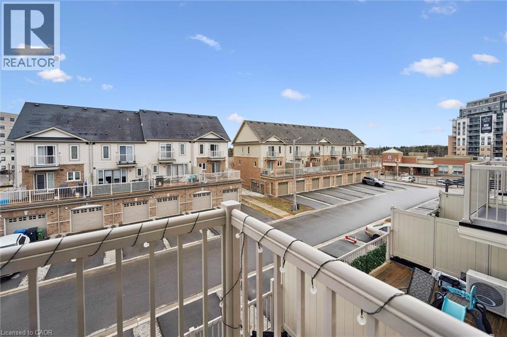 Three-bedroom, three-bathroom homes with a garage don't come up for often in these townhouse blocks. This end-unit was built in 2019, features a spacious living room with luxury vinyl flooring and a large window to allow plenty of natural light. Open to the kitchen, which features lots of beautiful white cabinetry, an island with granite counters, stainless steel appliances, a subway tile backsplash and doors leading to a private terrace that can easily fit a large table and chairs. There is also a powder room on this level. Upstairs has three bedrooms and two bathrooms - the primary bedroom has a walk in closet, ensuite bathroom with quartz counters and a walk-in shower. There is also a sliding door to a private balcony from this bedroom. A very convenient laundry room completes this level. Downstairs provides interior access to a single car garage, plus you have a second parking spot in your driveway. There is a park directly across the street, so there are no neighbours obstructing your front view!. The east end of Guelph has fantastic schools, a public library, Eastview Park with a splash pad, disc golf, and soccer fields, amazing walking trails and great access to the GTA from Guelph Line!. Of note: On-demand water heater, dishwasher (2026), water softener (2025), and low condo fees of $197.14. (id:64974)