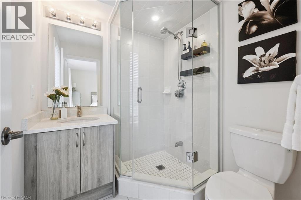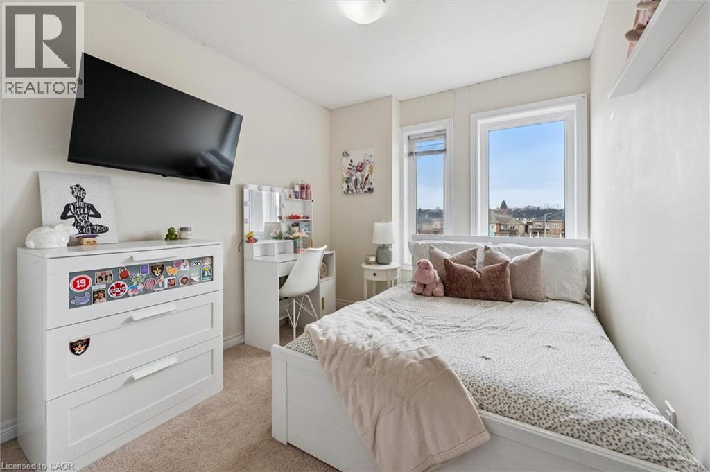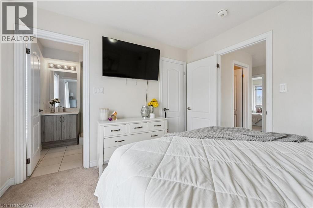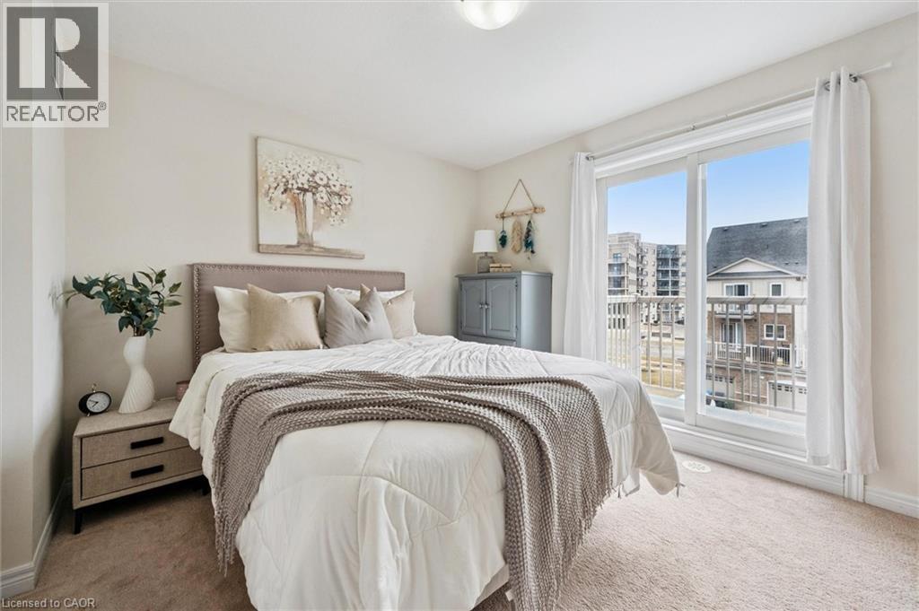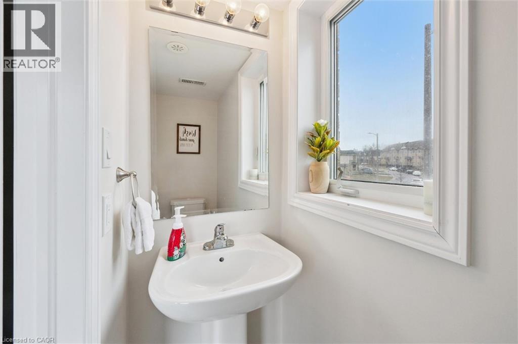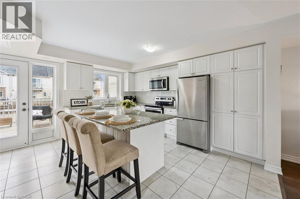 Three-bedroom, three-bathroom homes with a garage don't come up for often in these townhouse blocks. This end-unit was built in 2019, features a spacious living room with luxury vinyl flooring and a large window to allow plenty of natural light. Open to the kitchen, which features lots of beautiful white cabinetry, an island with granite counters, stainless steel appliances, a subway tile backsplash and doors leading to a private terrace that can easily fit a large table and chairs. There is also a powder room on this level. Upstairs has three bedrooms and two bathrooms - the primary bedroom has a walk in closet, ensuite bathroom with quartz counters and a walk-in shower. There is also a sliding door to a private balcony from this bedroom. A very convenient laundry room completes this level. Downstairs provides interior access to a single car garage, plus you have a second parking spot in your driveway. There is a park directly across the street, so there are no neighbours obstructing your front view!. The east end of Guelph has fantastic schools, a public library, Eastview Park with a splash pad, disc golf, and soccer fields, amazing walking trails and great access to the GTA from Guelph Line!. Of note: On-demand water heater, dishwasher (2026), water softener (2025), and low condo fees of $197.14. (id:64974)
