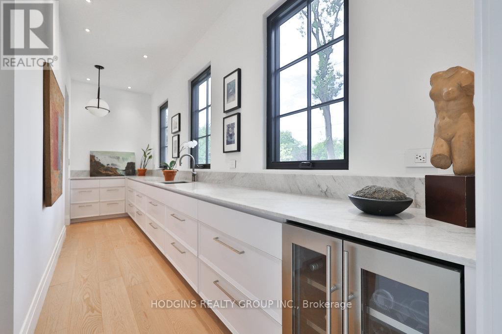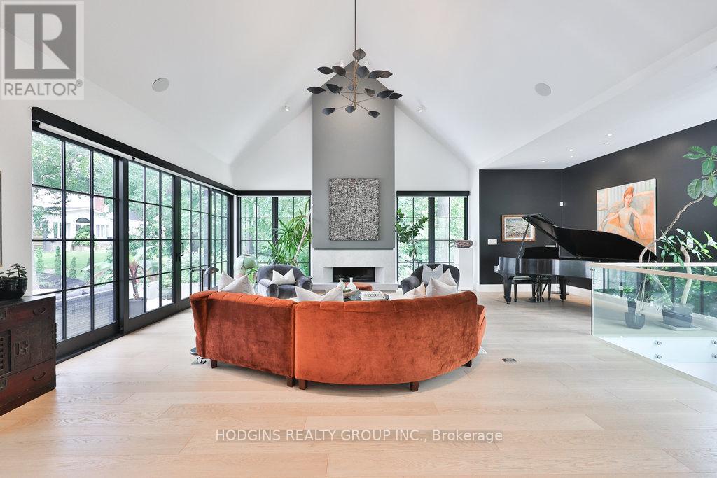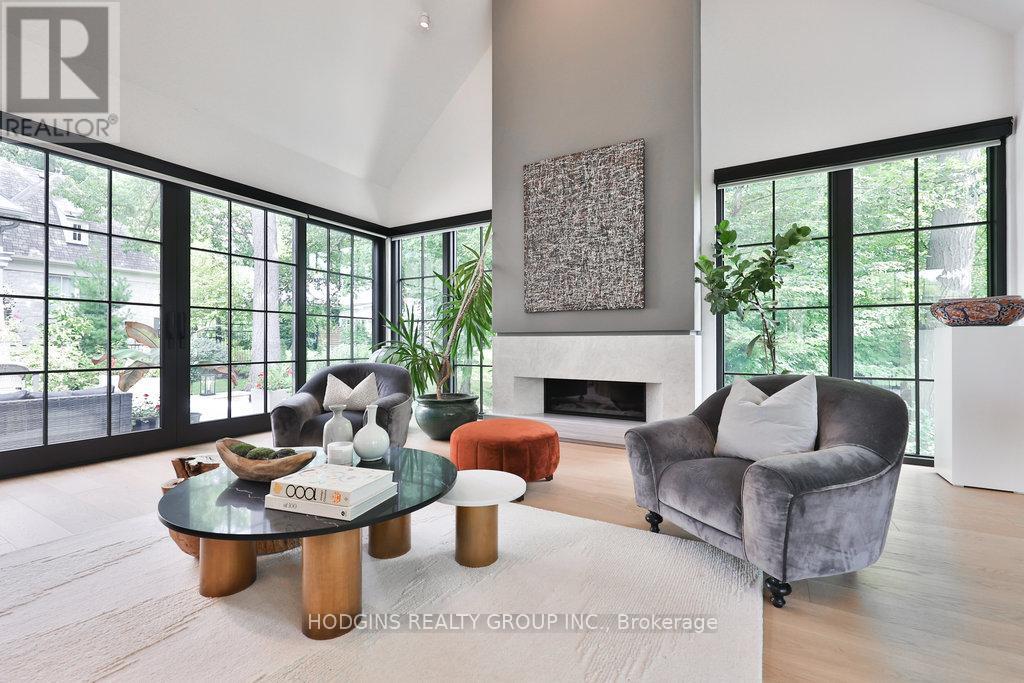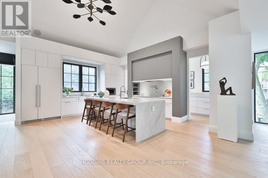 Custom Masterpiece in Prestigious Mineola West by architect Lauren Boyer. A residence of distinction where design, craftsmanship & setting converge. Main floor Primary Bedroom retreat anchors a flowing layout with heated white oak floors, dramatic ceilings and expansive windows framing wooded views. Gourmet kitchen finished in exquisite Taj Mahal quartzite with oversized island, custom cabinetry, professional-grade appliances & separate prep kitchen and mudroom with laundry. The inspiring Great Room shares magnificent open vaulted ceilings with the kitchen, and offers a relaxing lounge vibe with vibrant fireplace and grand piano niche/library. Walkout to entertainers terrace complete with outdoor kitchen and gas grill. Bespoke entry doors by Brenlo bring you to elegant dining and living spaces with curated lighting by Top Brass, and refined attention to every detail. The raised lower level features an expansive recreation lounge with heated floor and an additional bedroom/office with full bath, abundant storage, and a separate entrance. The second floor has an additional master suite, plus two more bedrooms, a full bath, laundry, and ample storage.Exterior features a stately & durable metal roof, in-ground sprinklers, Landscape architect Mark Pettes, lush mature gardens & sought-after circular drive. A rare blend of modern luxury & timeless architecture in one of South Mississaugas most coveted enclaves. Over 5500sf of luxury living space on premium 100ft frontage. Close to Kenollie Public School, a 5-minute walk to the Credit River, 10-minute walk to the Go Train, or a 20-minute walk to the lakefront. (id:64974)