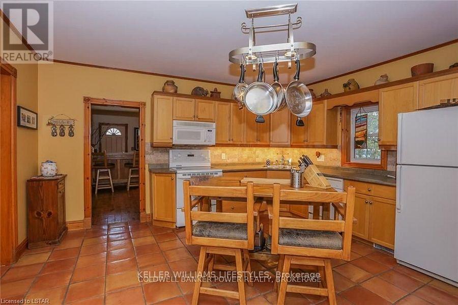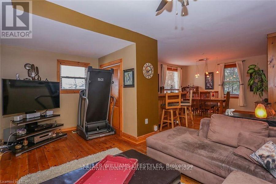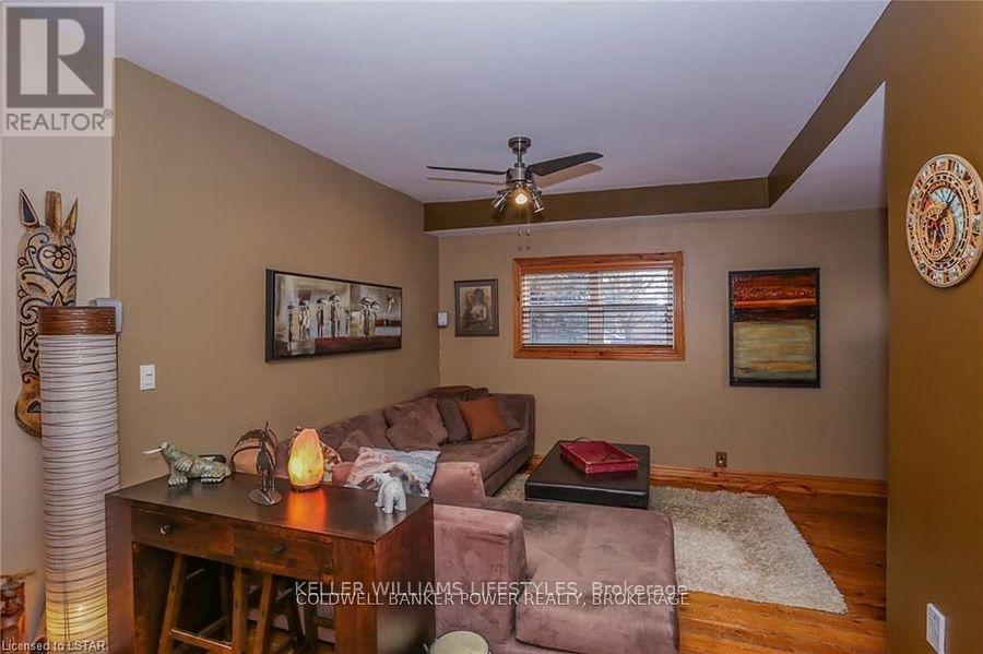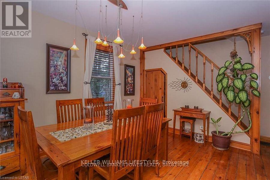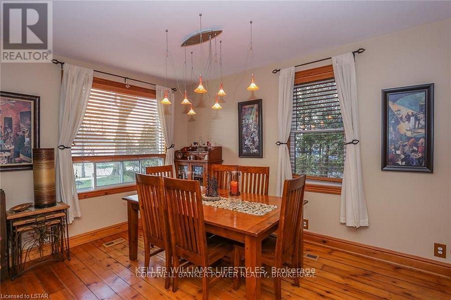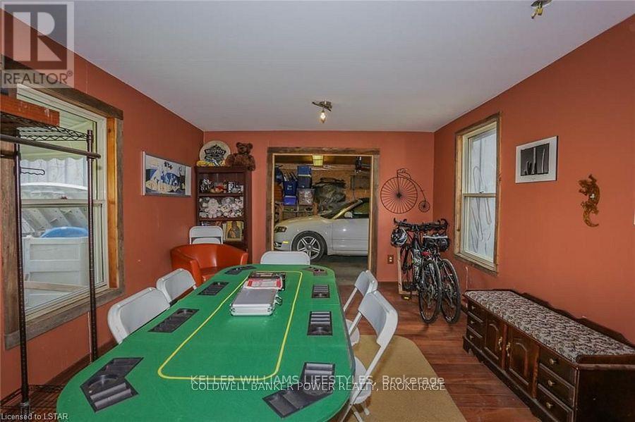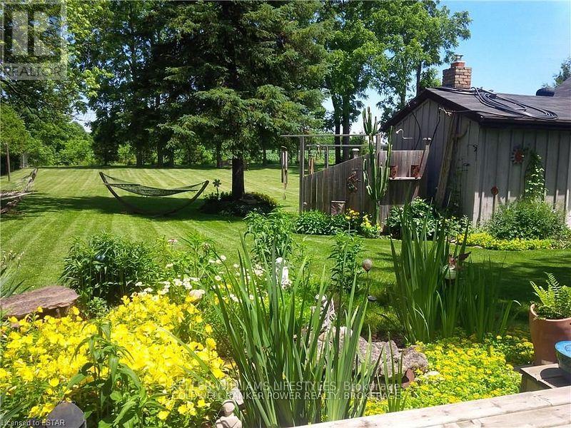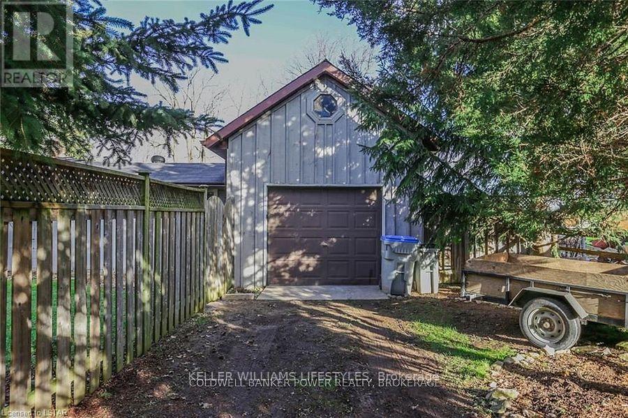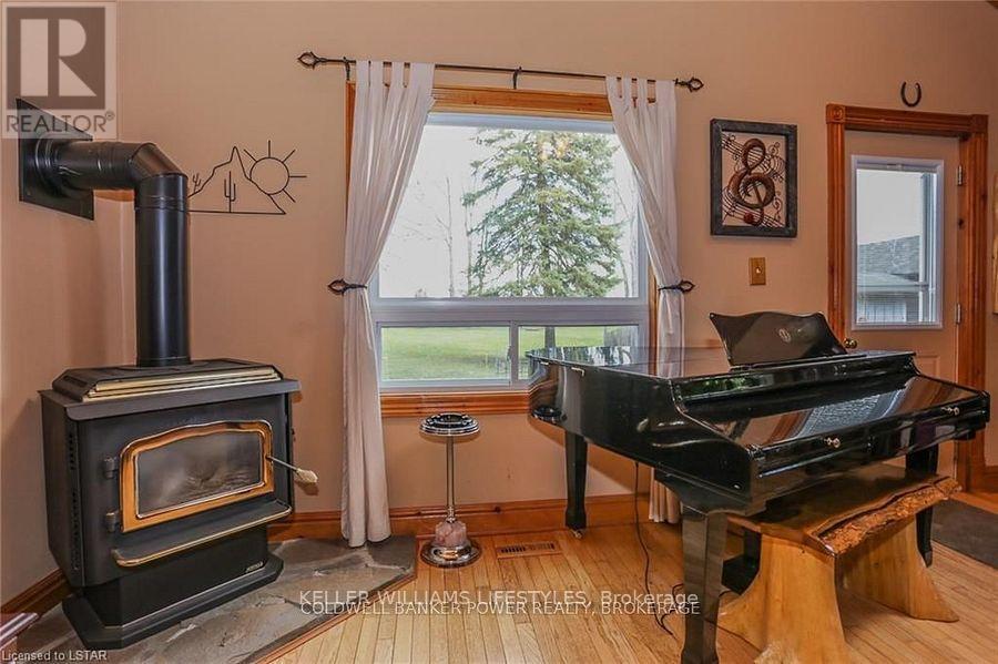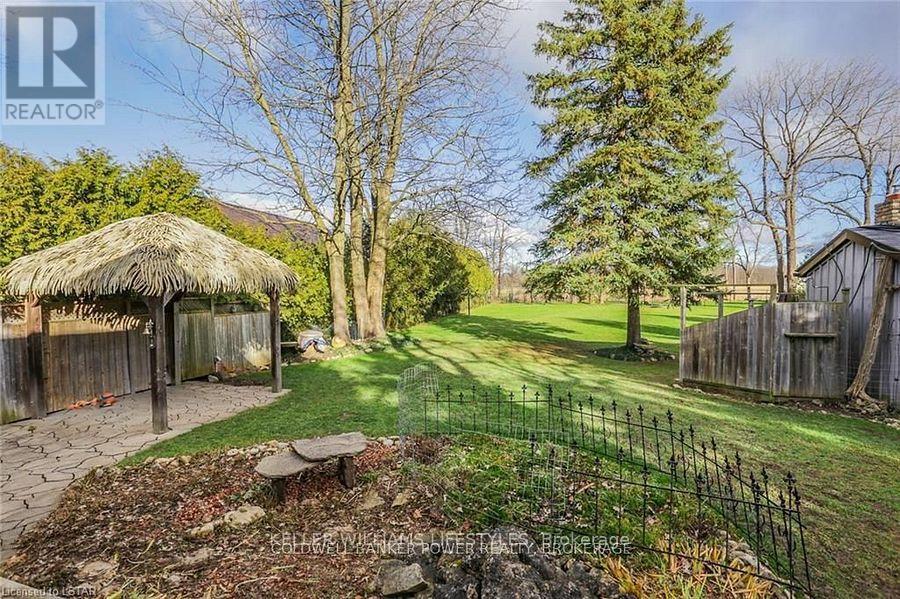 Looking for a place where life slows down and memories speed up? Welcome to your everyday getaway. This charming country retreat sits on 2/3 of an acre just 15 minutes northwest of London and is the perfect blend of comfort, character, and outdoor living.Inside, you'll find warm wood tones, beautiful Mexican Saltillo tile, and soaring cathedral ceilings that give the home a cozy, cottage feel with plenty of space to gather. The family room, with its pine cathedral ceiling and gas fireplace stove, overlooks the backyard and is the kind of space you'll never want to leave. A huge front great room, updated kitchen, and spacious main floor laundry/mudroom make everyday living easy.Step outside and this is where the magic really happens, fully fenced, landscaped yard backing onto farmland for ultimate privacy. Host friends and family on the large deck with lighting and waterfall, relax in the 8-person hot tub, enjoy evenings around the fire, rinse off in the private outdoor shower, or hang out under the tiki hut. It's built for entertaining and unwinding.Updates include furnace and central air (2017), updated electrical panel, shingles (2010), upgraded eavestroughs, central vac in house and garage, and more. Excellent neighbours and a fantastic workshop/garage space (approx. 30' x 12.5' & 20.5' x 12') for hobbies, storage, or projects.This isn't just a home, it's where weekends happen... every single day. Don't miss it. (id:64974)