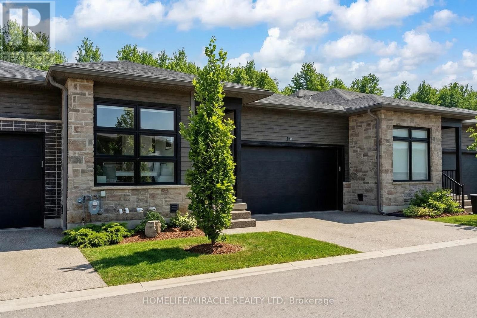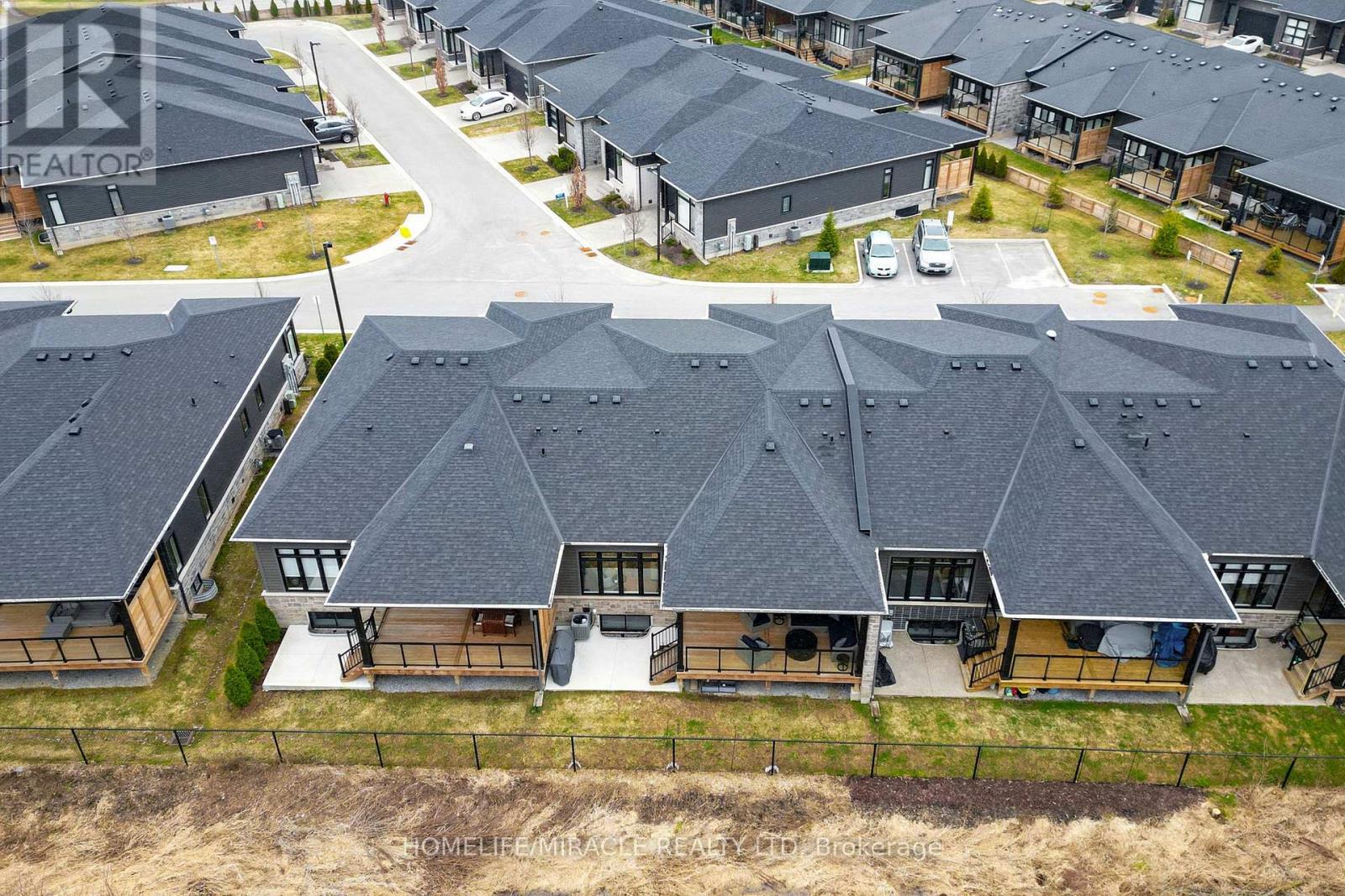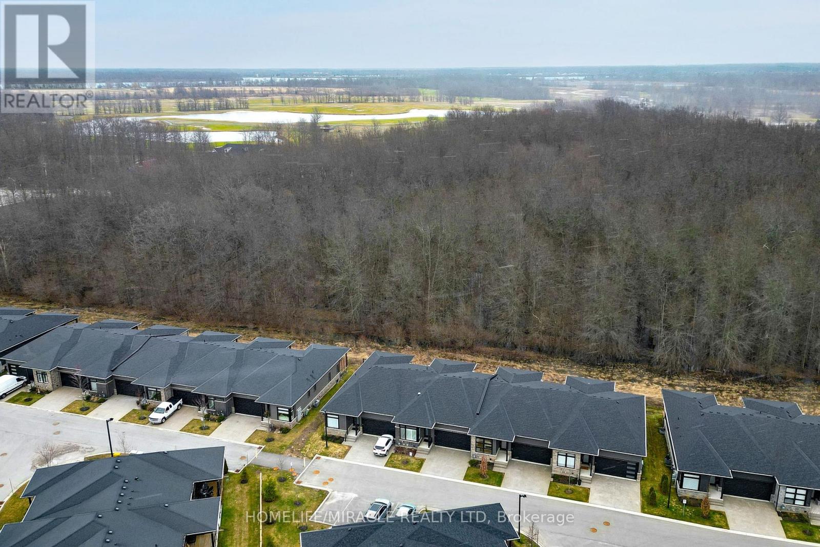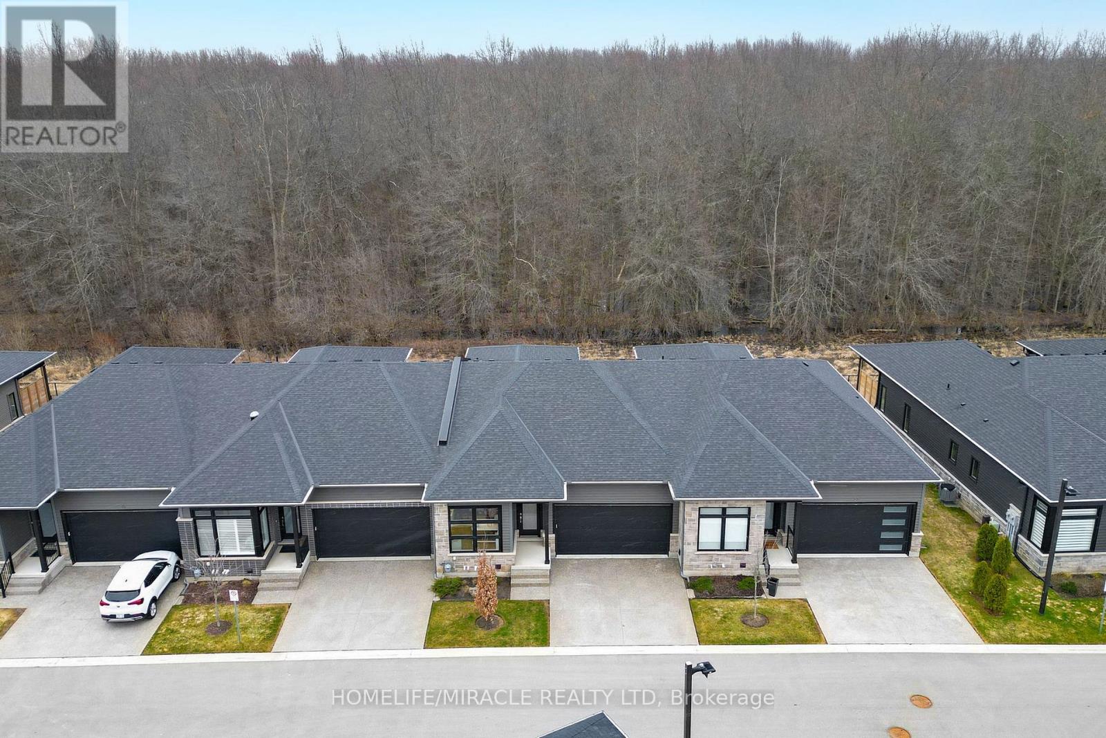 Enjoy luxury living and architectural elegance in this extensively upgraded double car garage bungalow townhome which backs on to the wooded area and located steps from world class 'Legends on the Niagara' golf course in Niagara's premier contemporary community. Luxury finishes throughout the house including $125K (as per seller) spent in quality upgrades and enjoy carefree living in this rare enclave of upscale homes. Features include 9' ceilings on main level, 8' tall interior doors, gorgeous gourmet kitchen with stainless steel appliances, extended center island with Quartz countertops and waterfall edge, laundry room with custom built-ins located conveniently off of the kitchen. Modern open concept great room with electric fireplace and floating wood mantle, large windows, sliding glass door leading to private, covered 20' x 10' deck finished with glass railing and gorgeous views of wooded area. Backyard also features a concrete patio and natural gas hookup for BBQ. Serene primary bedroom with large walk-in closet and spa-inspired 5PC ensuite, complete with glass and tile shower, soaker tub, double vanity and Quartz counters. West facing 2nd bedroom with large windows, 4PC guest bath and interior door to double car garage with rough-in for future electric vehicle completes the main level. Finished basement with upgraded carpet and under pad provides additional 660 Sq Ft of luxurious living space including a bedroom, 3PC ensuite bathroom with heated floors & custom wood shelves, a huge rec room with large window and exercise area. Unfinished mechanical room is 307 Sq Ft in size. Home is wired with audio system in all the rooms, outside video cameras installed and comes with Sony surround sound system, Sonos Amps, HIKVISION for video surveillance along with the 90" TV in the basement rec room. Hunter Douglas blinds throughout with remotes. Upgraded lighting throughout. 200 AMP Electrical Panel. Energy Star certified and located close to golf, watersports and more (id:64974)