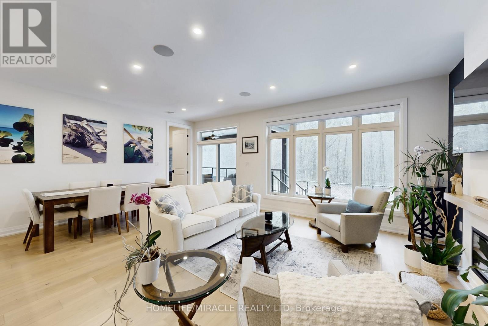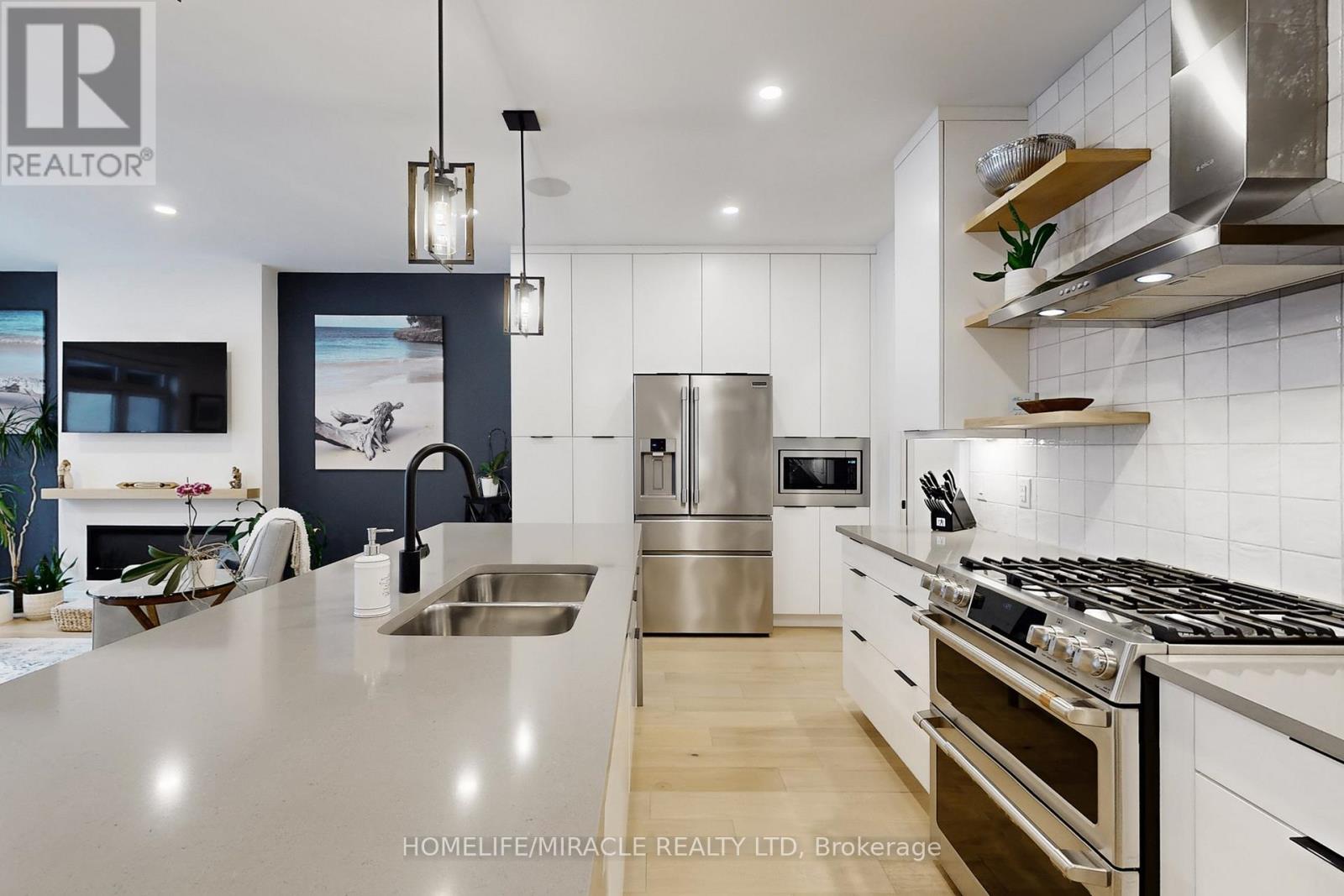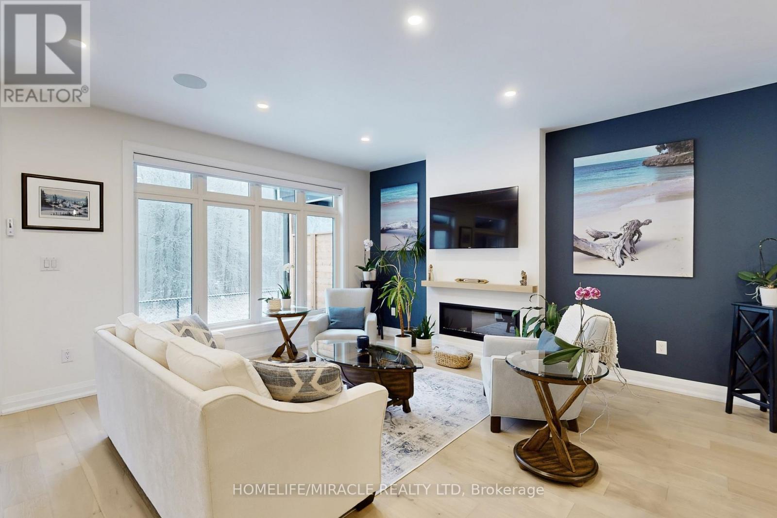 Enjoy luxury living and architectural elegance in this extensively upgraded double car garage bungalow townhome which backs on to the wooded area and located steps from world class 'Legends on the Niagara' golf course in Niagara's premier contemporary community. Luxury finishes throughout the house including $125K (as per seller) spent in quality upgrades and enjoy carefree living in this rare enclave of upscale homes. Features include 9' ceilings on main level, 8' tall interior doors, gorgeous gourmet kitchen with stainless steel appliances, extended center island with Quartz countertops and waterfall edge, laundry room with custom built-ins located conveniently off of the kitchen. Modern open concept great room with electric fireplace and floating wood mantle, large windows, sliding glass door leading to private, covered 20' x 10' deck finished with glass railing and gorgeous views of wooded area. Backyard also features a concrete patio and natural gas hookup for BBQ. Serene primary bedroom with large walk-in closet and spa-inspired 5PC ensuite, complete with glass and tile shower, soaker tub, double vanity and Quartz counters. West facing 2nd bedroom with large windows, 4PC guest bath and interior door to double car garage with rough-in for future electric vehicle completes the main level. Finished basement with upgraded carpet and under pad provides additional 660 Sq Ft of luxurious living space including a bedroom, 3PC ensuite bathroom with heated floors & custom wood shelves, a huge rec room with large window and exercise area. Unfinished mechanical room is 307 Sq Ft in size. Home is wired with audio system in all the rooms, outside video cameras installed and comes with Sony surround sound system, Sonos Amps, HIKVISION for video surveillance along with the 90" TV in the basement rec room. Hunter Douglas blinds throughout with remotes. Upgraded lighting throughout. 200 AMP Electrical Panel. Energy Star certified and located close to golf, watersports and more (id:64974)