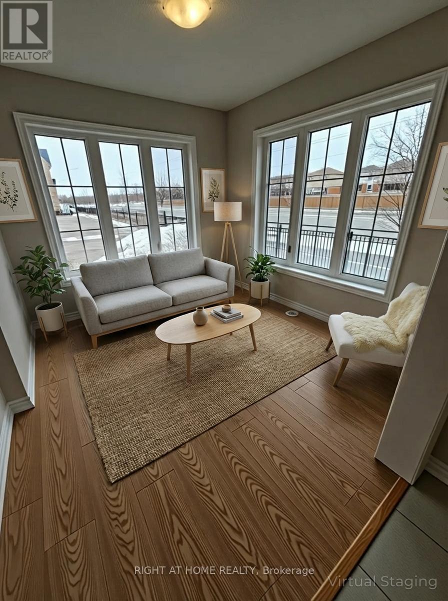 Welcome to this beautifully maintained freehold end-unit townhome in the heart of Whitby, located in the highly sought-after Rolling Acres community. This 3-storey home offers a bright, thoughtfully designed layout that perfectly balances comfort and modern living, featuring engineered hardwood flooring throughout. The main floor includes a versatile office space-ideal for remote work, studying, or a family room-along with a conveniently located laundry room. Head up to the second floor and you'll find an open-concept living and dining room filled with natural light from multiple windows. The kitchen truly shines with its elegant cabinetry, quartz countertops, center island, stainless steel appliances, and a walkout to a private balcony-perfect for morning coffee or relaxing evenings. A handy 2-piece powder room completes this level. The top floor offers a spacious primary bedroom with a walk-in closet and ensuite, while the second bedroom features charming arched windows that add character and warmth. A third bedroom provides the flexibility you need-whether for family, guests, or a home office. Ideally located close to schools, parks, shopping, restaurants, and with quick access to Hwy 412/401 and Whitby GO Station, this home offers comfort, style, and exceptional convenience. POTL monthly fee: $175. Please note that the images in this listing are artistically rendered using AI and advanced digital imaging tools to help visualize the property's potential and design. (id:64974)