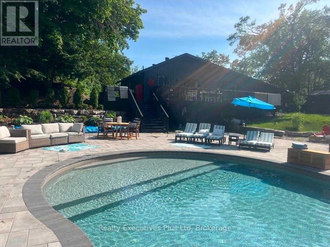 .Welcome to your perfect four-season home and retreat, just a stone's throw from the Horseshoe Valley Resort. Step inside to a bright, open-concept main floor where style meets comfort. The beautifully designed kitchen anchors the space with crisp white cabinetry, sleek countertops, a farmhouse sink stepping out to an expansive deck overlooking the Caribbean style pool and backyard oasis. The layout flows effortlessly into the living and dining areas-perfect for entertaining or unwinding after a day around the pool, golfing, biking or skiing. The main-floor primary suite offers views of the ski hill with a soaker tub to indulge and enjoy after a day on the slopes. Downstairs, the full walkout basement features a recreational room, large bathroom and two additional bedrooms-perfect for guests, family, or even a home office setup-along with direct access to the backyard oasis. Step outside and you'll discover what truly sets this property apart, a beautiful private treed 3/4 acre lot with a large heated saltwater pool surrounded by a 3000 sq ft. stone patio, armor stone, mature perennial gardens and fire pit offering a private resort-style setting right at home. The lush fully fenced grounds are kept effortlessly green with unground sprinkler system, so you can spend more time enjoying the space and less time maintaining it. Whether it's backyard BBQ pool parties around the campfire, ATVing or biking through the local trails, golfing at the resort, hitting the slopes or snowmobile trails this property is built for making memories. Additional highlights include, gas barbecue hookup, perennial gardens and fruit trees surrounding the property. Horseshoe valley is known for its prestige and is a rapidly growing location with a new public school , medical and community center and new grocery store currently being built down the road in nearby Craighurst. This is more than a home-it's a lifestyle. (id:64974)