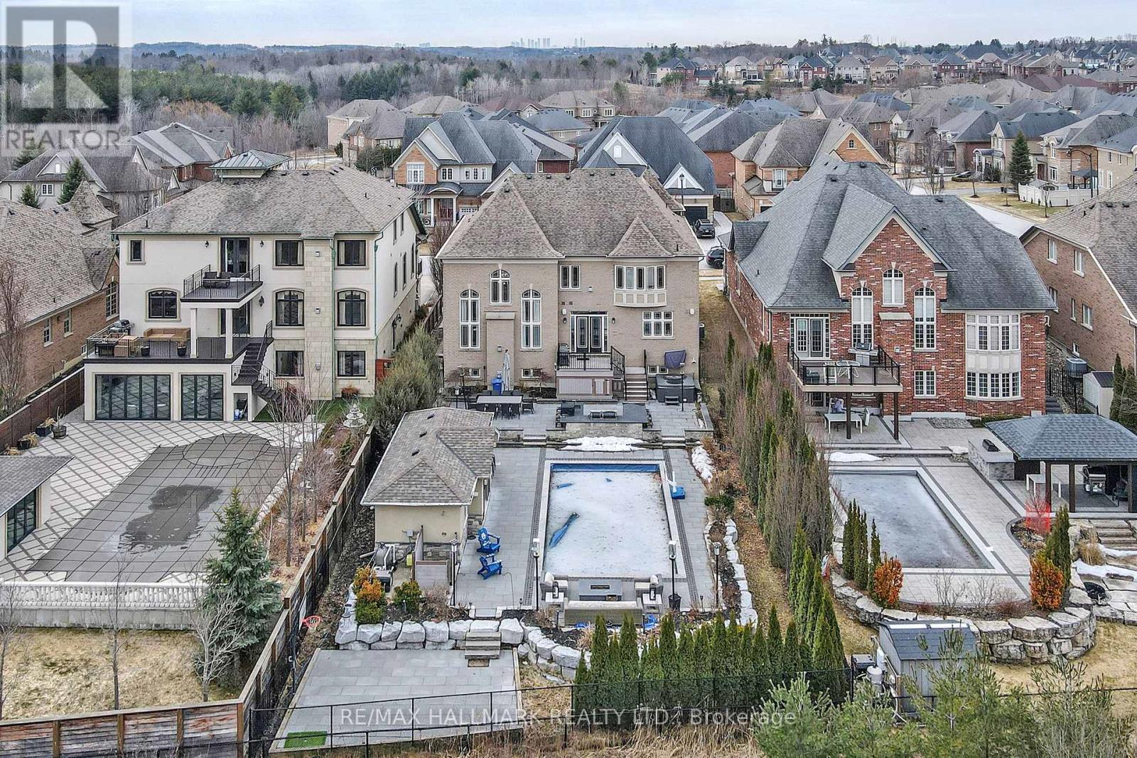 Discover This Exceptional Executive Home Offering Approx. 7,800 Sqft of Refined Living Space & A Private Outdoor Retreat Backing Onto Conservation In Prestigious Nobleton! A striking exterior of stone, stucco and brick introduces a home defined by timeless elegance and architectural detail. Soaring ceilings, intricate millwork, crown moulding & expansive windows flood the space with natural light. The grand foyer opens to sophisticated principal rooms with hardwood flooring, a waffle ceiling, decorative columns & custom finishes. The chef-inspired kitchen is equipped with Sub-Zero refrigeration, a 6-burner gas range, granite countertops, a large centre island, walk-in pantry & walkout to a composite deck. Overlooking the kitchen, the dramatic 2-storey family room offers a gas fireplace, statement lighting & open-to-above design. A main floor office adds flexibility for work or guests. Upstairs, hardwood flooring continues throughout with wrought iron railings & open balcony views. The luxurious primary suite features a fireplace, built-in speakers, dual walk-in closets & a spa-like ensuite with soaker tub, glass shower & double vanity. All additional bedrooms are generously sized with access to full bathrooms. The finished basement with approx. 10 ft ceilings is designed for entertaining, complete with a rec room, full bar, gas fireplace, projector & screen, guest bedroom & bath w/heated floor. Step outside to a resort-style backyard with tiered stone patios, in-ground pool, hot tub, outdoor kitchen & a fully finished cabana with kitchenette, fireplace, serving windows & outdoor shower! Landscape lighting, outdoor speakers & multiple seating areas complete this private outdoor retreat. Don't miss out on this rare offering combining luxury, design & lifestyle! (id:64974)