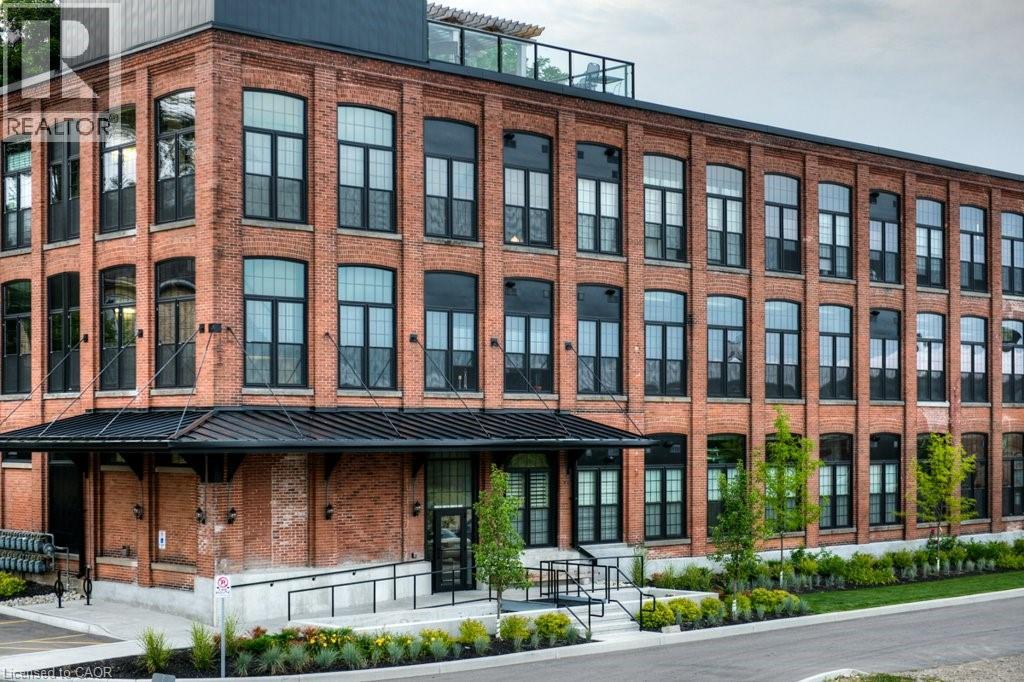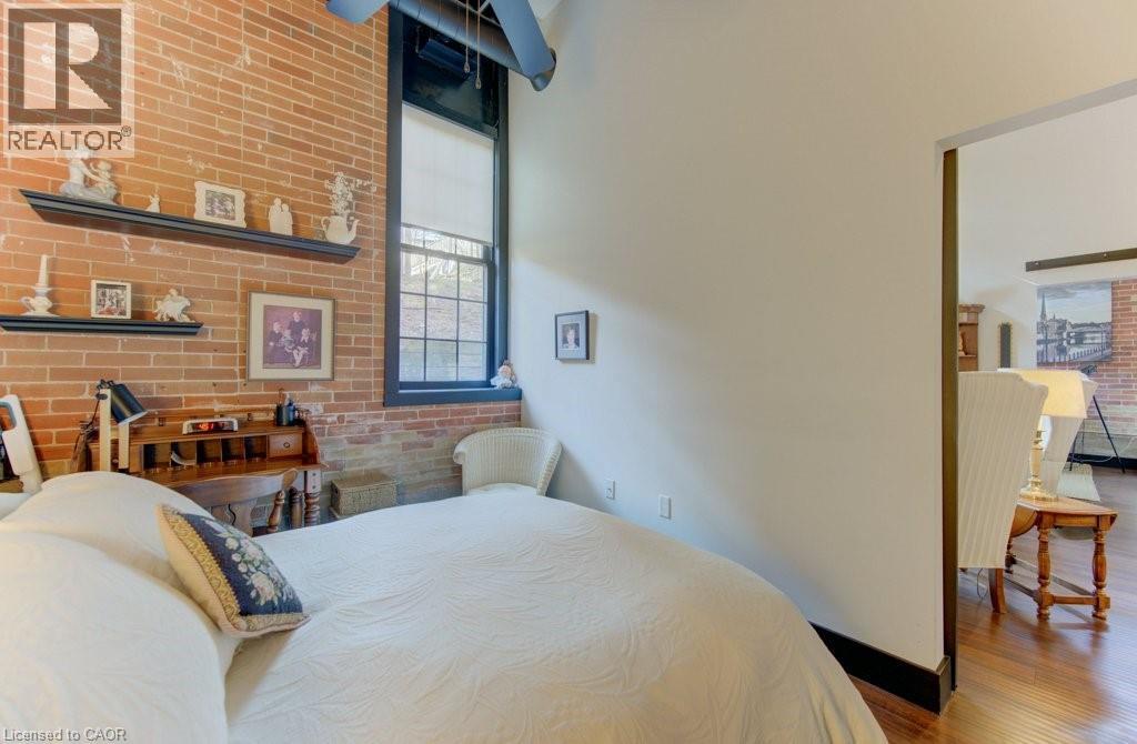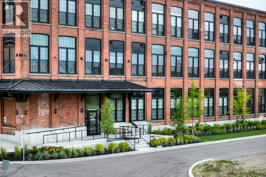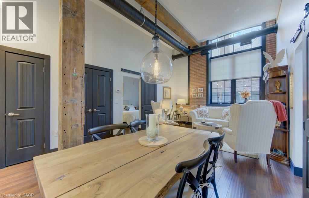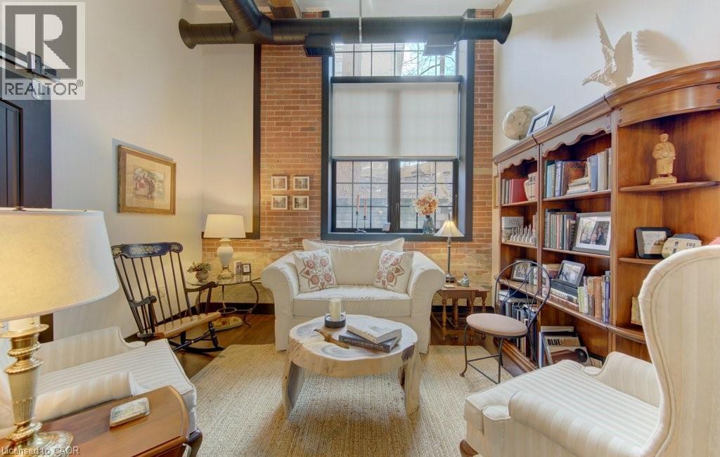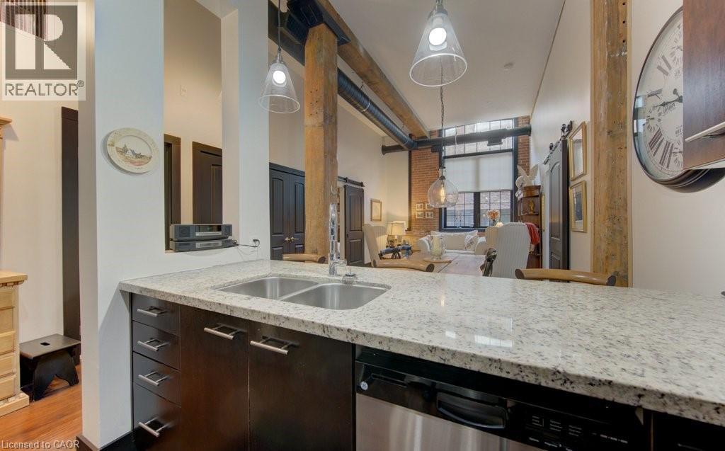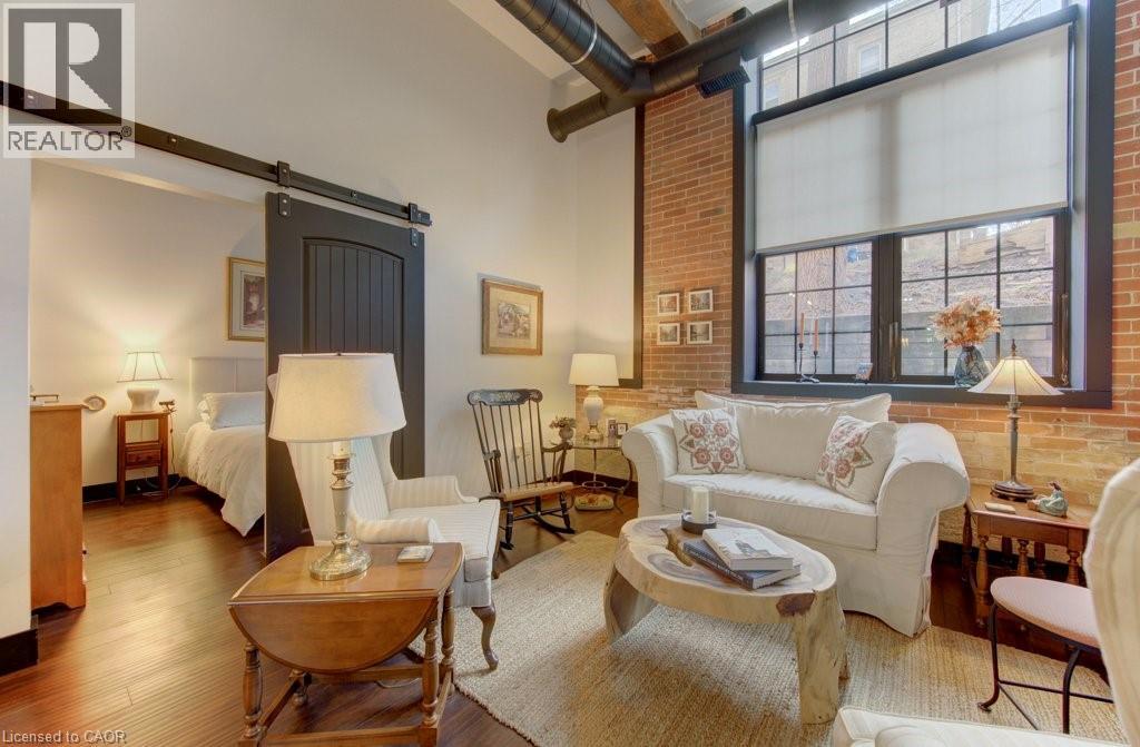 The historic Blacksmith Lofts welcome you to explore urban style with everyday functionality in this rare 2-bedroom loft. Offering a highly sought-after split-bedroom layout, this unit is ideal for professionals, downsizers or anyone looking for flexible living space with added privacy. Step inside to soaring ceilings and an open-concept design that creates an airy, elegant feel throughout. The spacious living and dining area sits between the two bedrooms, making it perfect for entertaining or quiet evenings at home. Large windows invite natural light to pour in, enhancing the loft’s warm, refined character. Both bedrooms are generously sized and feature walk-in closets—an uncommon find in condo living. One bedroom offers semi-ensuite access to the 4-piece bathroom, adding convenience and a touch of separation for guests or shared living arrangements. The kitchen is designed for both style and practicality, with modern finishes and ample workspace to make daily living easy. Carpet-free flooring runs throughout, and in-suite laundry adds to the overall convenience. Located in the heart of downtown Galt, you’re just steps from the Gaslight District, Grand River trails, cafés, restaurants, boutique shops and the University of Waterloo School of Architecture. Residents also enjoy access to a shared rooftop terrace with sweeping city views. If you’ve been waiting for a unique loft with character, space, and a truly functional layout, this one is not to be missed. Book your showing today! (id:64974)