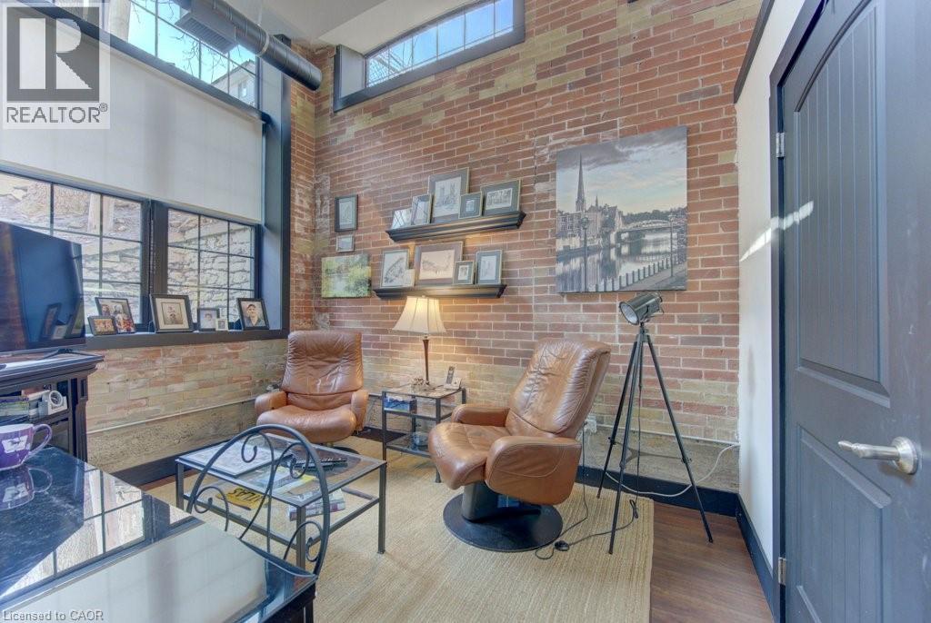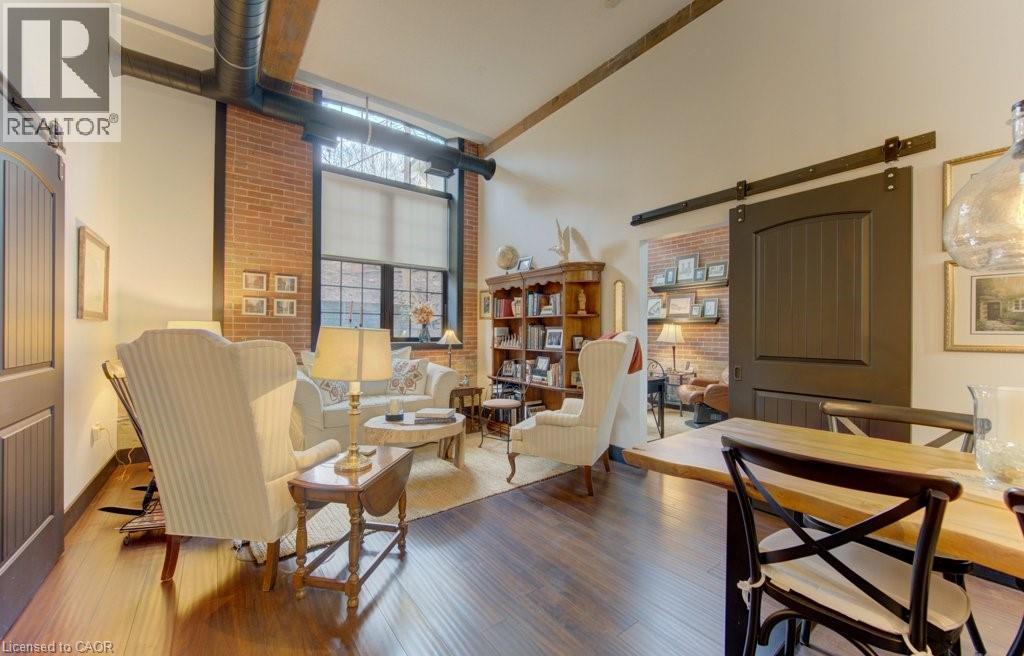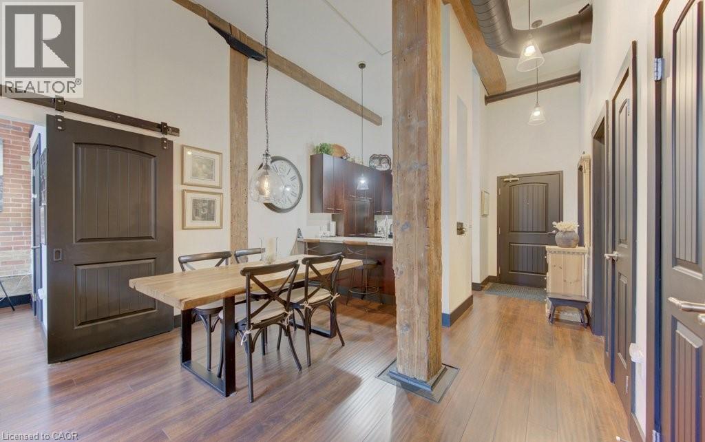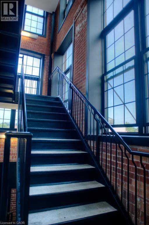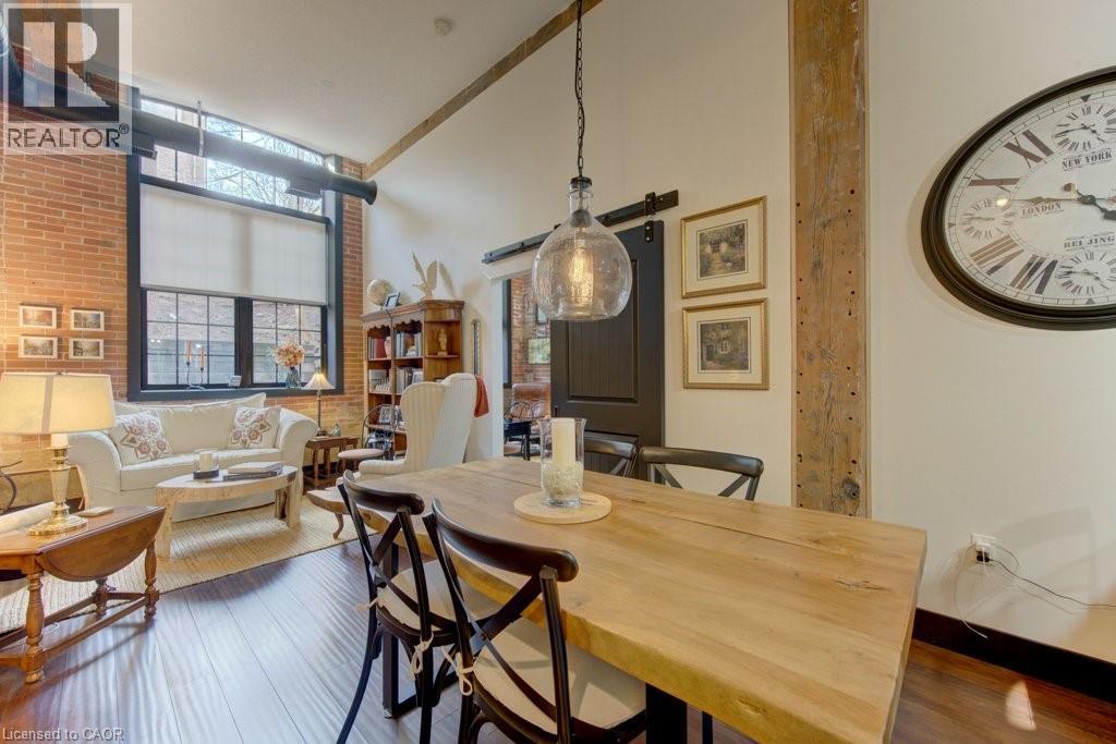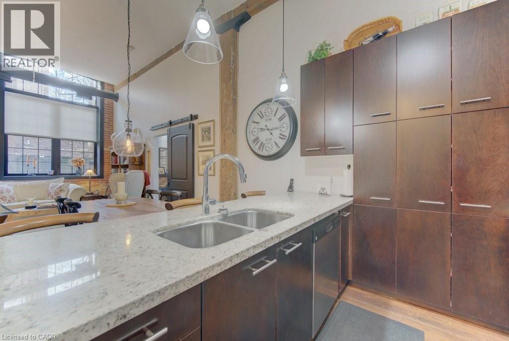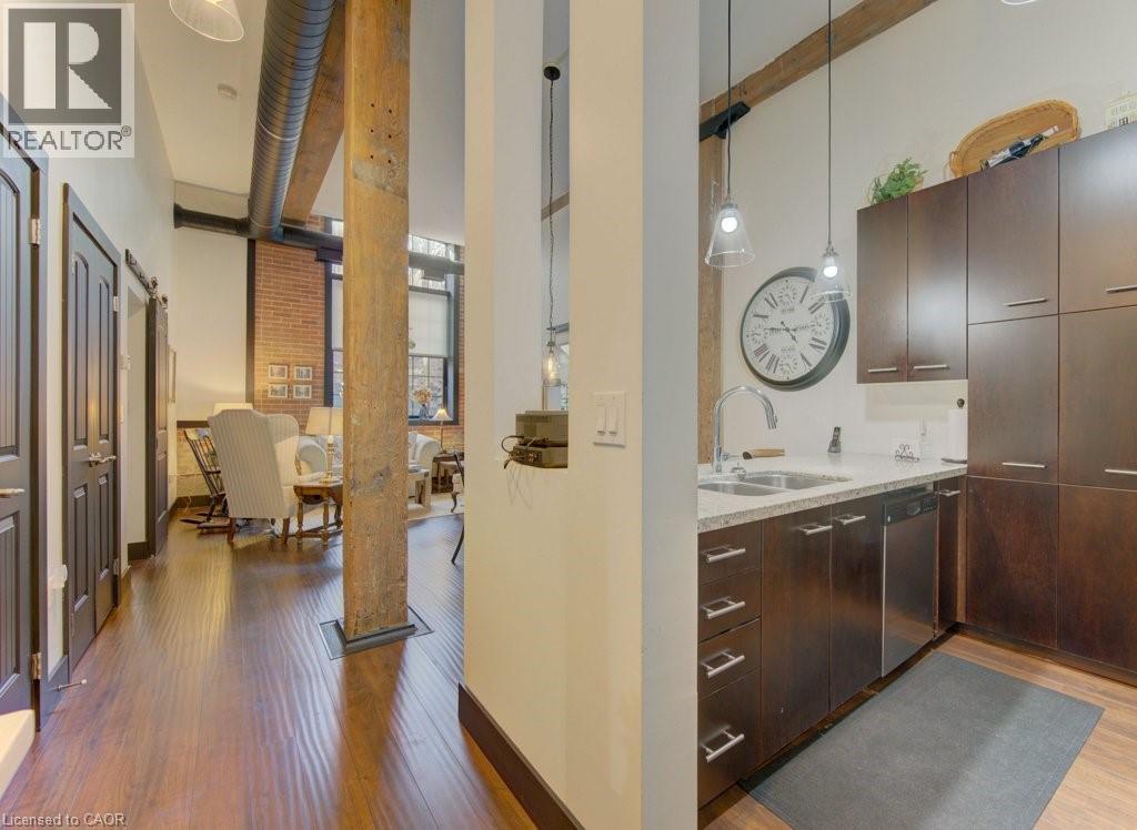 The historic Blacksmith Lofts welcome you to explore urban style with everyday functionality in this rare 2-bedroom loft. Offering a highly sought-after split-bedroom layout, this unit is ideal for professionals, downsizers or anyone looking for flexible living space with added privacy. Step inside to soaring ceilings and an open-concept design that creates an airy, elegant feel throughout. The spacious living and dining area sits between the two bedrooms, making it perfect for entertaining or quiet evenings at home. Large windows invite natural light to pour in, enhancing the loft’s warm, refined character. Both bedrooms are generously sized and feature walk-in closets—an uncommon find in condo living. One bedroom offers semi-ensuite access to the 4-piece bathroom, adding convenience and a touch of separation for guests or shared living arrangements. The kitchen is designed for both style and practicality, with modern finishes and ample workspace to make daily living easy. Carpet-free flooring runs throughout, and in-suite laundry adds to the overall convenience. Located in the heart of downtown Galt, you’re just steps from the Gaslight District, Grand River trails, cafés, restaurants, boutique shops and the University of Waterloo School of Architecture. Residents also enjoy access to a shared rooftop terrace with sweeping city views. If you’ve been waiting for a unique loft with character, space, and a truly functional layout, this one is not to be missed. Book your showing today! (id:64974)