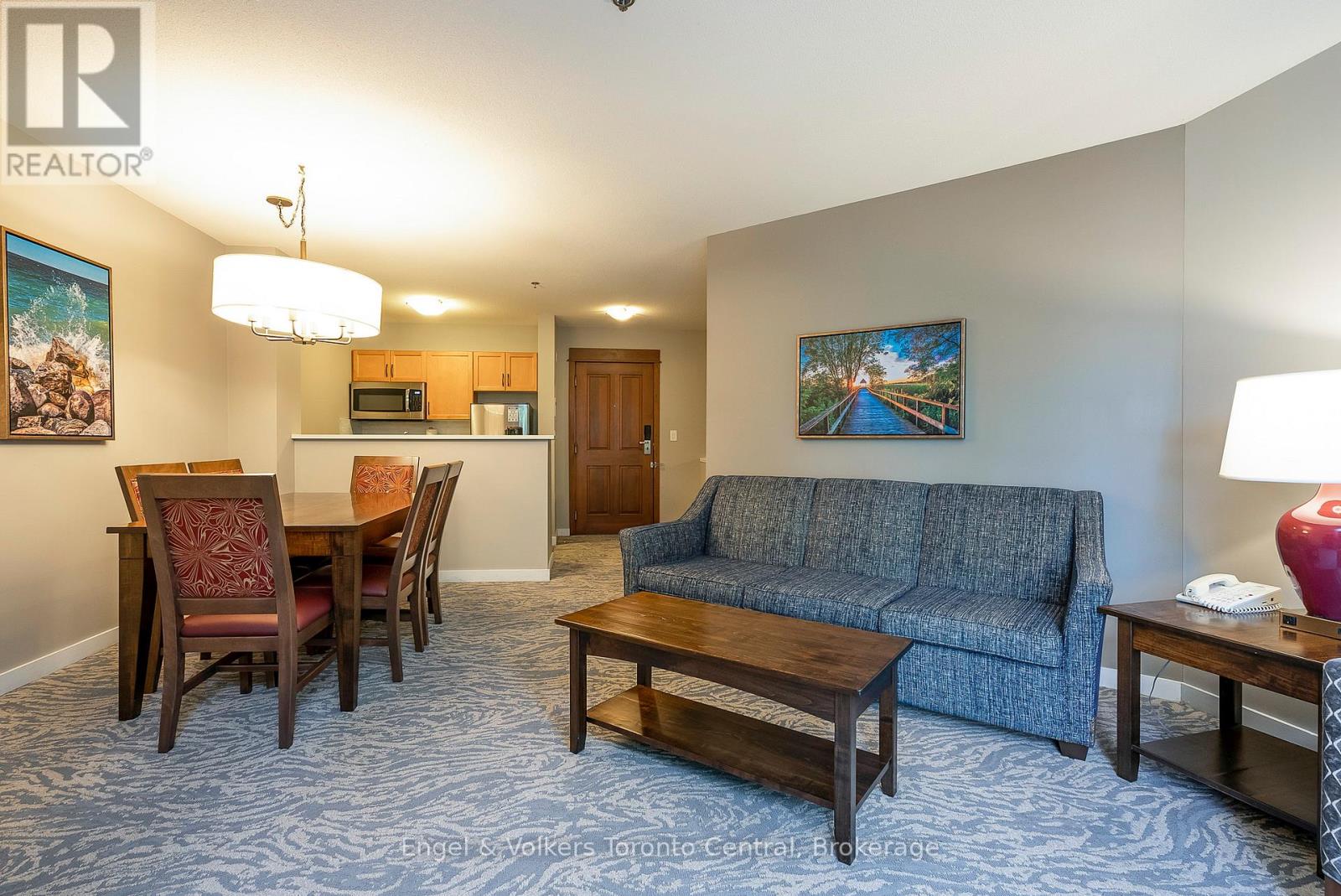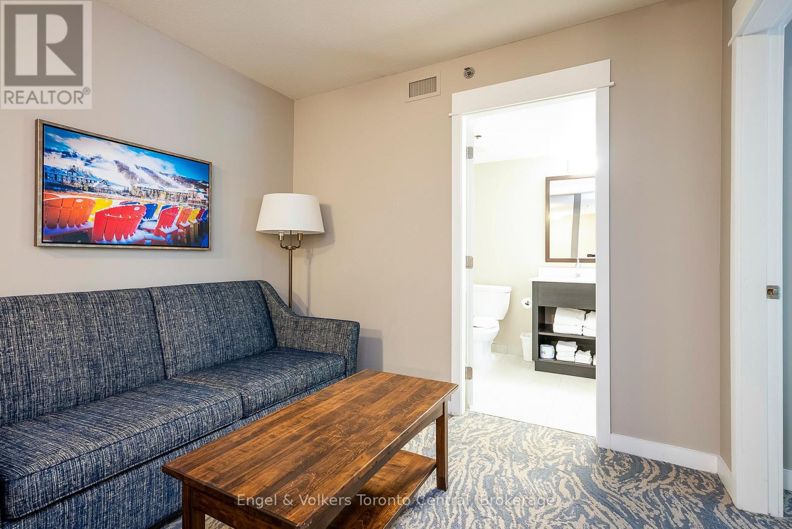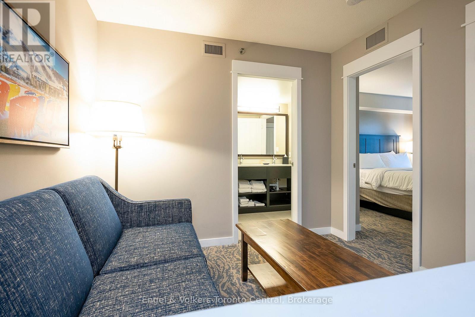 GRAND GEORGIAN ONE-BEDROOM PLUS DEN SLEEPS 6 - Fully furnished One Bedroom + Den in the beautiful Grand Georgian, located in Blue Mountain Village, Ontario's most popular four-season resort. Close to restaurants, shops, activities and amenities making your stay enjoyable. The Grand Georgian features an in-ground outdoor seasonal pool, 2 year round hot tubs, a sauna, exercise room and warm underground parking. Suite Sleeps up to 6! Full kitchen, large bathroom with double sinks! Enjoy the nice gas fireplace after a day on the ski hills. Very spacious with a king size bed in master with private access to 4 piece bathroom. Two pull out sofas. Choose to participate in optional Blue Mountain Resort Rental Pool Program that generates income and allows for personal use. Condo Fees include all utilities. This suite is currently in the Blue Mountain Resorts rental program. HST is applicable on the purchase price but can be deferred by the buyer obtaining an HST number. 2% Village Association Fee is applicable on closing. $1.08 per square foot annual Blue Mountain Village Association Membership fee paid quarterly. (id:64974)