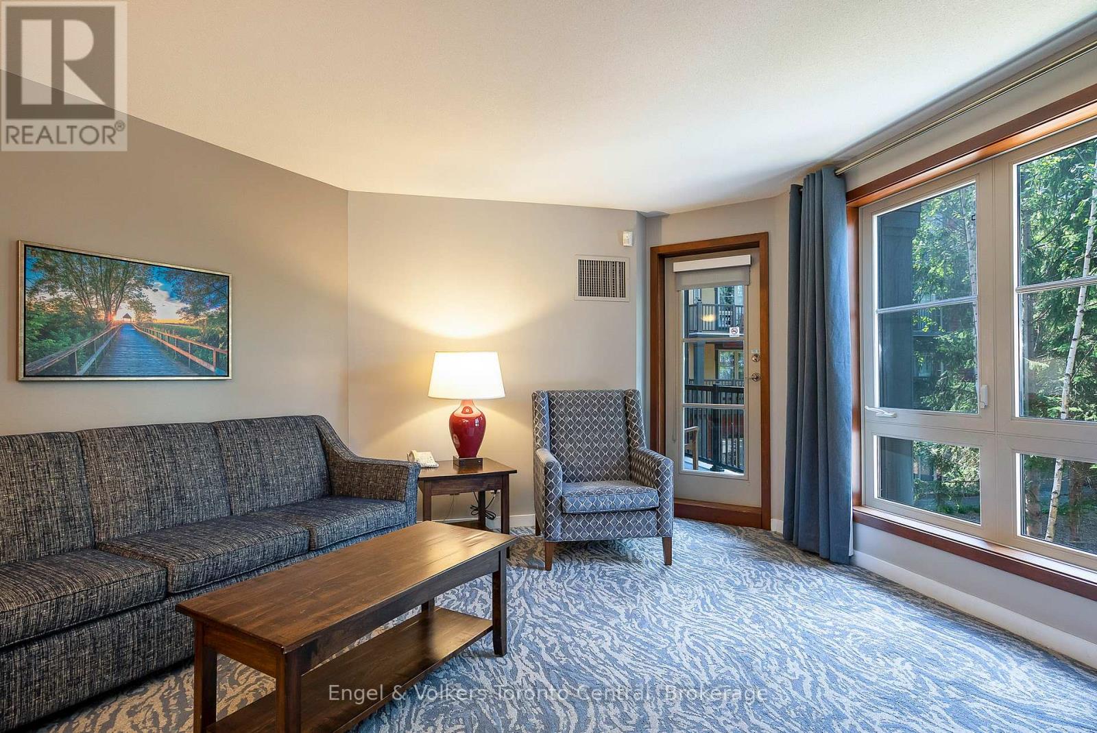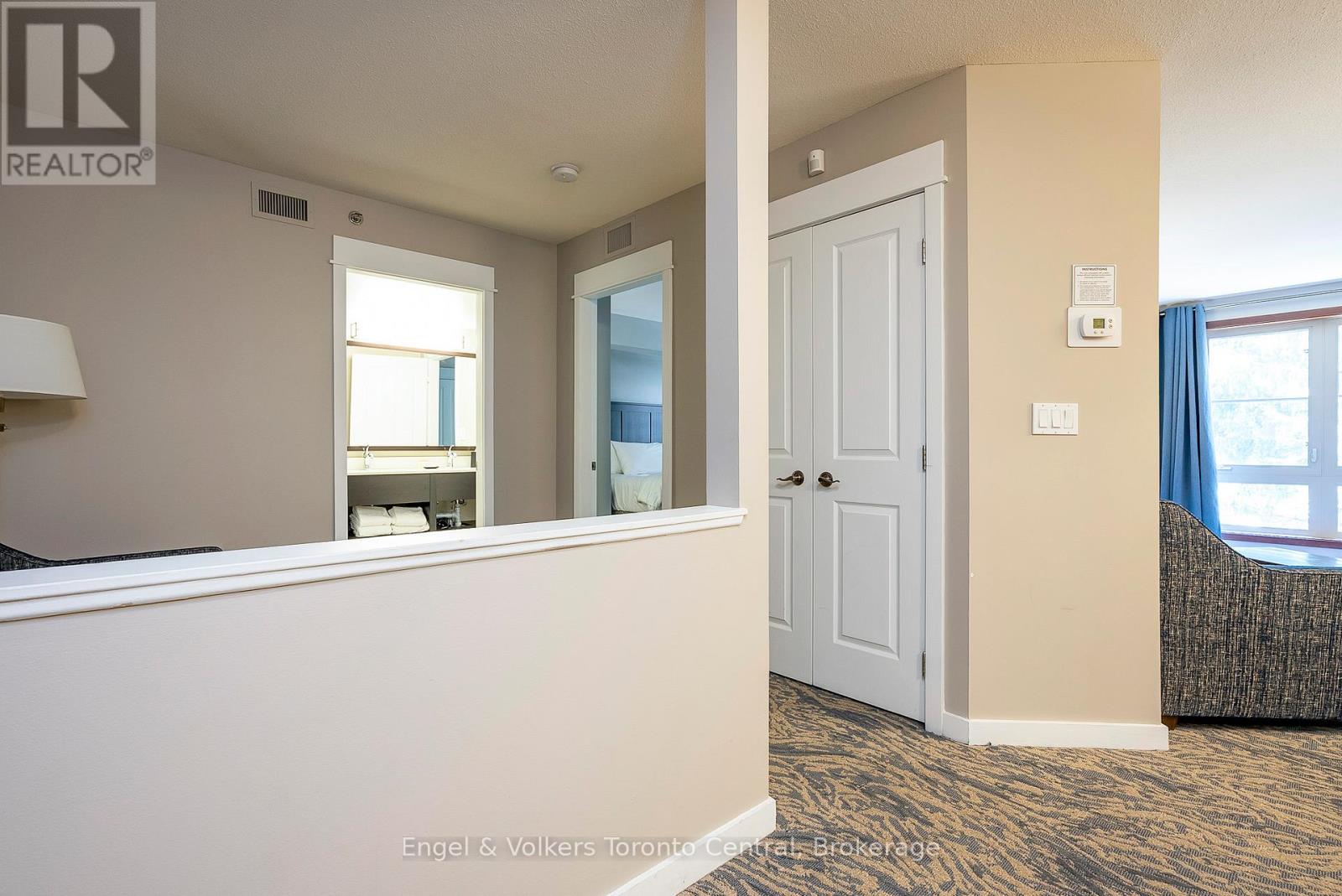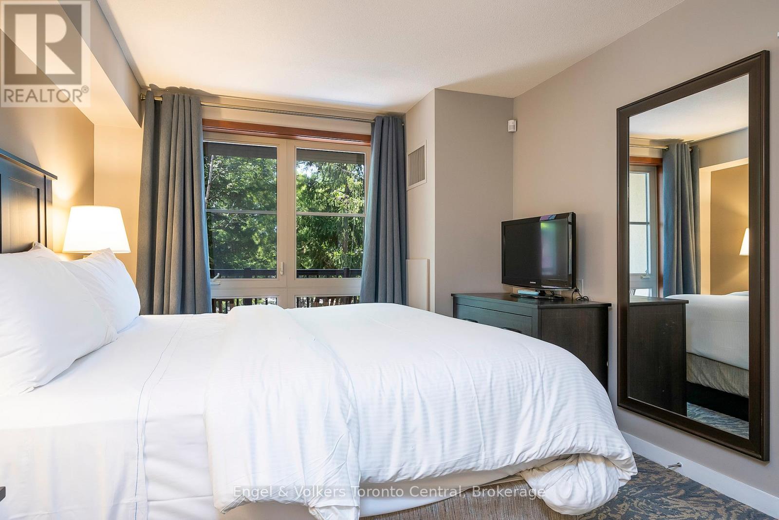 GRAND GEORGIAN ONE-BEDROOM PLUS DEN SLEEPS 6 - Fully furnished One Bedroom + Den in the beautiful Grand Georgian, located in Blue Mountain Village, Ontario's most popular four-season resort. Close to restaurants, shops, activities and amenities making your stay enjoyable. The Grand Georgian features an in-ground outdoor seasonal pool, 2 year round hot tubs, a sauna, exercise room and warm underground parking. Suite Sleeps up to 6! Full kitchen, large bathroom with double sinks! Enjoy the nice gas fireplace after a day on the ski hills. Very spacious with a king size bed in master with private access to 4 piece bathroom. Two pull out sofas. Choose to participate in optional Blue Mountain Resort Rental Pool Program that generates income and allows for personal use. Condo Fees include all utilities. This suite is currently in the Blue Mountain Resorts rental program. HST is applicable on the purchase price but can be deferred by the buyer obtaining an HST number. 2% Village Association Fee is applicable on closing. $1.08 per square foot annual Blue Mountain Village Association Membership fee paid quarterly. (id:64974)