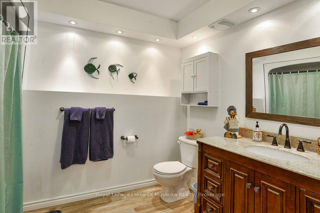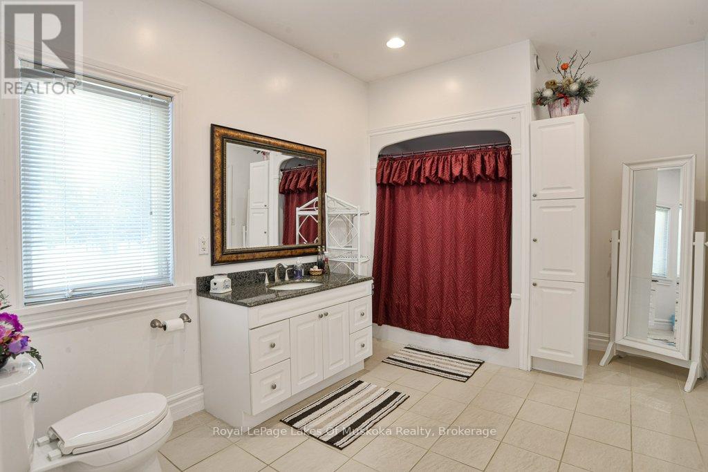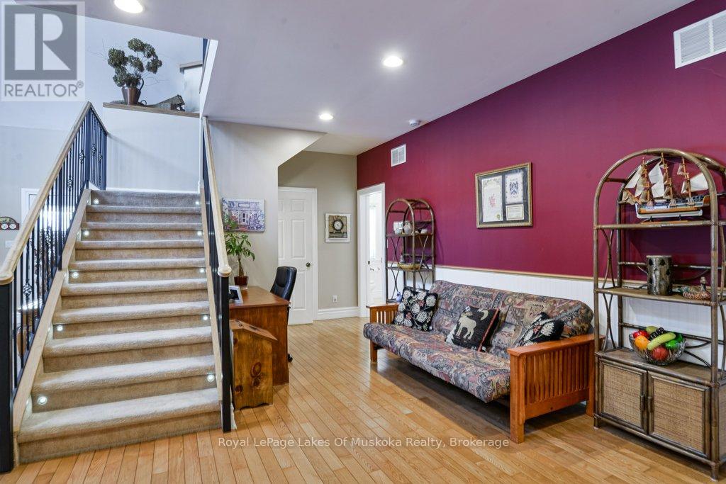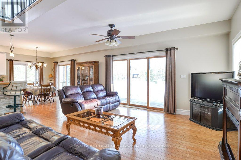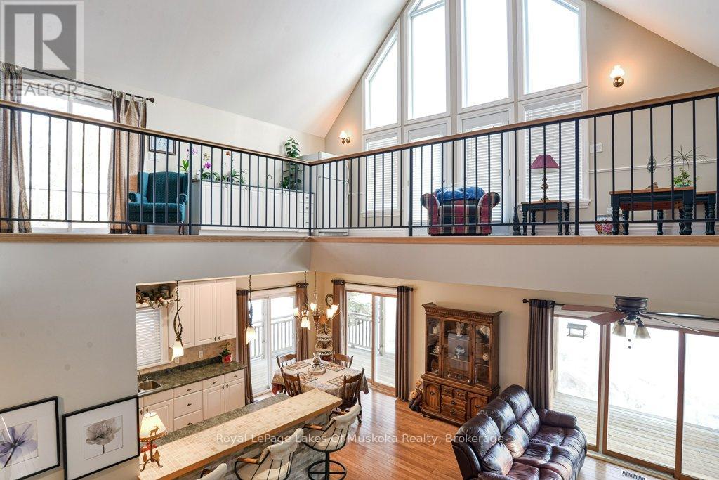 Welcome to your private country sanctuary nestled on a picturesque 2-acre lot overlooking a tranquil pond where birds and wildlife gather. This thoughtfully designed custom-built home with 3800sq. feet of living space offers the perfect blend of space, comfort, and Muskoka charm - ideal for extended family living or hosting overnight guests. Enjoy warm summer breezes from the expansive wrap-around veranda that flows seamlessly into a large, covered deck - perfect for outdoor dining and BBQs while taking in peaceful views of the pond and surrounding forest. Inside, the open-concept main floor welcomes you with soaring cathedral ceilings and gleaming red ash hardwood floors. The spacious primary bedroom is conveniently located on the main level, complete with patio doors leading to the backyard deck and pond views. A generous 4-piece bathroom and main floor laundry add to the home's functionality. Upstairs, a versatile loft with a wet bar opens through patio doors onto two large private balconies offering stunning forest views. Two additional bedrooms and another full 4-piece bathroom complete the upper level. The lower level presents incredible potential for approximately 1,400 sq. ft. of additional family accommodations. With above-grade windows and two walkouts to the backyard, the space is bright and welcoming. It currently includes a finished fourth bedroom, a third 4-piece bathroom, a spacious rec room, and a family room that could easily be completed as an eat-in kitchen. (Kitchen cabinets are included in the sale but not installed.) Adding even more charm is the adorable bunkie beside the home - perfect as a studio, workshop, or extra guest accommodations. Located just a short drive to town and only five minutes from the public beach on Prosect Lake, you can enjoy a refreshing swim or launch your watercraft for a day of fishing. This is Muskoka living at its finest - where you can work, live, and play surrounded by nature, privacy, and timeless country beauty. (id:64974)