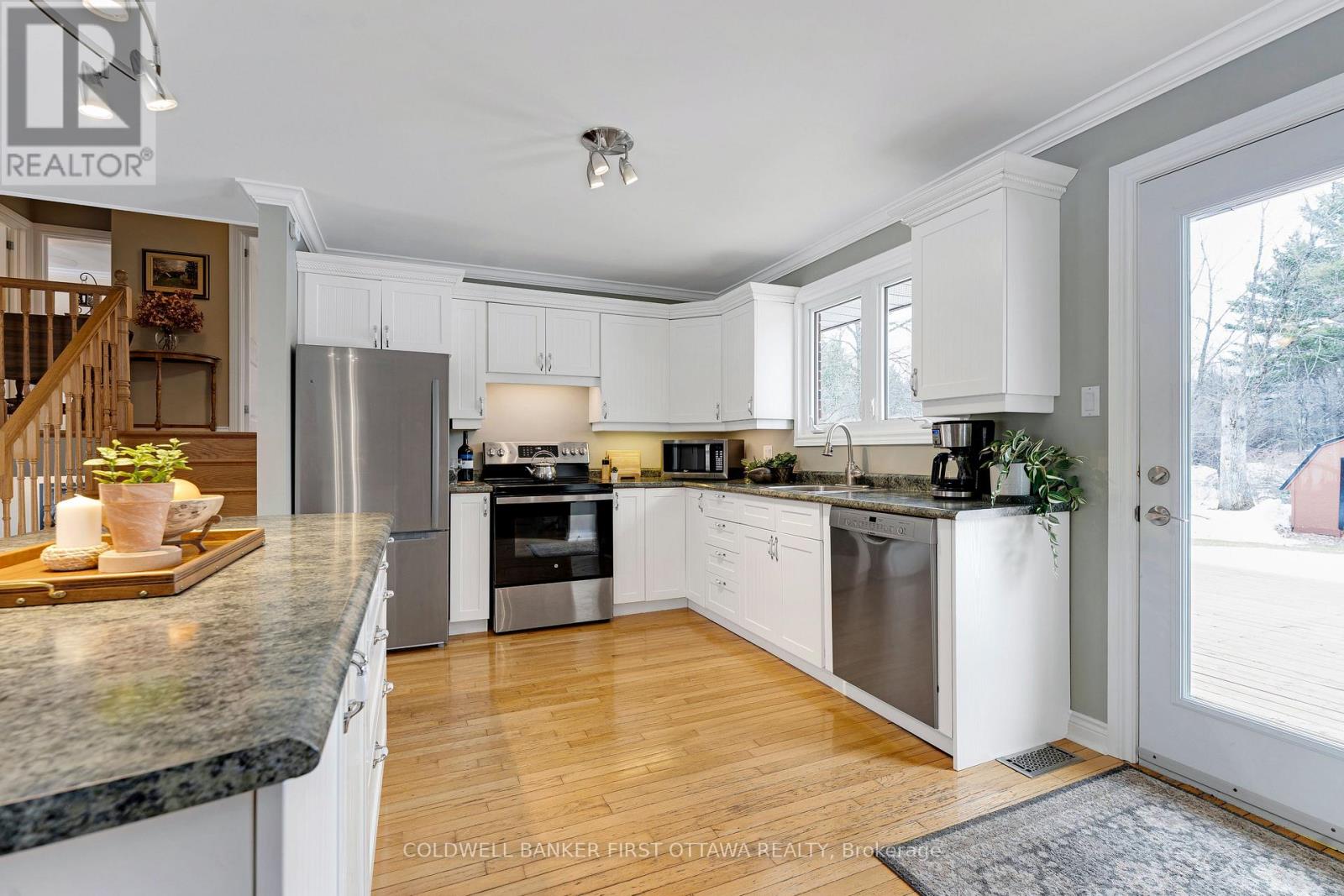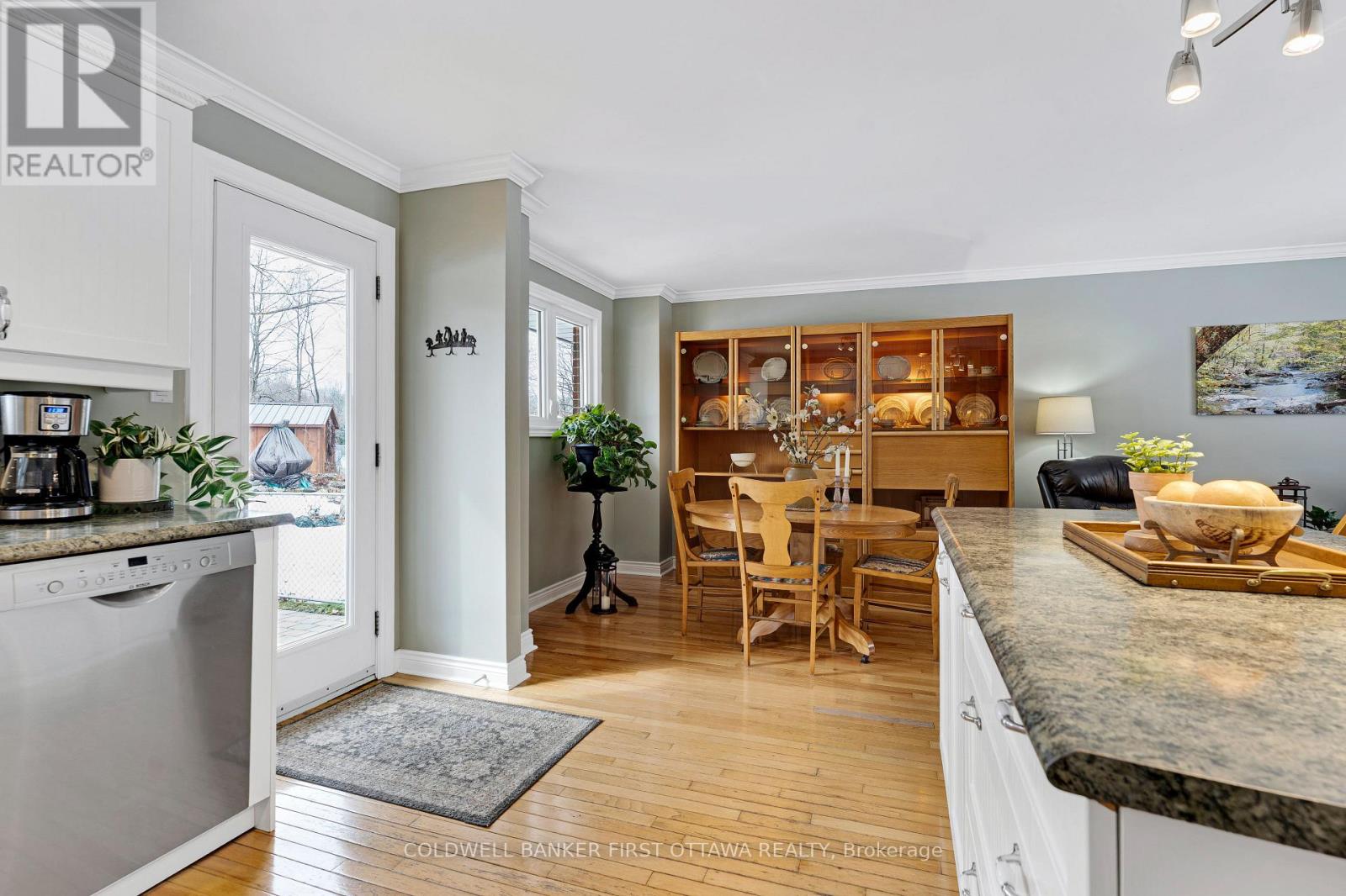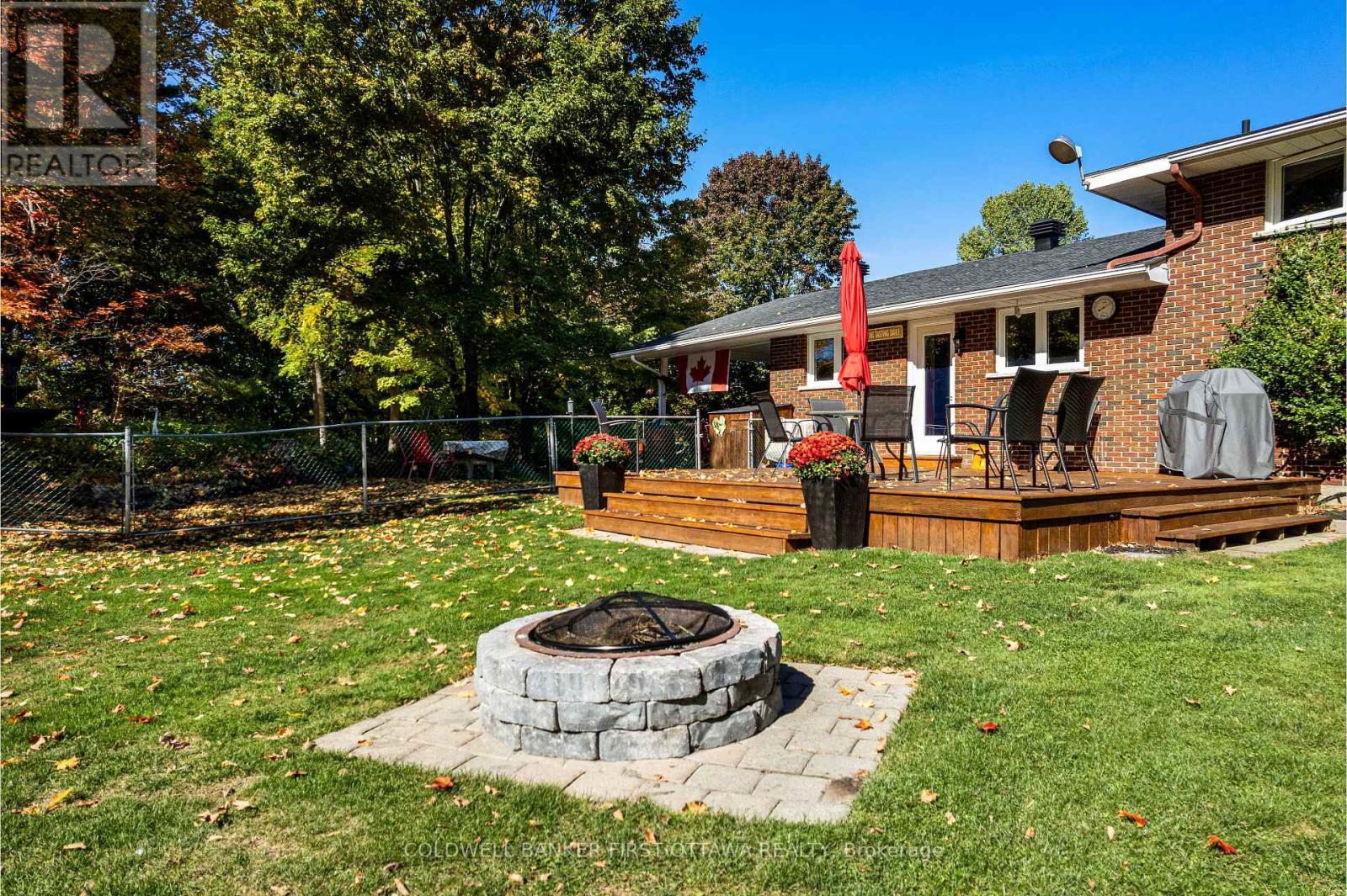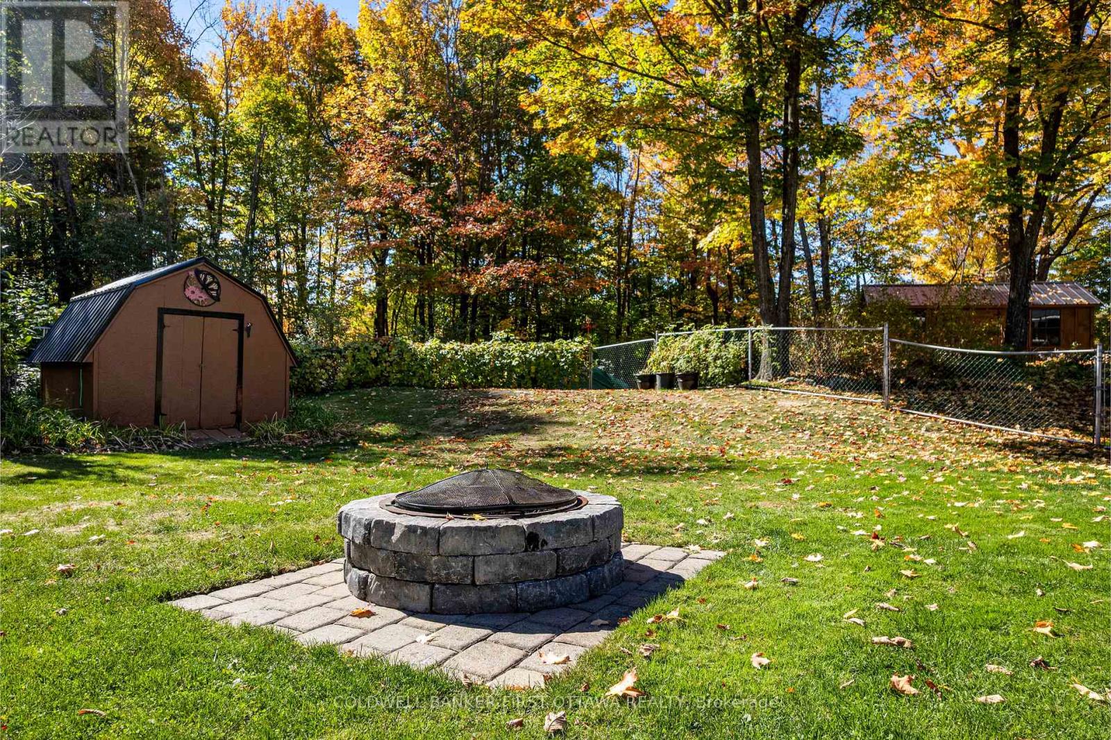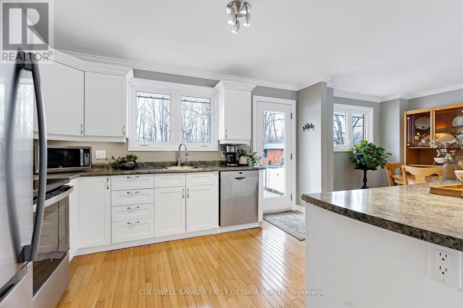 Tucked away on a beautifully treed 1.5 acre pie-shaped lot, this solid brick 3 bedroom side split is only 5 minutes to Perth! This well maintained home offers space, comfort, and versatility. Surrounded by mature trees, this home features a bright, inviting layout with custom kitchen cabinetry, hardwood floors, and refined finishes including crown moulding. The raised lower level featuring large windows, cozy propane fireplace (2020), bonus den, and ample storage. Enjoy outdoor living with a spacious deck (propane BBQ hookup), firepit, beautiful gardens with water fountain, and a large partially fenced yard. Two sheds add great functionality, including one with power - ideal for a workshop or hobby space. Major updates include Generac generator (2023), furnace & A/C (2019), pressure tank (2022), hot water tank (2024) and more. Minutes to the Rideau Ferry Yacht Club, and quick access to boating on Big Rideau Lake and Otty Lake. From fireside evenings to peaceful mornings on the deck, this property is all about lifestyle. (id:64974)