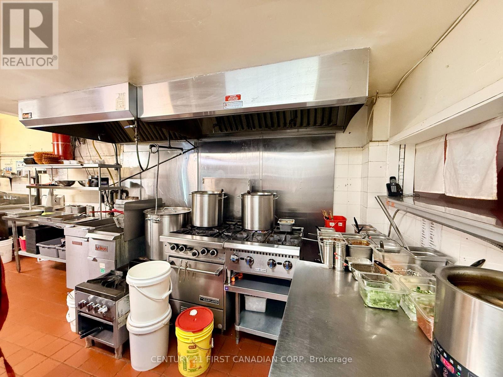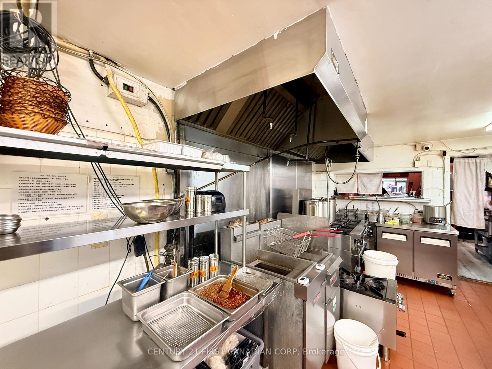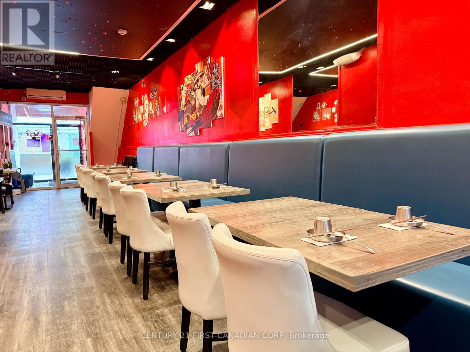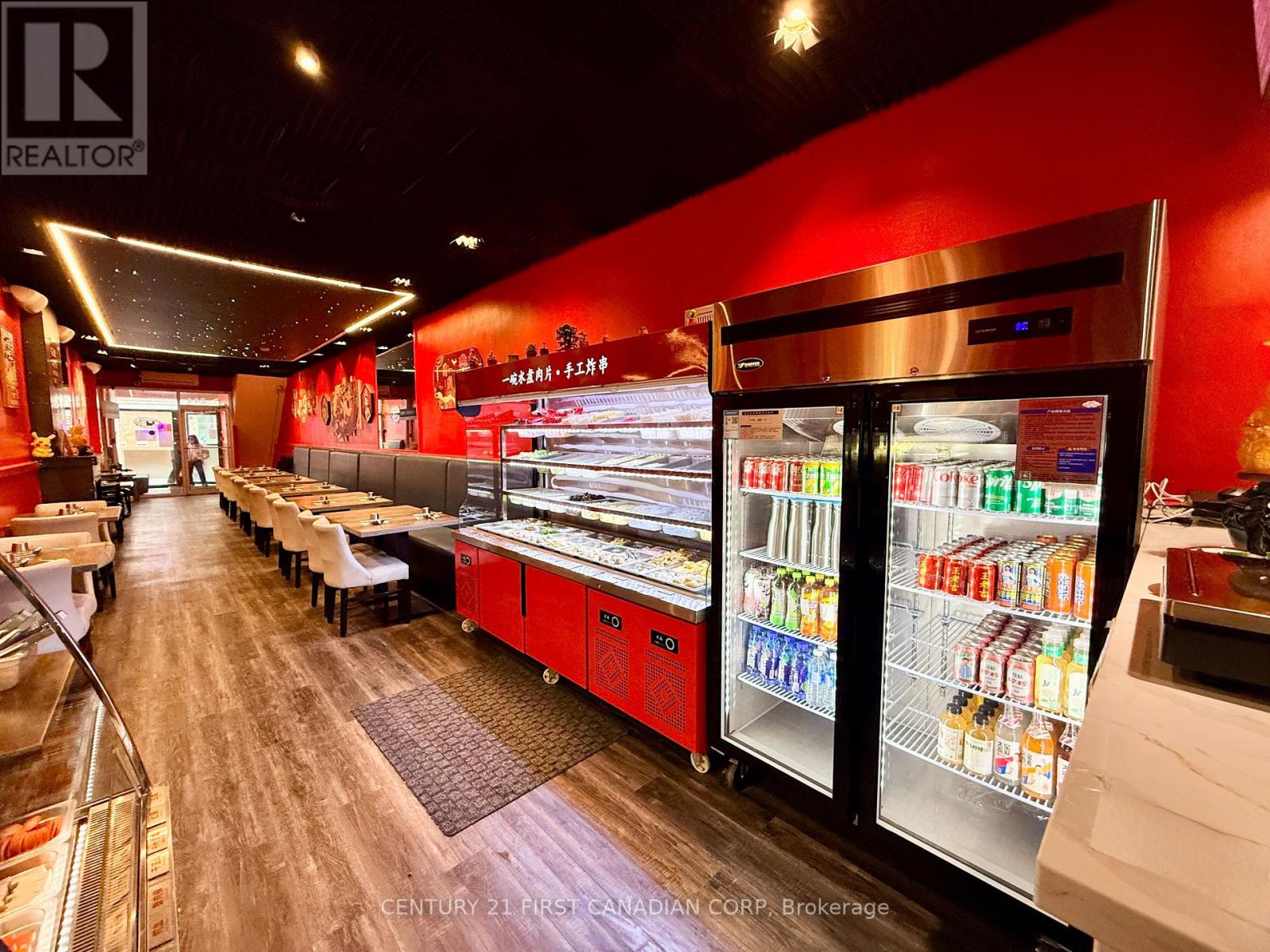 A fantastic opportunity to own a thriving business in the heart of London, Ontario. This impressive establishment offers 2,100 sqft of space, making it ideal for culinary professionals and aspiring entrepreneurs alike. Step into the beautifully renovated dining area, an inviting space that comfortably accommodates up to 45 guests. Renovated just 2 years ago, the dining room features a stunning built-in starlight ceiling, creating a warm and captivating ambiance that enhances the overall dining experience. Behind the scenes, the restaurant boasts a spacious, fully equipped kitchen designed to support efficient operations. It includes a commercial new hood, deep fryer, electric and gas ovens, 9 freezers, a walk-in cooler, and generous prep space, providing everything needed for a high-functioning kitchen. The lease also includes access to the basement for additional storage, allowing for a well-organized and streamlined restaurant operation. (id:64974)