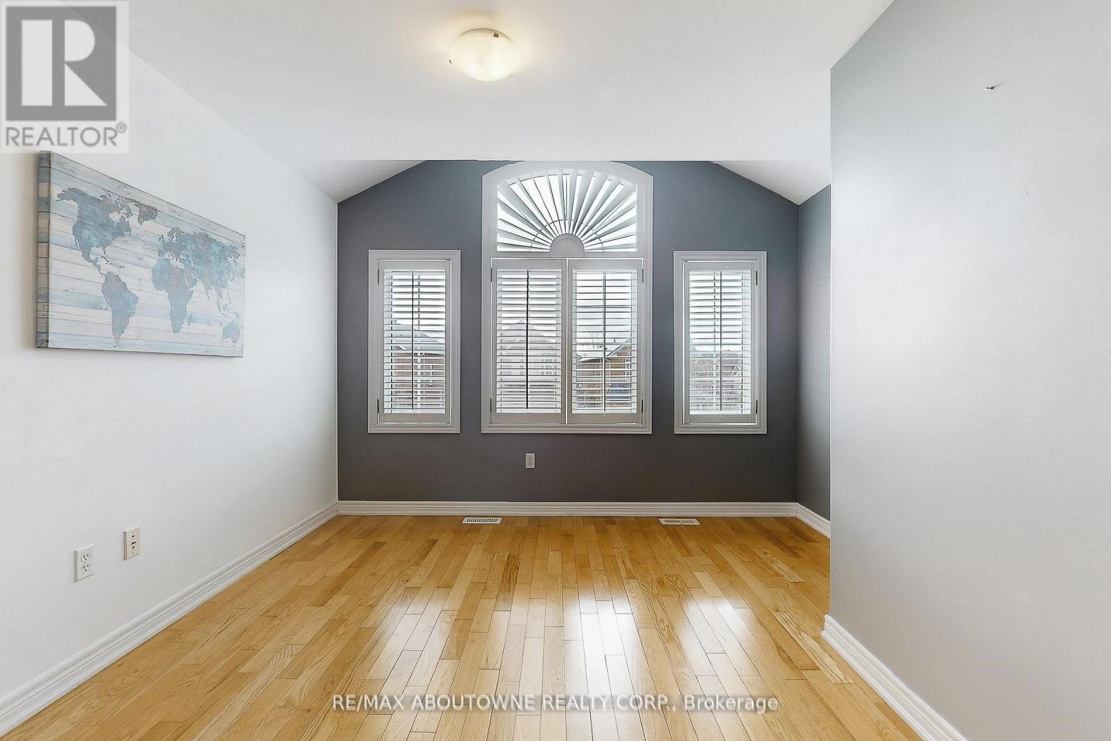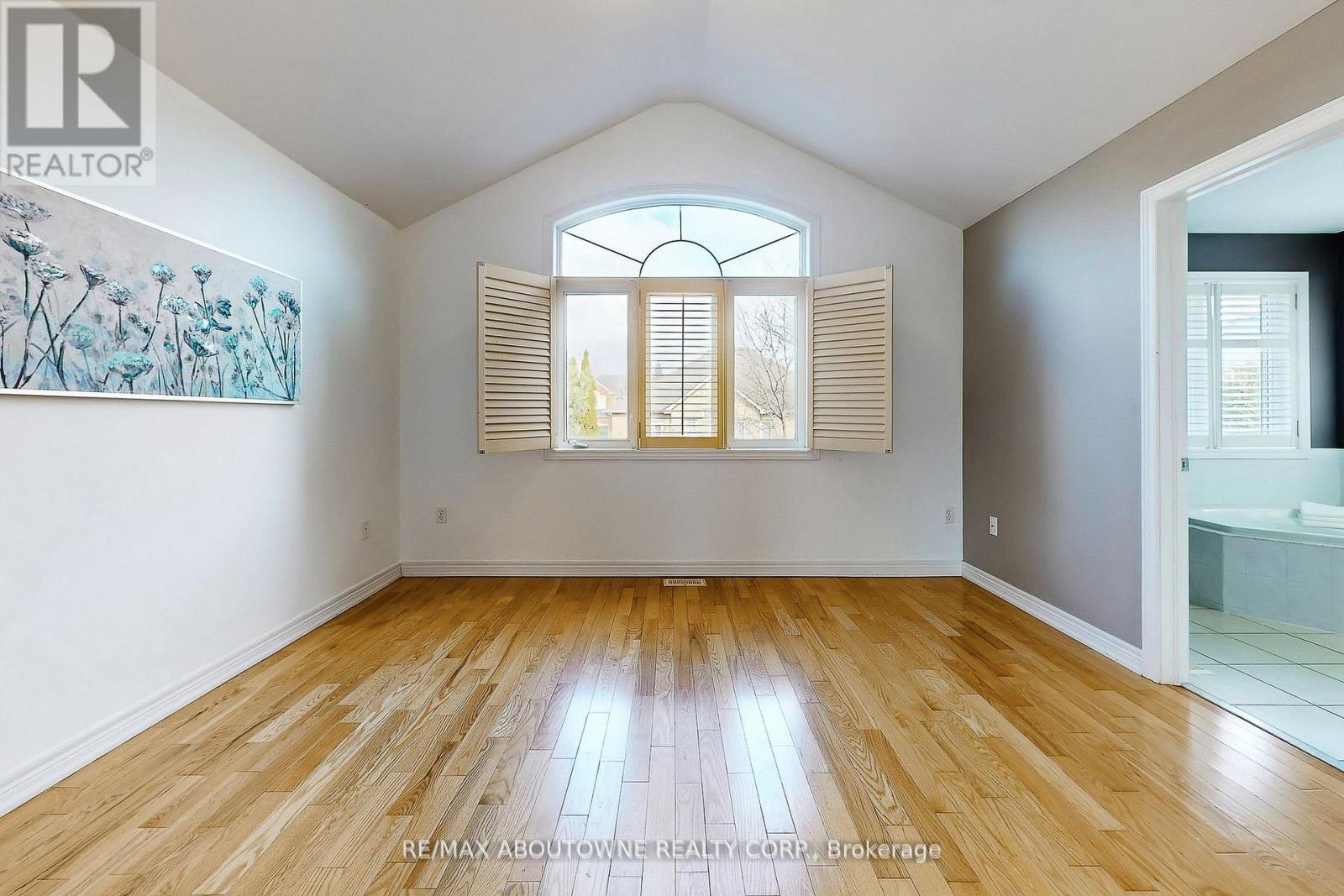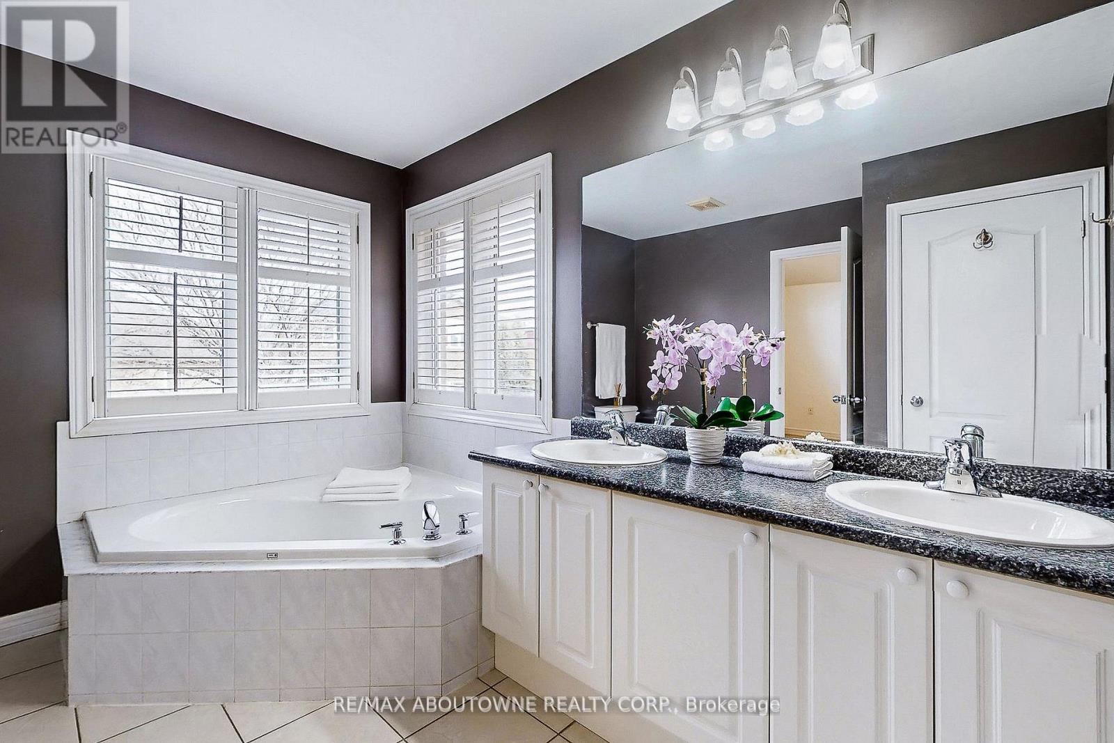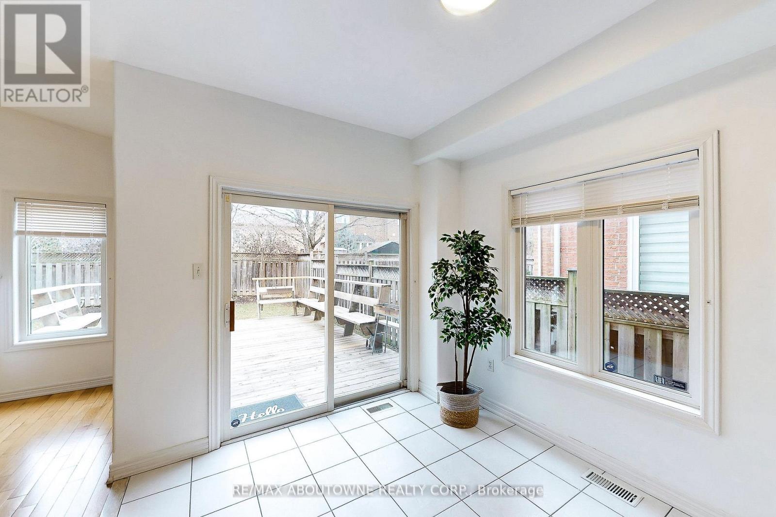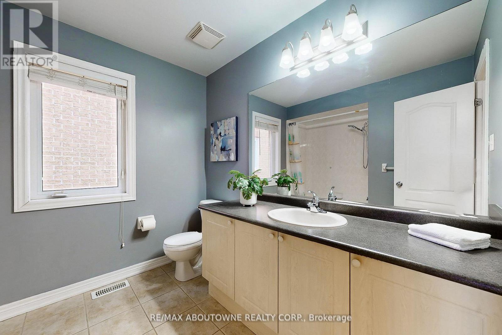 Welcome to this bright and beautifully maintained detached home located in the highly sought-after Joshua Creek community of Oakville, within the catchment of the highly regarded Joshua Creek Public School and Iroquois Ridge High School. Situated on a quiet, family-friendly street, this home offers a peaceful setting while remaining conveniently close to parks, community centres, shopping, and major highways including 403,407, and QEW. The home features 3 bedrooms and 4 bathrooms. A welcoming front porch and elegant entrance with glass panels allow natural light to flow into the home. The open-concept main floor features 9-ft ceilings and hardwood flooring throughout the living and dining areas, while the kitchen and hallway are finished with ceramic tile. The living room is centred around a gas fireplace, highlighted by a distinctive half moon accent window and large windows on either side, creating a bright and inviting space. The kitchen features granite countertops, stainless steel appliances, and a mosaic backsplash, and flows into a bright breakfast area. Large sliding doors lead to a spacious wooden deck and fully fenced backyard, complete with a children's play structure (included) - ideal for outdoor entertaining and family enjoyment. Upstairs offers three bright bedrooms and two full bathrooms, including one bedroom featuring a beautiful architectural window design that fills the room with natural light. The primary bedroom features a vaulted ceiling, large windows, and two separate closets providing generous storage. The ensuite includes a double vanity, soaker tub, and separate shower. The finished basement adds additional living space with a recreation area and a 3-piecebathroom, offering flexibility for a home office, gym, or guest space. Located in one of Oakville's most desirable school zones, this home offers a wonderful combination of comfort, functionality, and location. (id:64974)