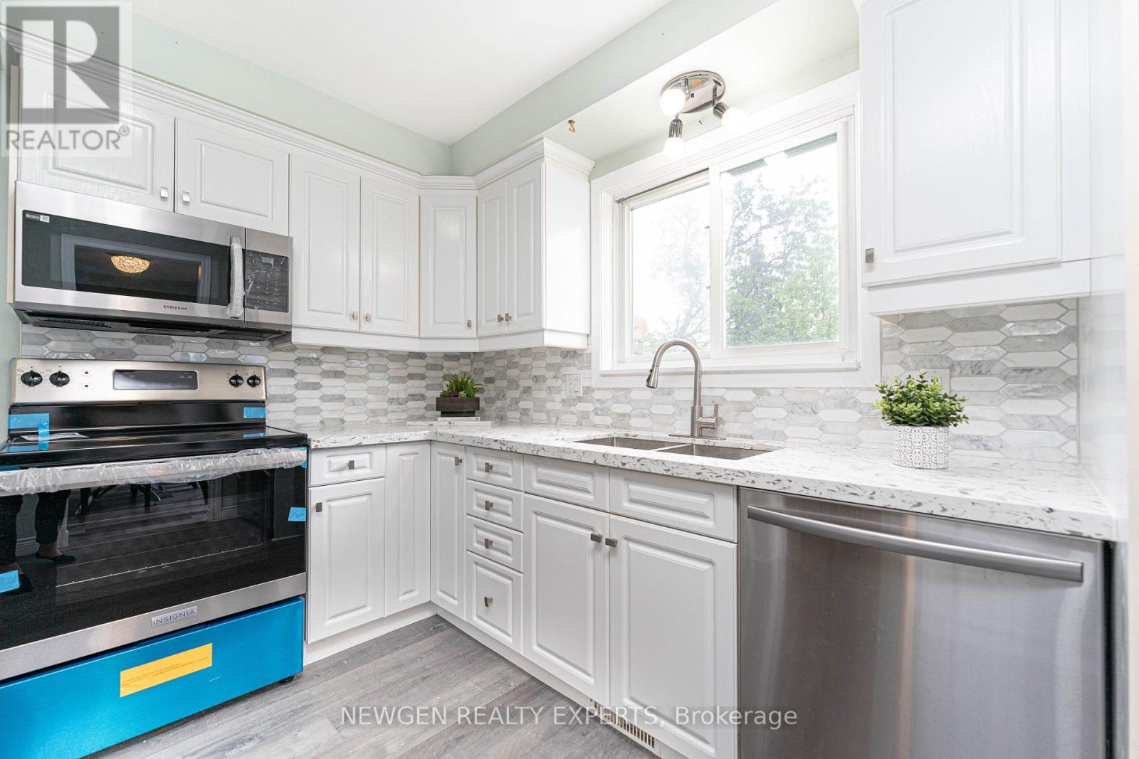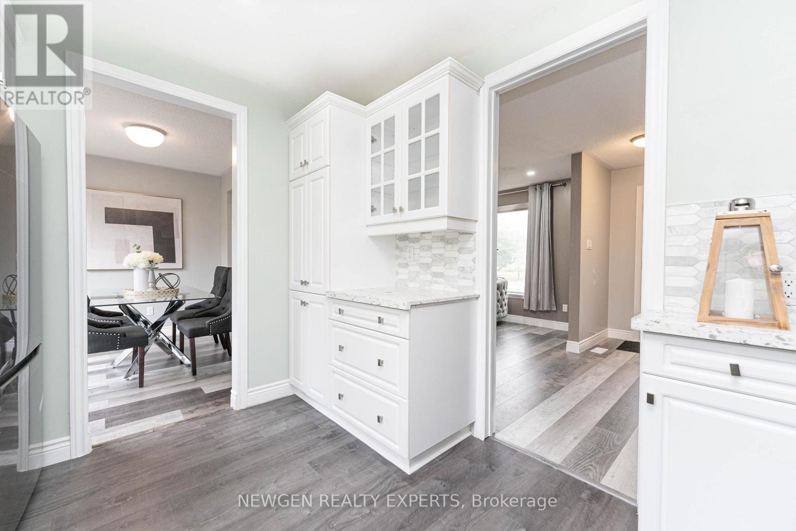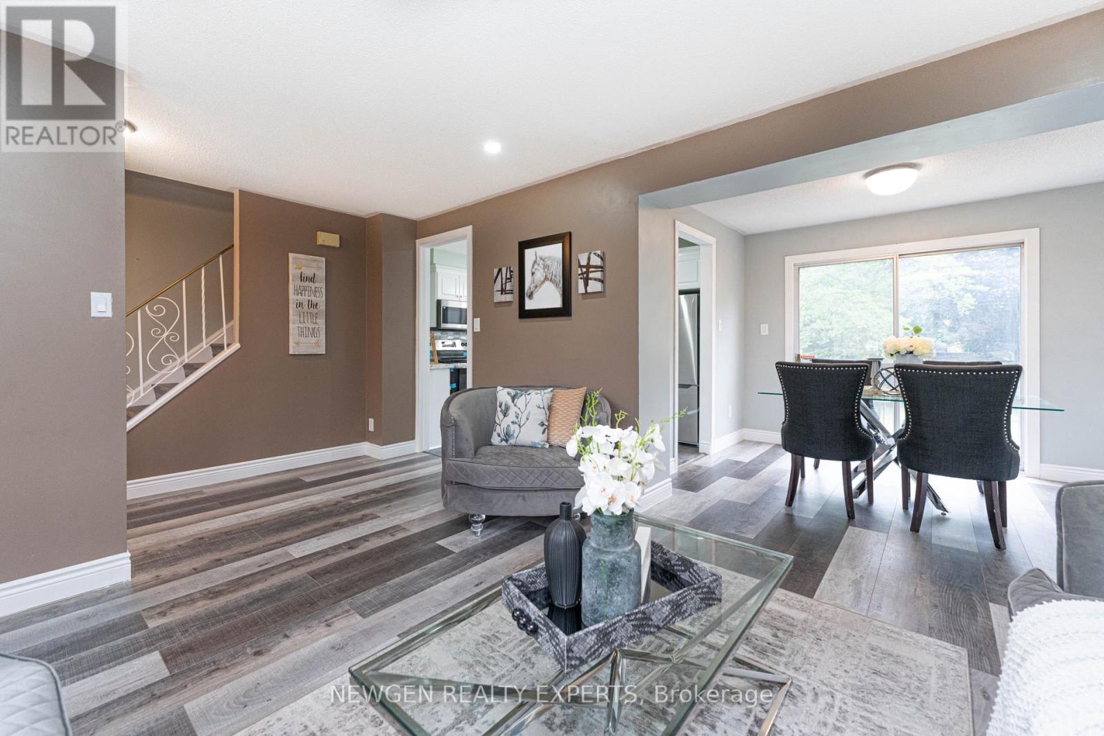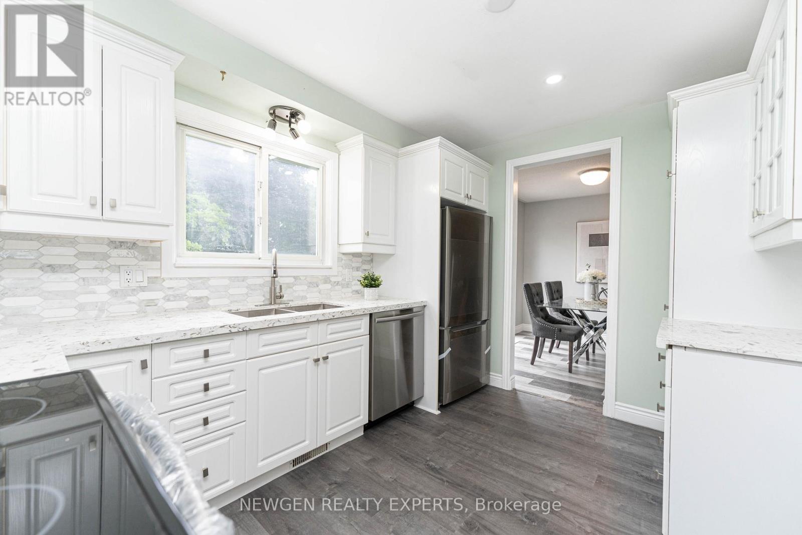 Welcome to 2458 Martin Court a beautifully upgraded semi-detached home tucked away on a quiet cul-de-sac in one of Burlington's friendliest neighbourhoods. This fully renovated, open-concept gem offers over 1800 sq ft of stylish living space and is truly move-in ready. Step into the bright and airy kitchen featuring quartz countertops, sleek stainless steel appliances, and a view of the backyard perfect for everyday living and effortless entertaining. Engineered hardwood flooring flows throughout the main level, enhancing the homes modern, cohesive feel. The sun-filled living room offers a large bay window that floods the space with natural light and opens to a dining area with a walkout to the backyard patio. Upstairs, you'll find three generously sized bedrooms with ample storage and a renovated main bath complete with elegant tile and a tub/shower combo. The professionally finished basement includes a cozy entertainment space, a second full bath with a walk-in shower, and the potential to be converted into an in-law suite. Enjoy summer evenings in the private backyard featuring an aggregate patio, lush greenery, mature trees, and beautiful landscaping for maximum privacy. With parking for three cars and the option to extend the driveway, this home checks all the boxes. Just minutes to the lake, parks, trails, and all major amenities, with quick highway access to the 407 and QEW this is Burlington living at its best. (id:64974)