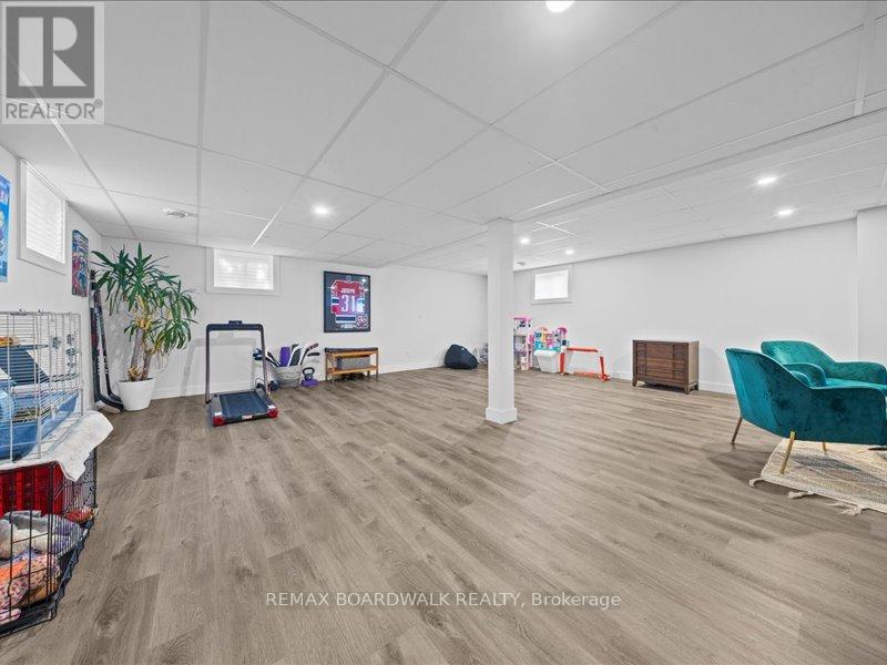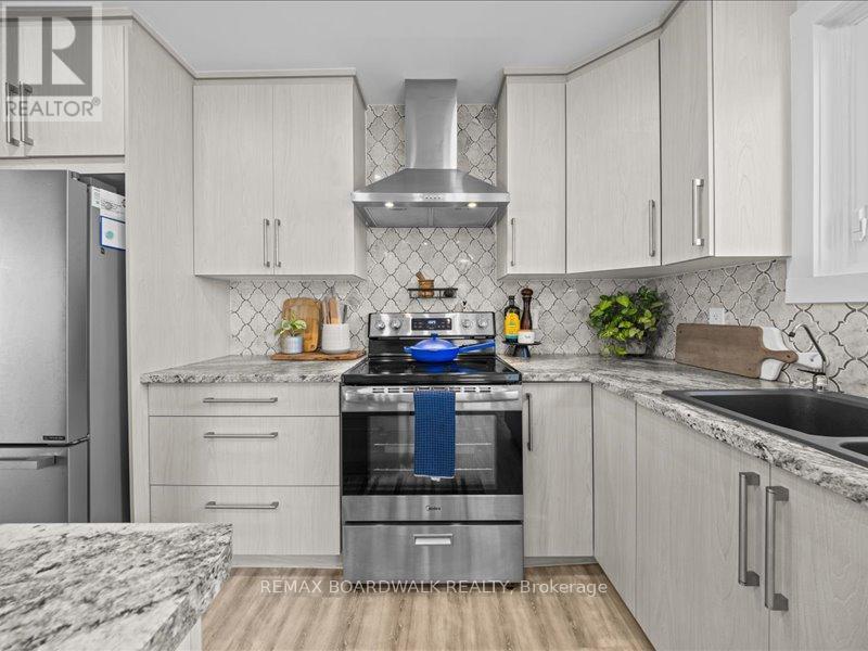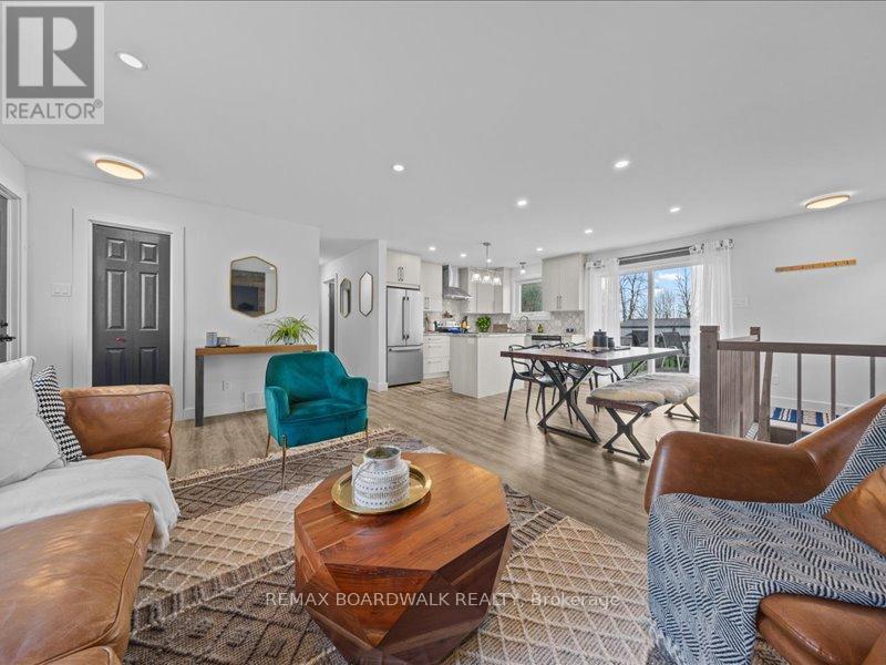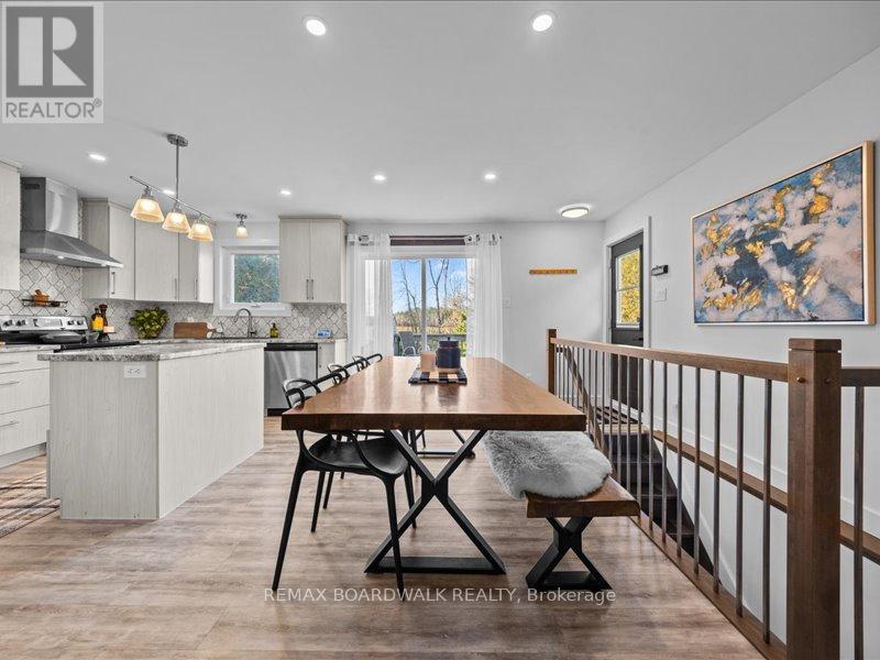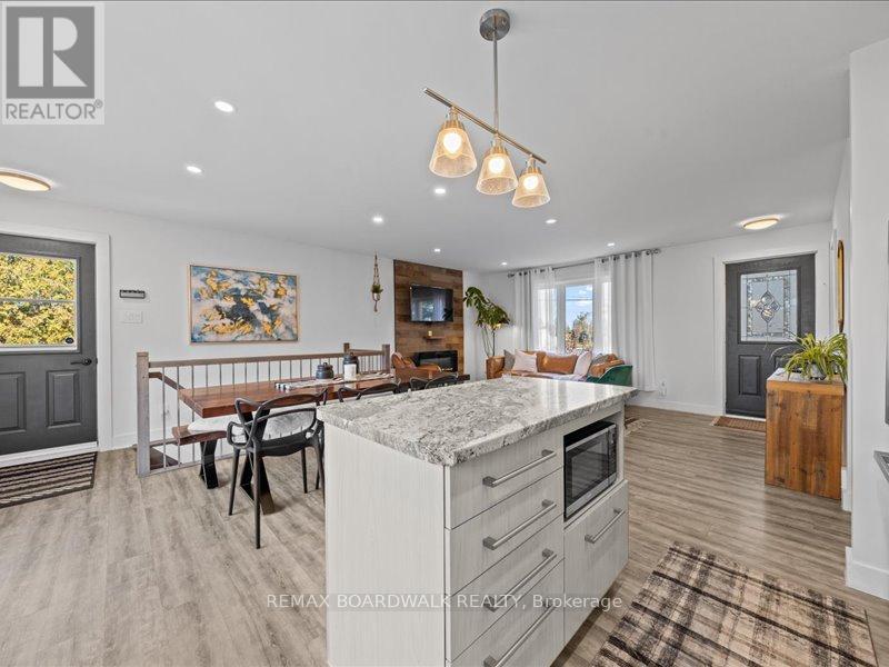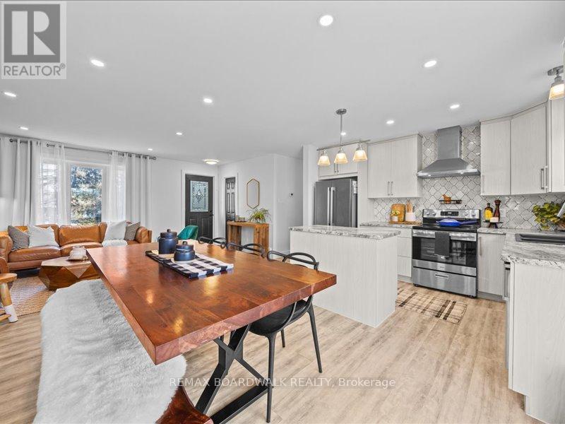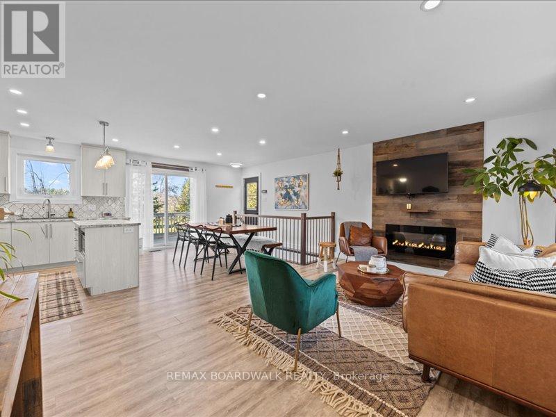 Welcome to this beautifully updated 3-bedroom, 1-bath bungalow featuring a bright open-concept flat ceilings and pot lights throughout. Located in Cumberland, just 5 min from Orleans. The living, dining, and kitchen areas flow seamlessly together, highlighted by luxury vinyl flooring and a modern fireplace with a warm wood-accent surround. The updated kitchen features stainless steel appliances, a double sink, a tiled backsplash, a centre island, and ample workspace for cooking and entertaining. A patio door off the dining area leads to a large deck overlooking the private yard, surrounded by mature hedges and complete with a storage shed. The home offers three comfortable bedrooms, including a spacious primary bedroom with ample closet space. The fully updated 5-piece bathroom features dual sinks and a white subway tile bathtub surround for a clean, modern look. Additional highlights include vinyl windows, a newer roof, a newer furnace, and a newer septic tank. Recent upgrades include septic tank, plumbing, electrical, insulation, water softener, reverse osmosis system, well pump, and parging, along with kitchen, bath, flooring, Vinyl windows, furnace, and Roof. The property also features a convenient drive-thru driveway from Dunning Road to French Hill Road. A hardwood staircase with metal spindles leads to the lower level, where you'll find a bright laundry room and a spacious rec room with five large windows and a suspended ceiling with pot lights, offering plenty of potential for an additional bedroom and bathroom. This move-in-ready home blends modern updates with functional living in a peaceful setting, just minutes from city convenience. (id:64974)
