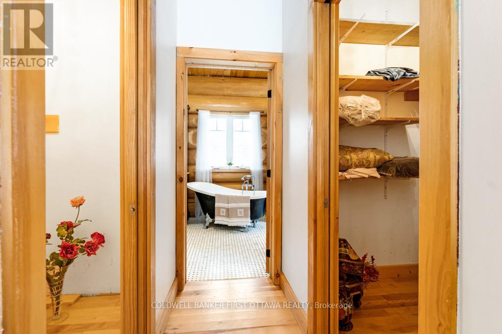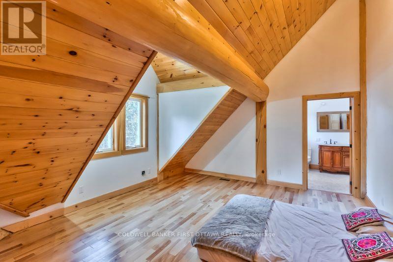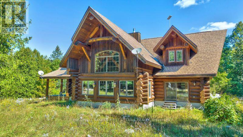 It is so quiet on this 60 acres, you can hear the sound of crickets and songs of birds. The big beautiful sky has Canada geese flying back home and in the evening, starry galaxy. Tucked into all this beauty, quality built log home with amazing spaces. The huge 1ft diameter logs are architectural marvel, adding solid character. The 4 bedroom, 4 bathroom home has easy flow layout, soaring ceilings, walls of windows with deep sills and floors of select-ash hardwood plus ceramic tile. Front foyer welcomes you with dramatic 22' high ceiling and dream walk-in closet. Great Room showcases majestic two-storey cultured stone fireplace and impressive cathedral ceiling with honey-hued, light-reflecting, beams. Expansive dining room connects Great Room to kitchen and has door to covered verandah. Exquisite kitchen a culinary delight with phenomenal select-cherry cabinetry, Cambria quartz counters, breakfast bar and deep window sills. Added design feature is refrigerator being integrated into the cabinetry. Modern Elmira cookstove makes food prep easier with its four propane burners, three electric burners and electric oven. Main floor generous primary suite offers two walk-in closets and patio doors to the great outdoors; spa 5-piece ensuite has marble floor, marble counters on the two teak vanities, large deep soaker tub and glass shower. On other side of the home is the family-sized mudroom with easy-clean ceramic tile floor, oversized closet and laundry station. Main floor also has powder room. Log staircase leads up to second floor landing with flex space. Two extra-large bedrooms share 5-piece Jack & Jill bathroom. Fourth bedroom includes luxury 5-piece ensuite. Outside, the yard provides lots of space for gardening & play. The bunkie need some finishing for guests or, possible studio. The forest backs onto Indian River where, depending on the season, you can canoe to Robbs Lake. Hi-speed & cell service. On township maintained road, 25 mins to Almonte. 45 mins Kanata. (id:64974)