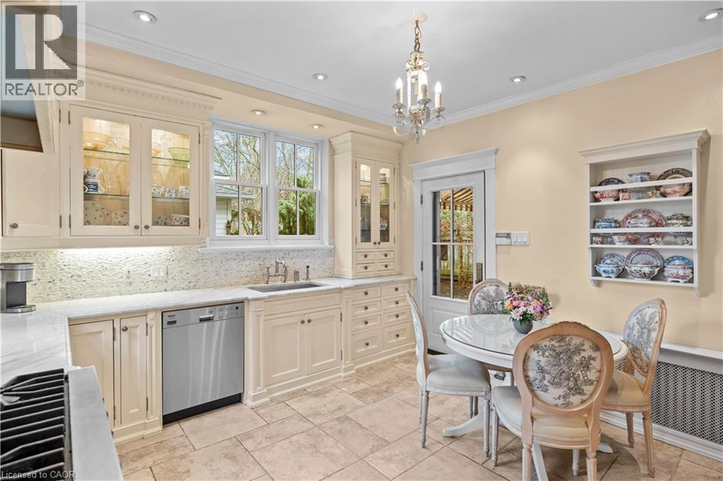This stately 2.5-stry residence sits on a mature 46’ x 85.33’ lot in Hamilton’s prestigious Durand neighbourhood. Showcasing timeless curb appeal, the front walkway leads to a covered porch framed by Doric columns & an entry door w/ wrought-iron grillwork. Inside, a grand foyer w/ crown moulding, a sweeping staircase & French doors introduces elegant principal rms. The formal liv rm feat a gas FP, an intricate mantle w/ hidden side cabinet, & windows overlooking both gardens. The adjoining din rm impresses w/ built-in cabinetry, leaded stained glass, and rich millwork throughout. The kitchen is a showpiece, featuring heated limestone floors, custom cabinetry w/ beveled glass, marble counters, undercab lighting, pantry, & premium S/S appliances incl a Viking gas range, Sub-Zero fridge, & Miele d/w. Surrounded by windows, it opens to a covered porch w/ a Phantom screen, perfect for indoor-outdoor living. A handy mudroom w/ dbl mirrored closet completes the main lvl. Heading up the main staircase, a landing of stained glass welcomes you to the 2nd level, feat a 25.9’ x 13’ primary suite w/ sitting area, dual closets, & access to a bright den/sunroom (heated flrs). 2 add’l bdrms - one w/ a bay window & ensuite, the other with garden views - plus a 4-pc bath w/ a jetted tub, stained glass, & hand-painted murals complete this lvl. The 3rd lvl offers a private bdrm retreat w/ a 3-pc ensuite, skylights, gas FP, storage, & cozy sitting nooks. The lower lvl adds laundry w/ custom cabinetry, a 2-pc bath, storage & workshop space. Outside, enjoy a private yard w/ a fountain, covered composite porch, retractable awning, gas BBQ hookup, detached garage + surfaced parking for 2 & security lighting. Add feat incl: hardwood flrs, custom window coverings, c/air, HEPA air purifier, a security sys & more. Walkable to the Locke St cafés, boutiques, art galleries, hospitals, GO Transit, parks & trails - Durand offers historic character & an unmatched lifestyle of quiet sophistication. (id:64974)