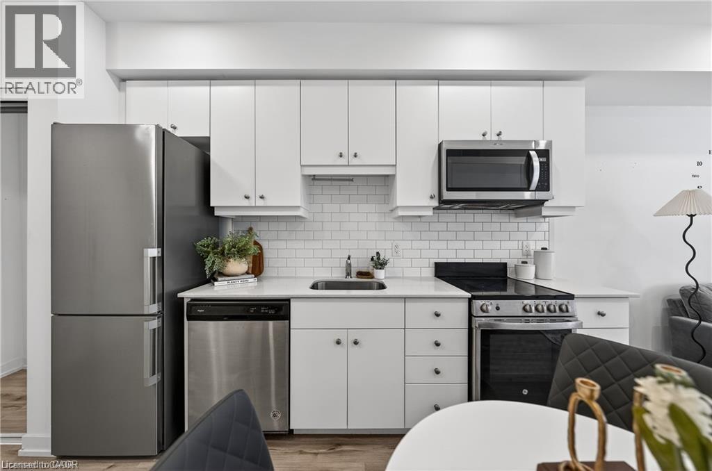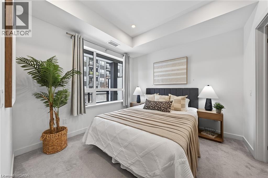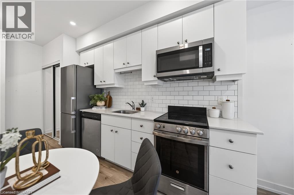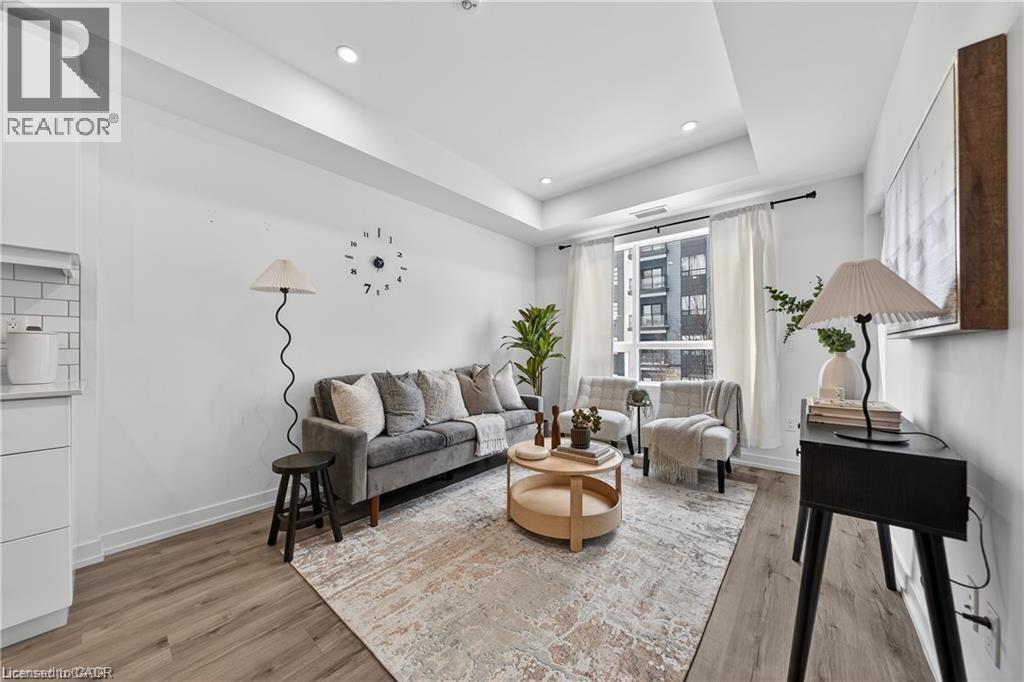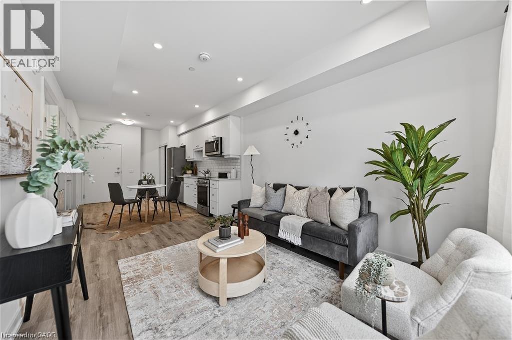 Available MAY 1st! Discover low-maintenance, modern living in the heart of Waterloo. Unit 210 at the Blackstone is a bright, airy 1-bedroom, 1-bath condo offering 573 sq ft of comfortable space. Tall ceilings and built-in blinds enhance the open-concept layout. The kitchen is equipped with stainless steel appliances, durable stone countertops and a contemporary tile backsplash, flowing into the cozy living area with walkout to a private balcony - perfect for morning coffee or evening relaxation. The carpeted bedroom includes a roomy walk-in closet and the 4-piece bathroom is well-appointed. Practical conveniences include in-suite laundry, a storage locker and one underground parking space. The building elevates daily living with plentiful amenities: rooftop terrace with BBQs, exercise room, courtyard with BBQ and firepit, party/study room, bike room and visitor parking. Ideally situated close to Conestoga Mall, grocery stores, restaurants (including Browns Socialhouse), St. Jacobs Market, walking trails and public transit. Ideal for professionals or anyone seeking a well-located, amenity-rich rental in Waterloo. (id:64974)