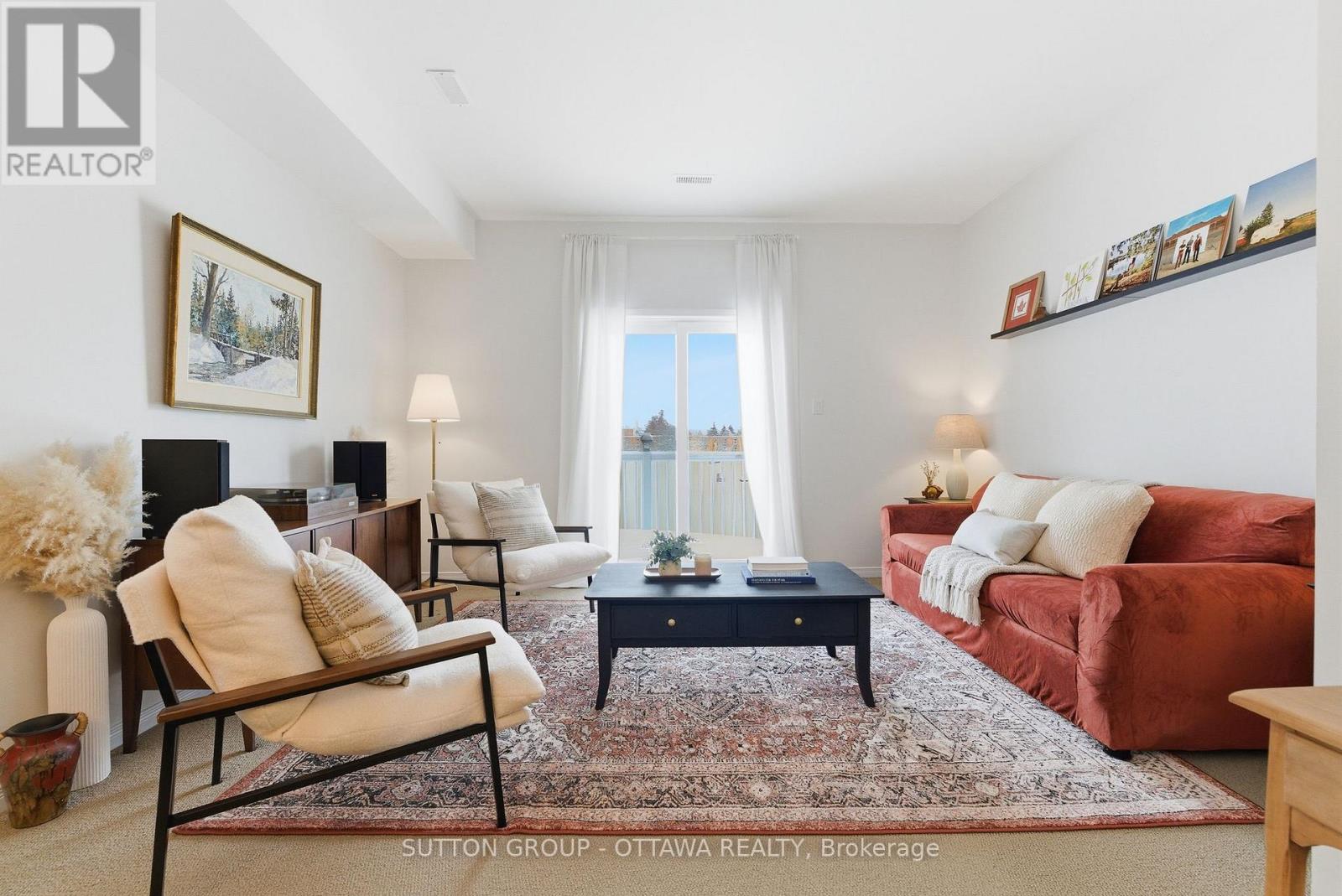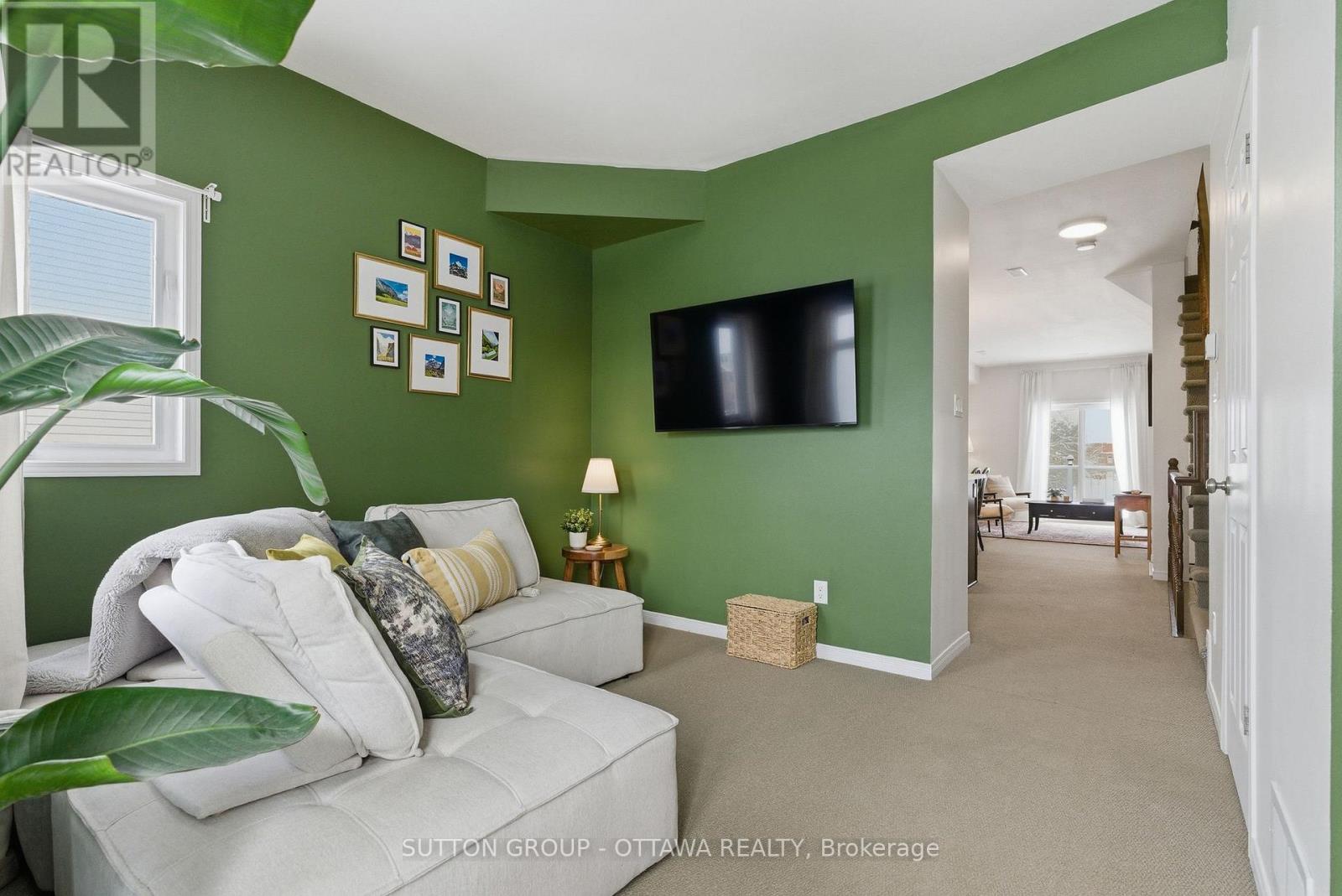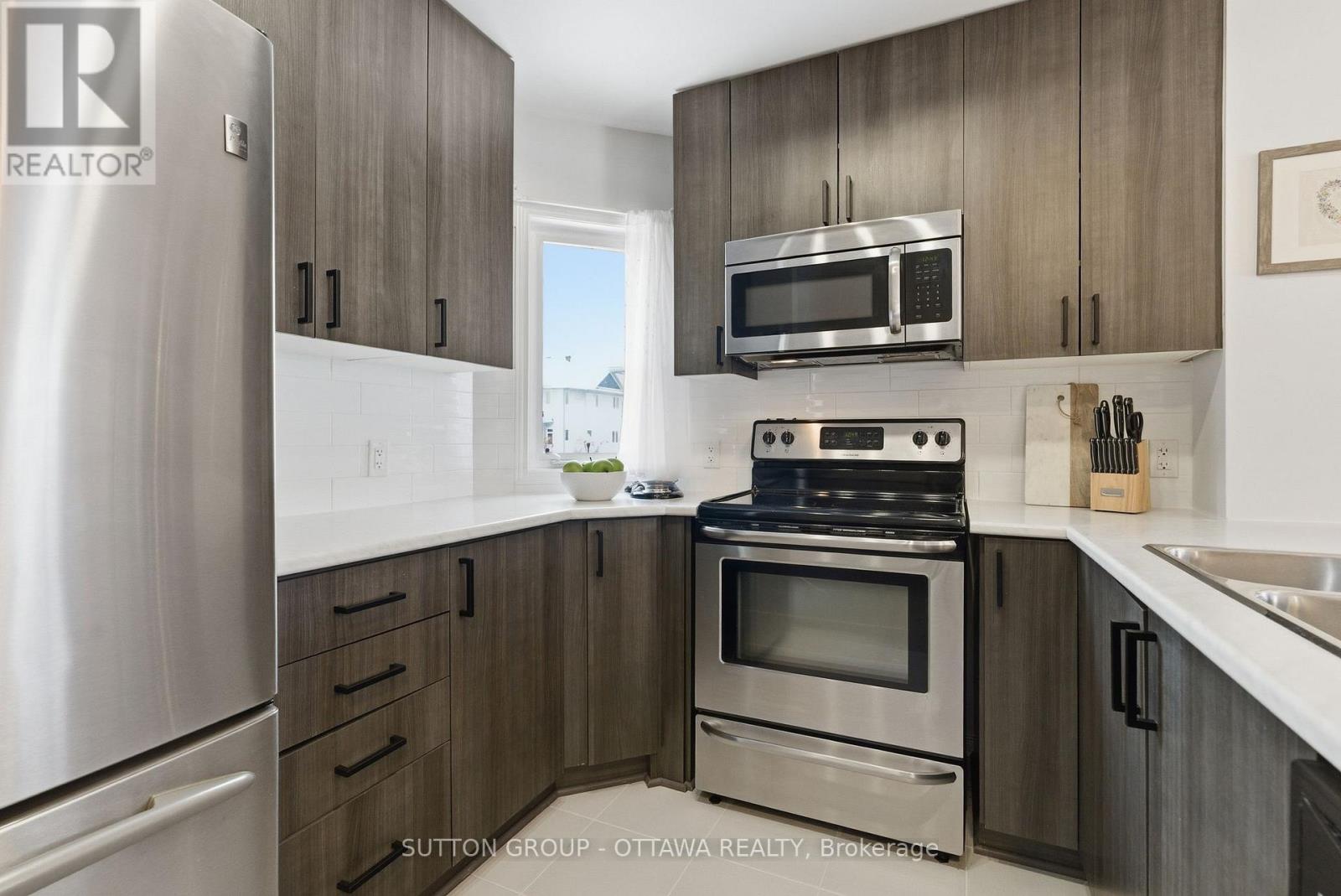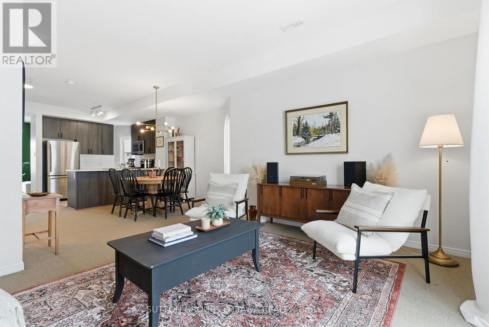 Rarely offered 3 BEDROOM UPPER END UNIT! This tastefully updated 3 bedroom, 2 bathroom unit in the heart of Kemptville is sure to please! Flooded with natural light, the main level boasts an open concept floor plan, upgraded lighting and 9 foot ceilings. The functional kitchen offers stainless steel appliances, sleek backsplash and a peninsula with overhang for added seating. Enjoy summer days lounging on the private, sunny balcony. The bonus main level den with cozy vibes is perfect for working from home, using as a lounge/TV area (as it's set up now), or sending the kids to play! Upstairs, the primary bedroom features double closets as well as access to an additional second-level balcony. Two great sized bedrooms, a linen closet, stacked laundry and a full bathroom complete this level. Upgraded smooth ceilings on the main level + primary bedroom as well as designer paint choices throughout give this unit a crisp, clean finish. Parking is conveniently located directly in front of the unit's entrance. You're a quick 5-minute drive to anything you could possibly need: groceries, restaurants, shops, and more! Or, walk to downtown Kemptville in less than 20 mins where you'll find the library, bakery, pizza shop, clothing boutique, etc. etc.! Condo fees include water. Book a showing today! (id:64974)