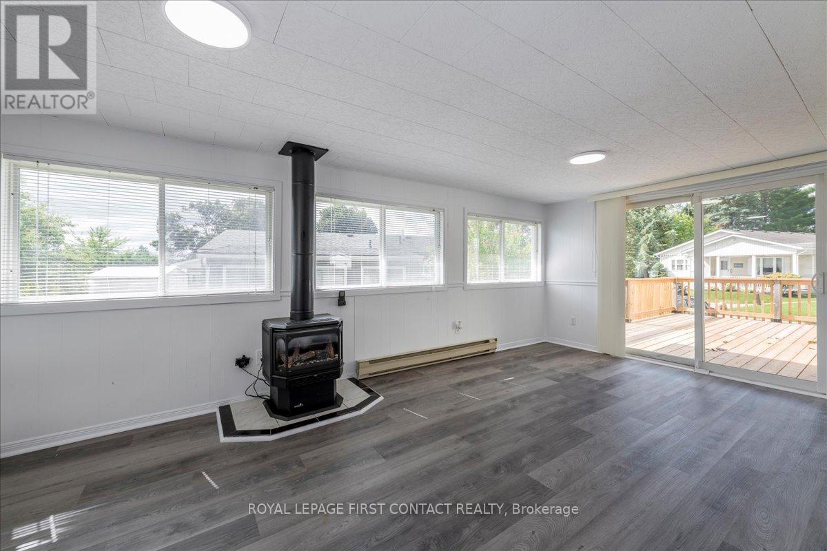 This home is sure to please. Located in the vibrant adult community of Sandycove Acres South. This bright and spacious 2 bedroom, 1+1 bath popular Argus model has a large family room with a gas fireplace and walk out to a spacious deck large enough for lounge chairs to enjoy the outdoors. The flooring has been updated with quality vinyl plank throughout the entire home with no transitions and the walls are painted in a bright neutral white. The galley style kitchen has been totally updated with new cupboards, quartz countertops, undermount sink with faucet and tiled backsplash, new stainless-steel appliances including a built in microwave over the stove. The bathrooms have also been totally updated with new quartz counter vanities, sinks, taps, mirrors, lighting and the main bathroom has a new spa like walk-in shower with soft close glass doors. This extensively improved home is move in ready with newer gas furnace, central air conditioner and windows (2013), shingles (2010) and back deck with steps (2024). The laundry area next to the kitchen has white side by side washer and dryer with storage above and a large pantry closet. Private side by side 2 car parking with level access to the front door and convenient access to the side door. Sandycove Acres is close to Lake Simcoe, Innisfil Beach Park, Alcona, Stroud, Barrie and HWY 400. There are many groups and activities to participate in along with 2 heated outdoor pools, 3 community halls, wood shop, games room, fitness centre, and outdoor shuffleboard and pickle ball courts. New lease fees are $717.24/mo lease and $116.08 /mo taxes. Come visit your home to stay and book your showing today. (id:64974)