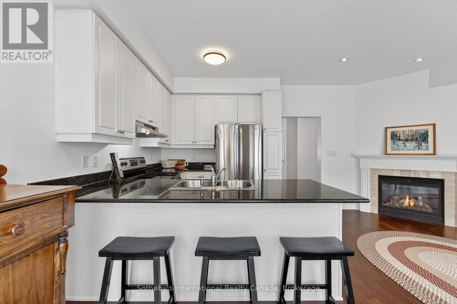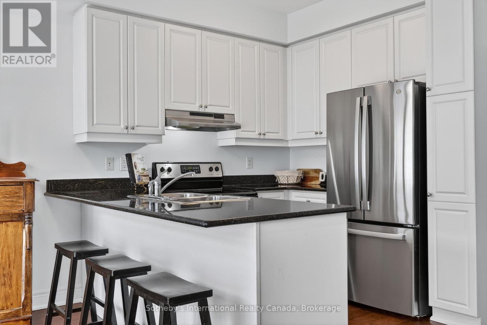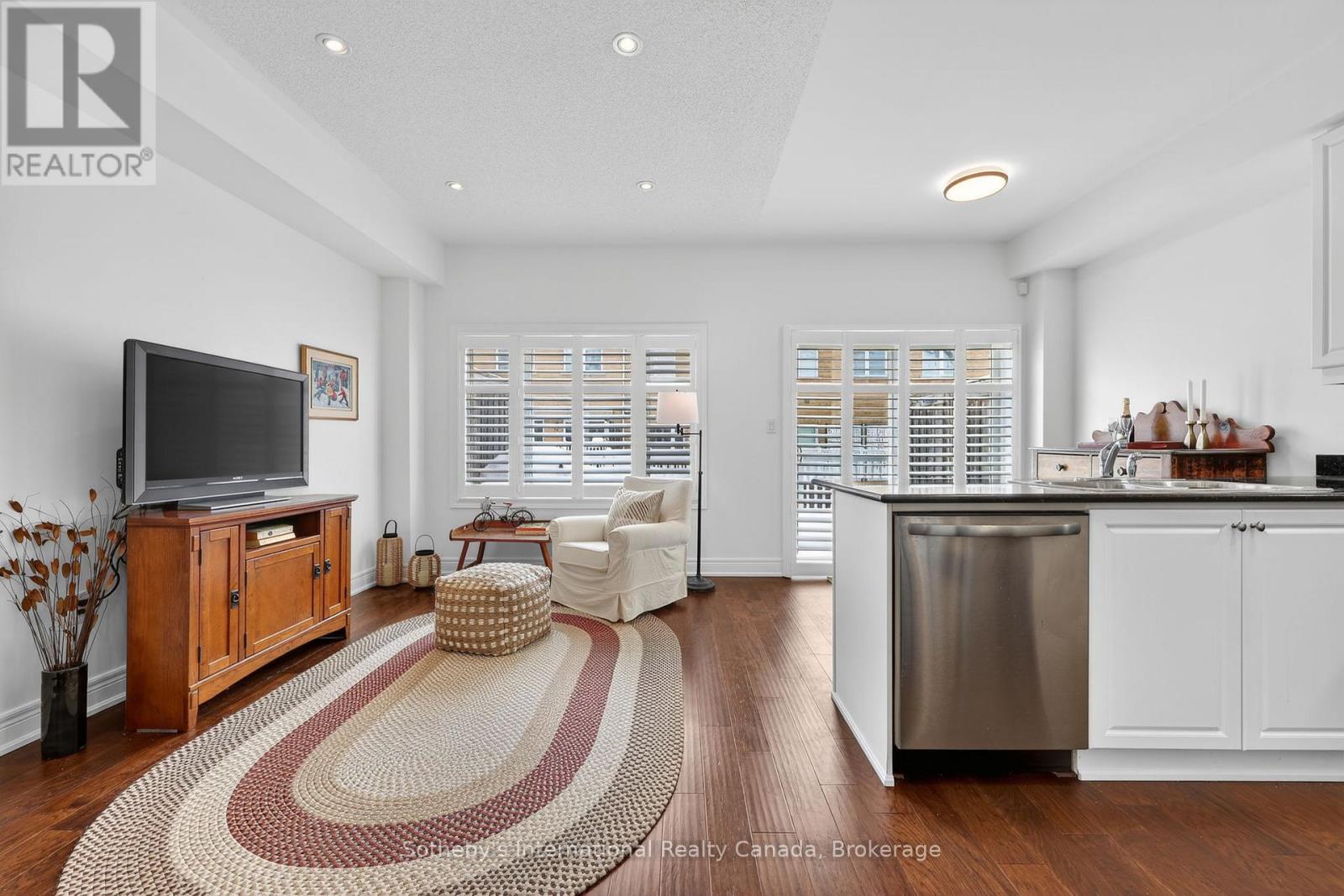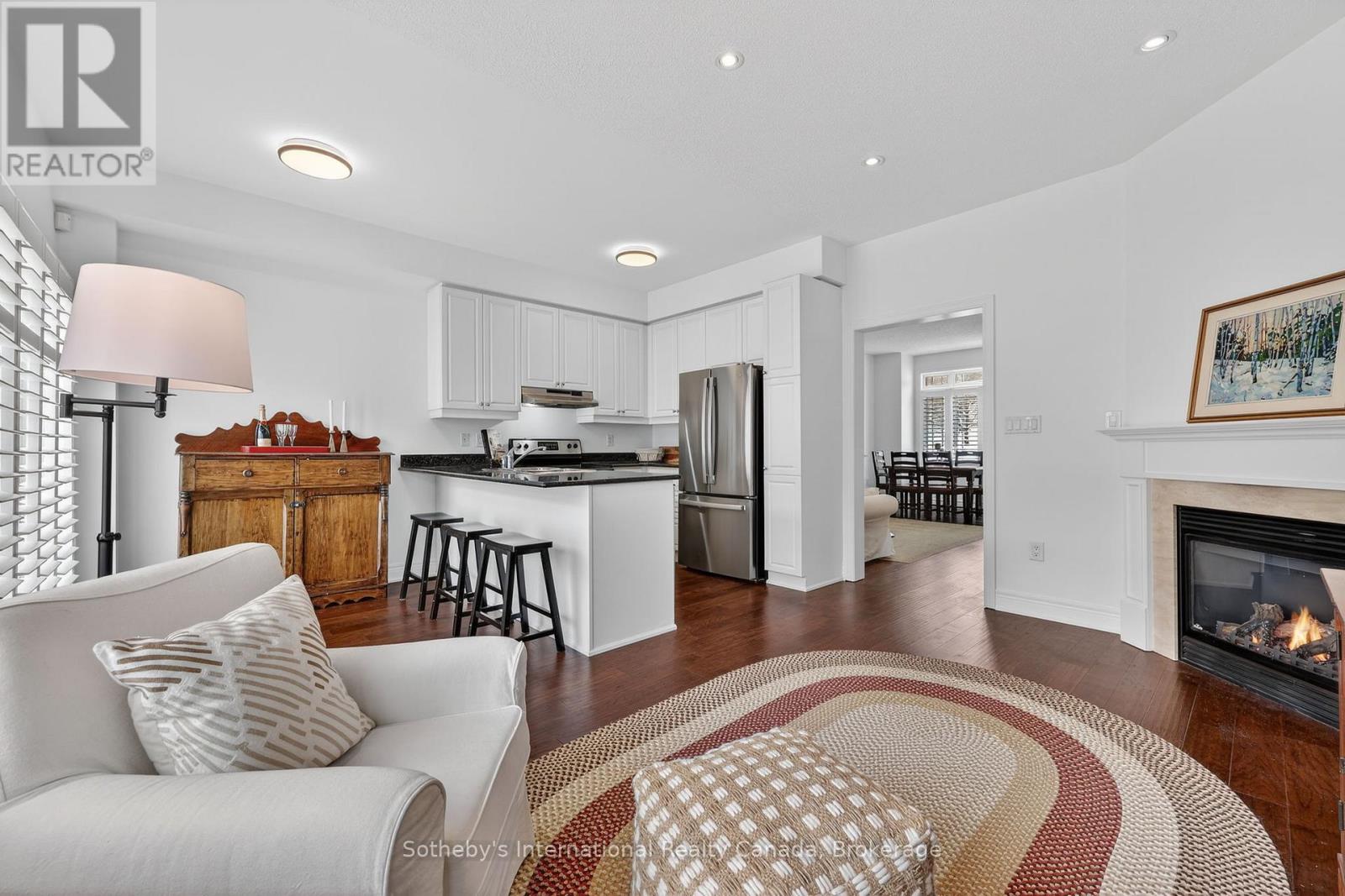 Welcome to The Shipyards and 25 North Maple! Enjoy stylish, convenient and hassle free living in this beautiful three bedroom, two bathroom downtown condo. Located just steps from Collingwood Harbour and Hurontario St with world-class shops, dining and entertainment and minutes from sandy beaches, golf courses and skiing, you are truly immersed in the four-seasons lifestyle of Southern Georgian Bay. The bright and inviting main floor offers a spacious combined living/dining room with entrance from North Maple St, views of the lush green space to the west and the luxury of engineered hardwood floors throughout. The open concept kitchen and family room boasts ample storage, granite counters, a cozy gas fireplace and walk-out to a spacious balcony, perfect for three-season outdoor living. The generous primary bedroom features a four piece semi-ensuite, convenient office nook and bright, private, west-facing windows. With two more spacious and comfortable bedrooms, there is plenty of room for family or guests. With the added convenience of a two-car garage with interior access to the basement, this Shipyards gem is the perfect primary residence or weekend home. (id:64974)