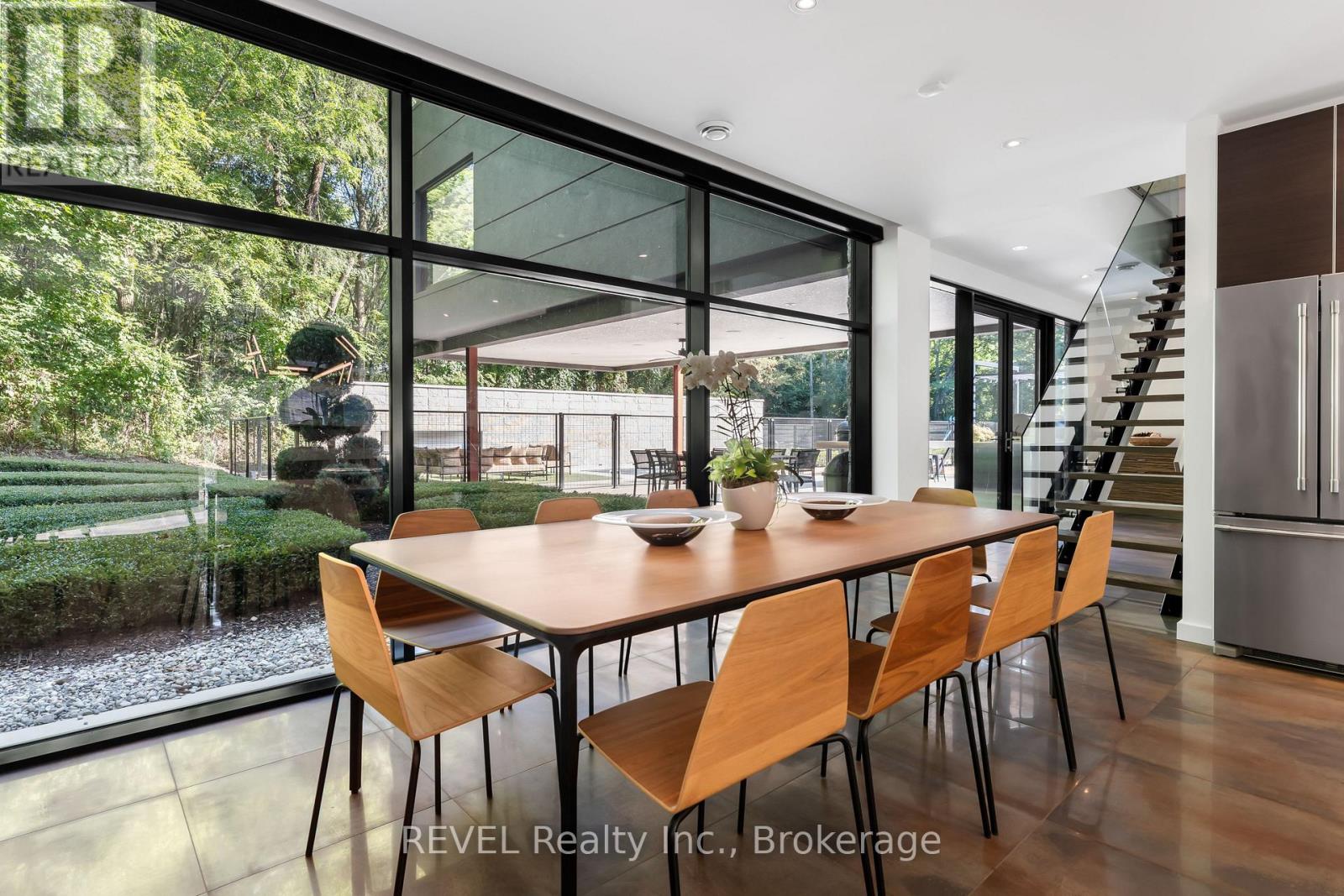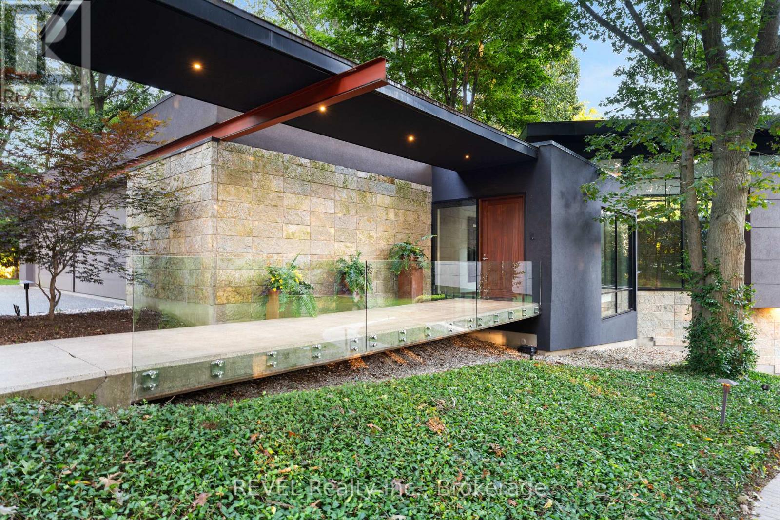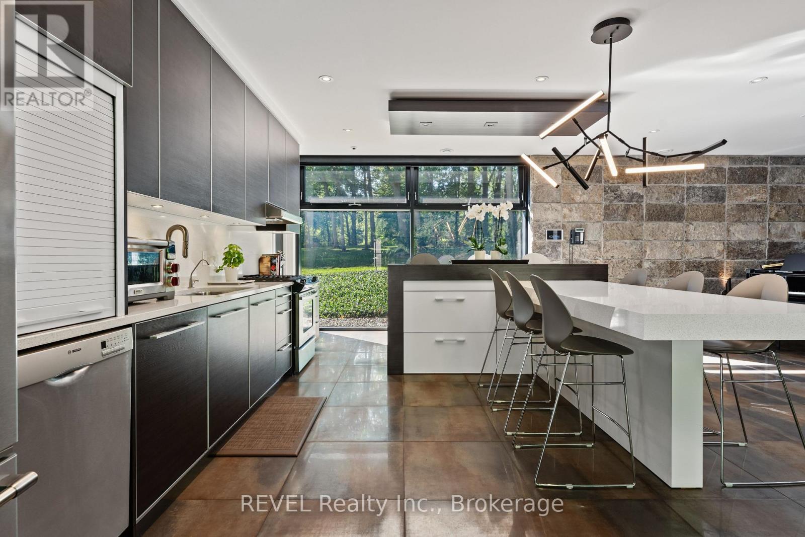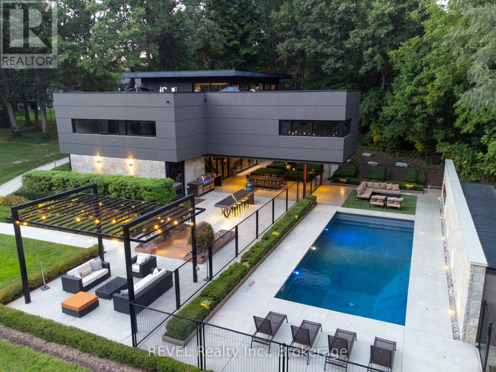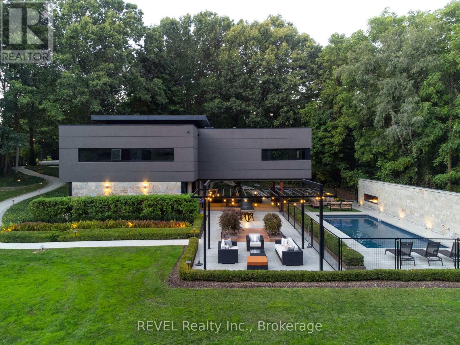 Architectural majesty and artistic risk define luxury for this modern bungalow estate in the charming township of Fonthill. Emerging from a 2.9 acre property populated by picturesque, Carolinian trees, this modernly unique one story creation with full walkout and floor to ceiling curtain wall windows, fuses a designer eye with an environmentalist's appreciation for natural integration. Structured with steel frame construction, and offering in floor heating via boiler and concrete floors on both main and lower levels, this mansions elite finishes, set against the views of forested privacy, present pleasurable pastoral perspectives and authentic tranquility, inside and out. Features include 16' ceilings in main living area; specialty imported glass porcelain tiles; engineered hardwood; fully automated light and sound systems by Crestron Products; surround sound theater area with power drop down screen; wine and artisanal meat cellar; enormous upper and lower designer kitchens with quartz stone countertops; three plus one spacious bedrooms; main floor glass walled office; master ensuite with oversized shower; and customized built ins throughout for exceptional storage capacity. The sauntering transition to resort worthy outdoor amenities is just as dazzling, with walkouts that seamlessly flow into a heated saltwater pool area with feature stone wall, outdoor gas fireplace, cedar clad washroom and change rooms. For the luxury car enthusiast, and with 400 amp electrical service available, enjoy the recently built 2600sq.ft showcase accessory garage(detached) that complements an oversized four car garage attached to the home. With approximately 5400 sq. ft of fully finished and fully serviced living space conceptualized to exploit every possible vantage point of this incredible landscape, this estate sets a new standard as the epitome of luxury listings. (id:64974)