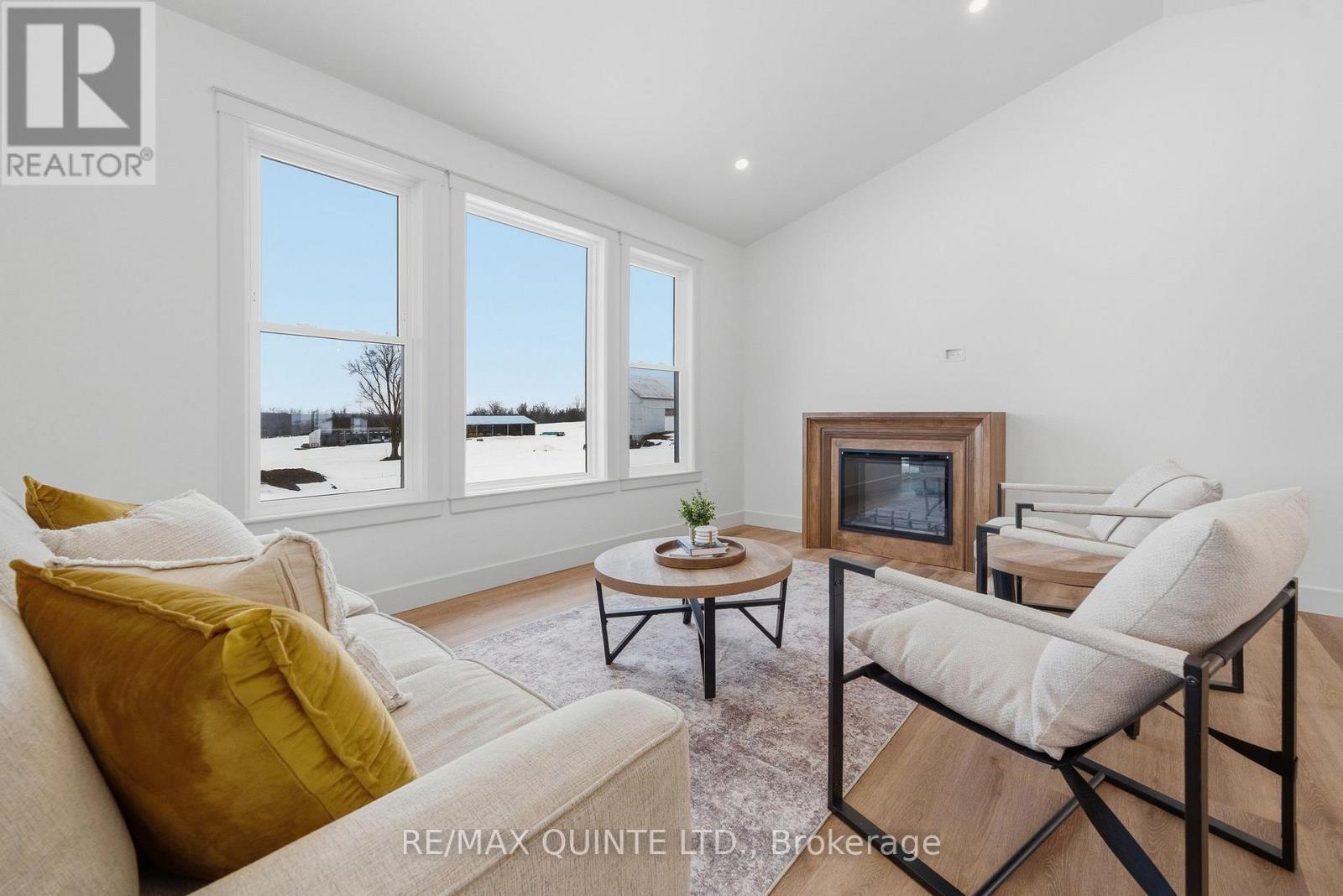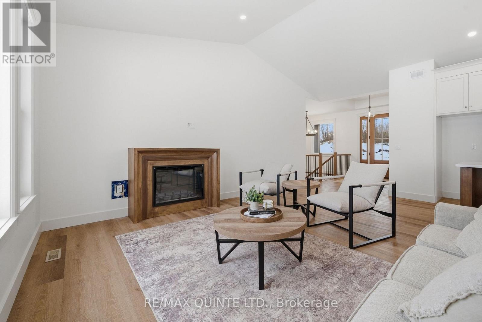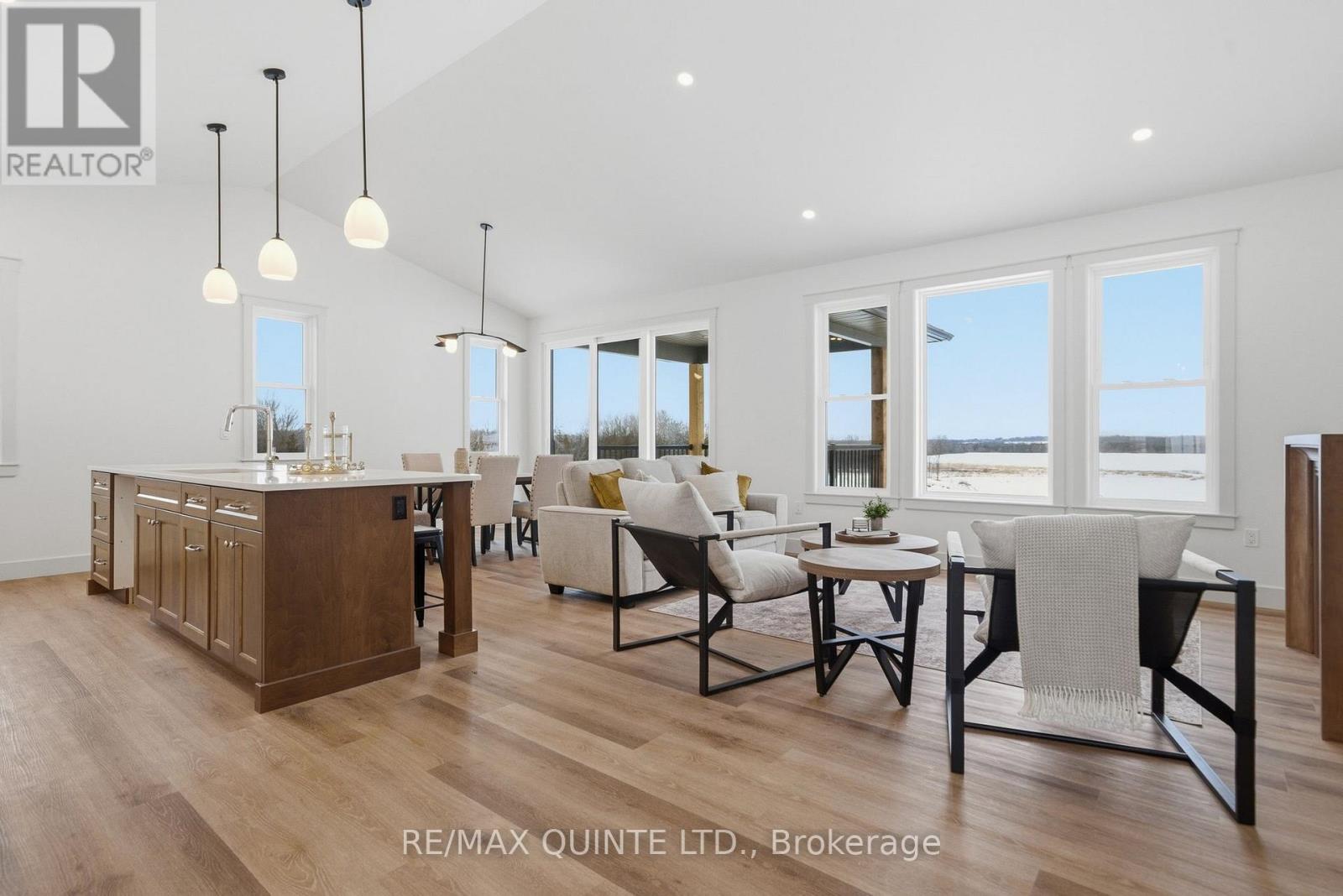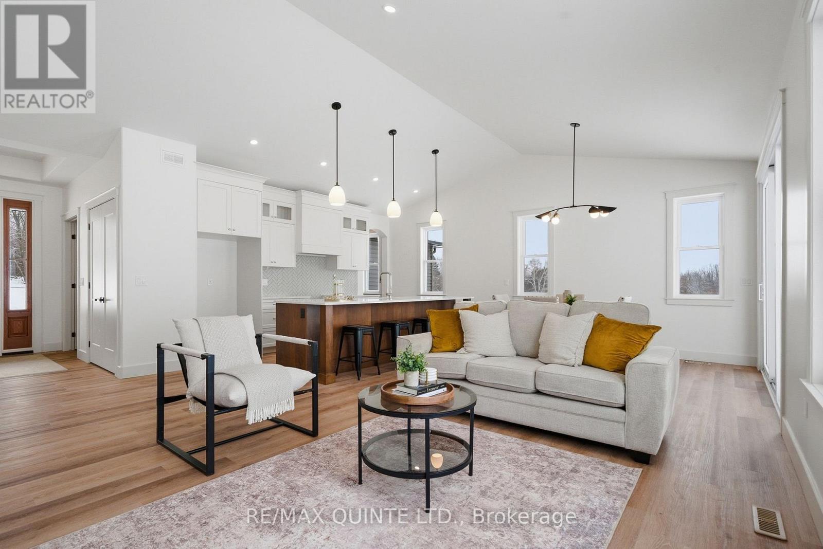 Brand-New completed executive home on Harmony Road. This gorgeous 1,730 sq. ft. bungalow is on a country lot, offering rural privacy while being only 15 minutes from Belleville. Designed with family living in mind, the home features a bright, open-concept kitchen, dining, and living area with large windows, vaulted ceilings, and patio doors leading to a covered deck. The kitchen is finished with quartz countertops, under-cabinet lighting, and a large walk-in pantry with a sink. The spacious primary suite includes a walk-in closet and a spa-inspired ensuite with double sinks, heated tile floors, a quartz vanity, and a custom tiled shower with a glass enclosure. Two additional bedrooms, a full main bathroom, and a conveniently large mudroom accessed from the 3-car garage. The home includes a private laundry room, set apart in its own space located near the bedrooms. The lower level is designed with an additional bedroom, den/office, full bathroom, and a recreation room with a walkout. With so many advanced features throughout the home, the best way to truly admire them is to see it with your own eyes! (id:64974)