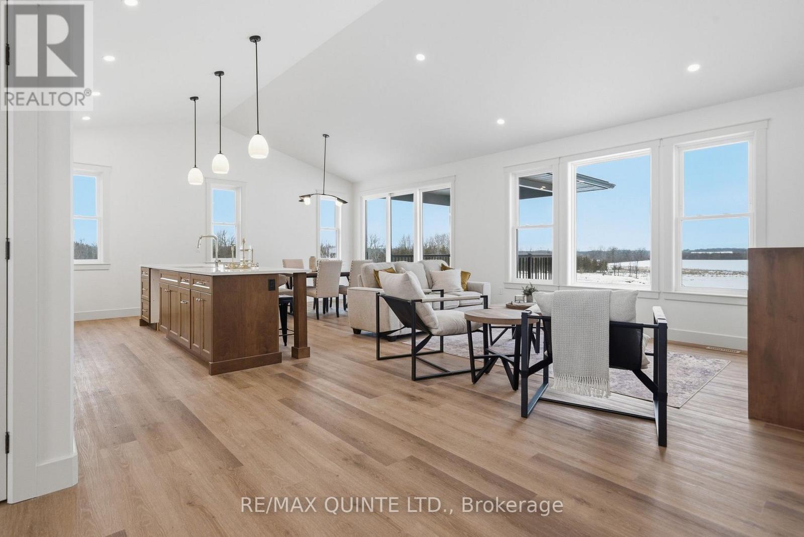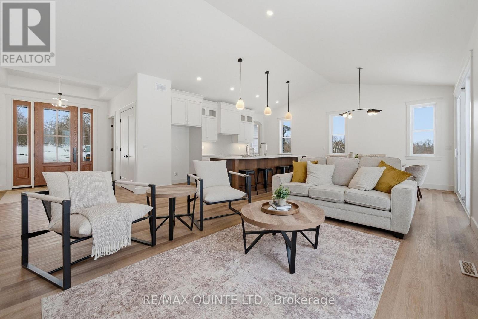 Brand-New completed executive home on Harmony Road. This gorgeous bungalow is on a country lot, offering rural privacy while being only 15 minutes from Belleville. Designed with family living in mind, the home features a bright, open-concept kitchen, dining, and living area with large windows, vaulted ceilings, and patio doors leading to a covered deck. The kitchen is finished with quartz countertops, under-cabinet lighting, and a large walk-in pantry with a sink. The spacious primary suite includes a walk-in closet and a spa-inspired ensuite with double sinks, heated tile floors, a quartz vanity, and a custom tiled shower with a glass enclosure. Two additional bedrooms, a full main bathroom, and a conveniently large mudroom accessed from the 3-car garage. The home includes a private laundry room, set apart in its own space located near the bedrooms. The lower level is designed with an additional bedroom, den/office, full bathroom, and a recreation room with a walkout. With so many advanced features throughout the home, the best way to truly admire them is to see it with your own eyes! (id:64974)