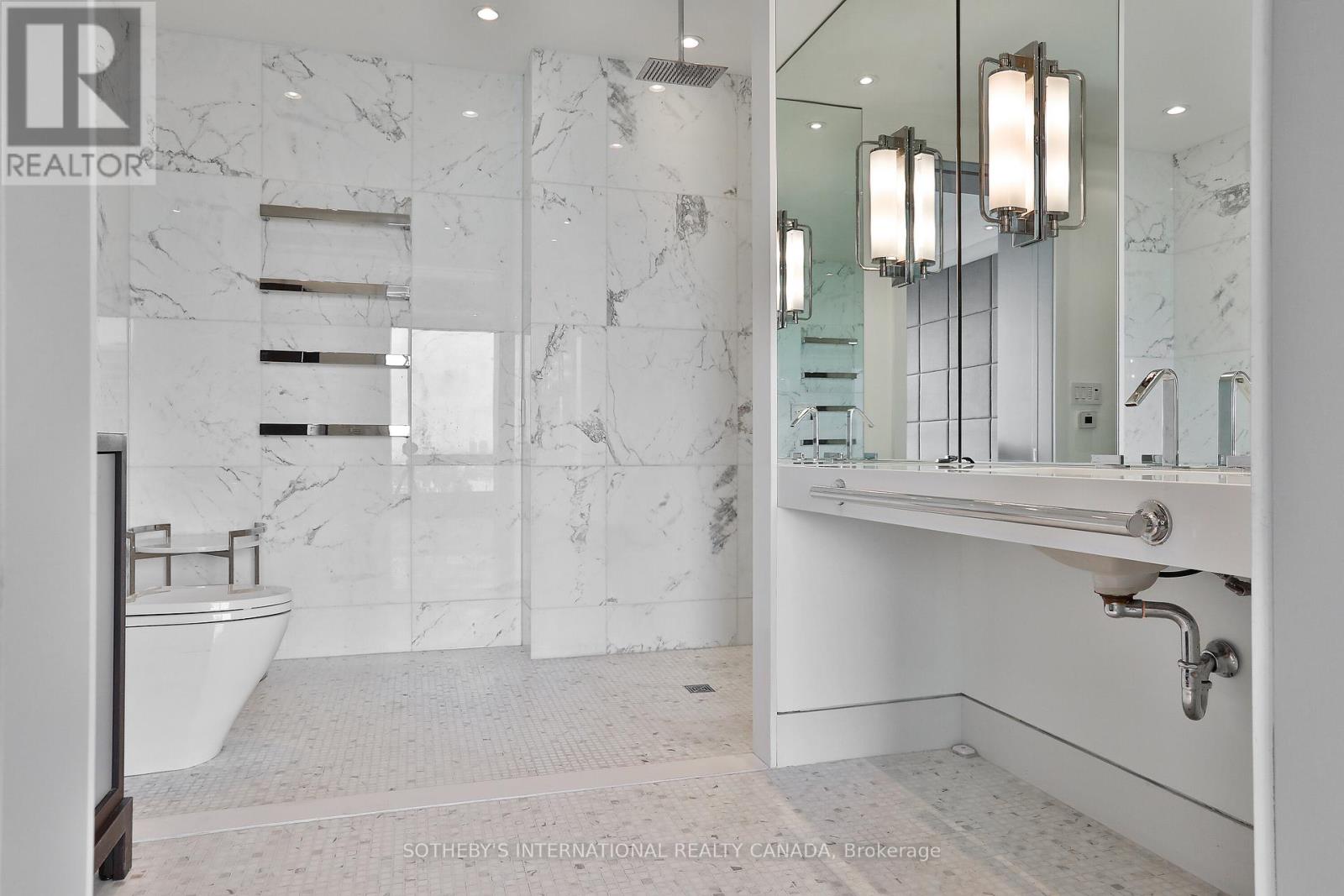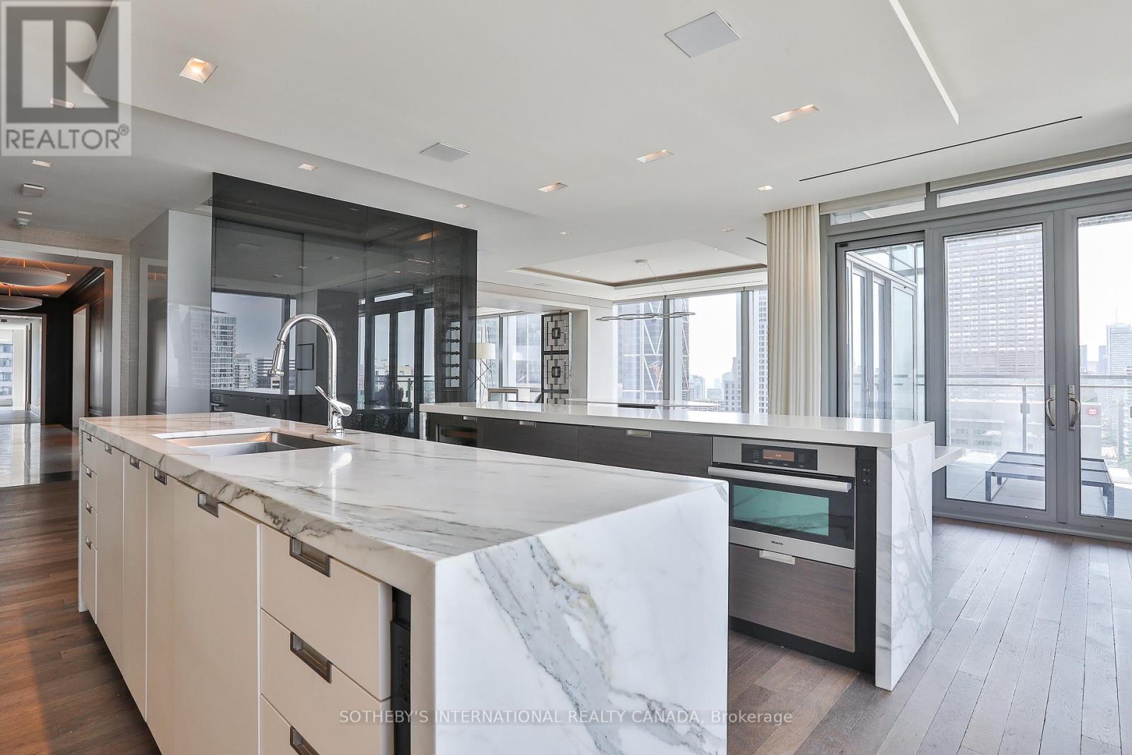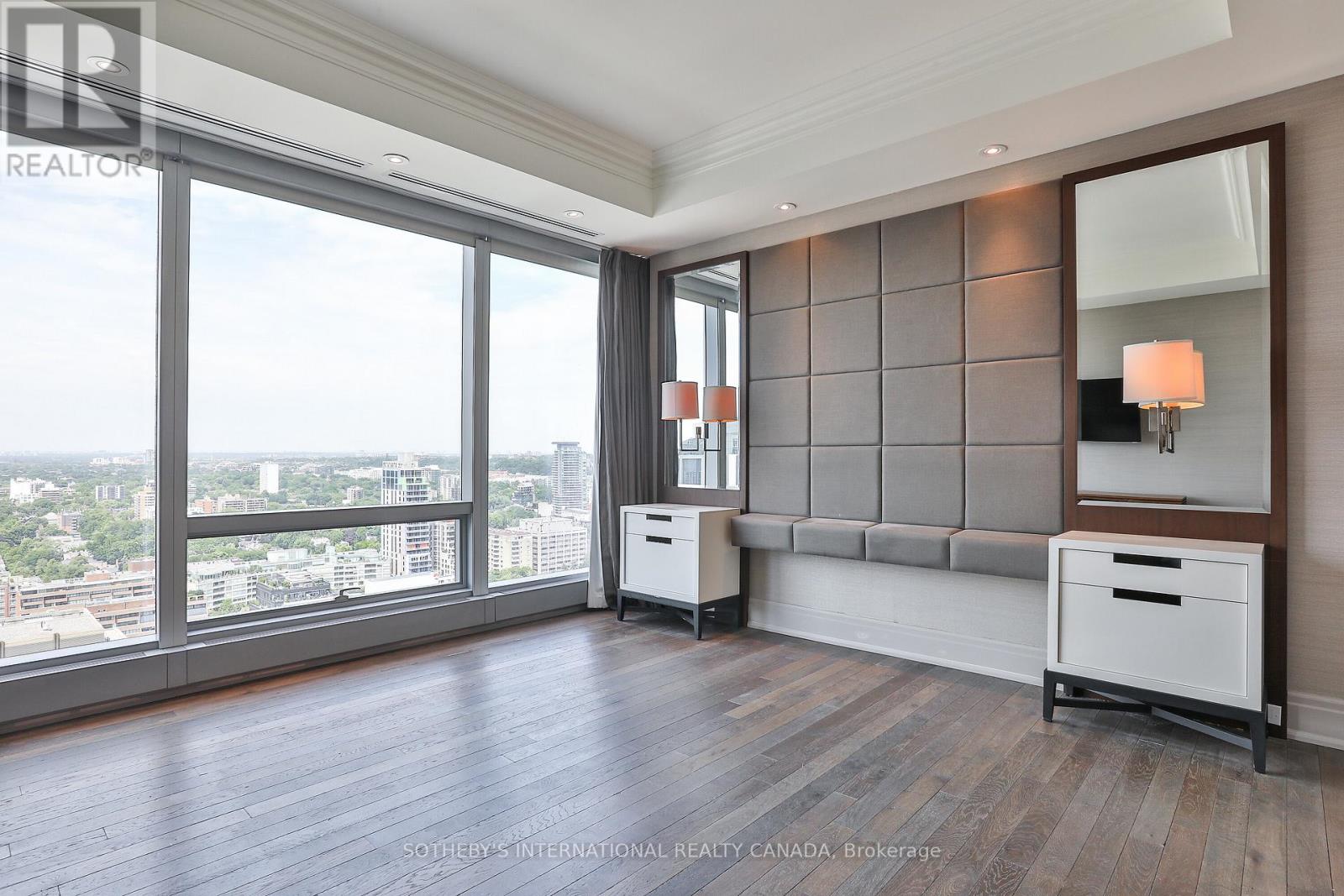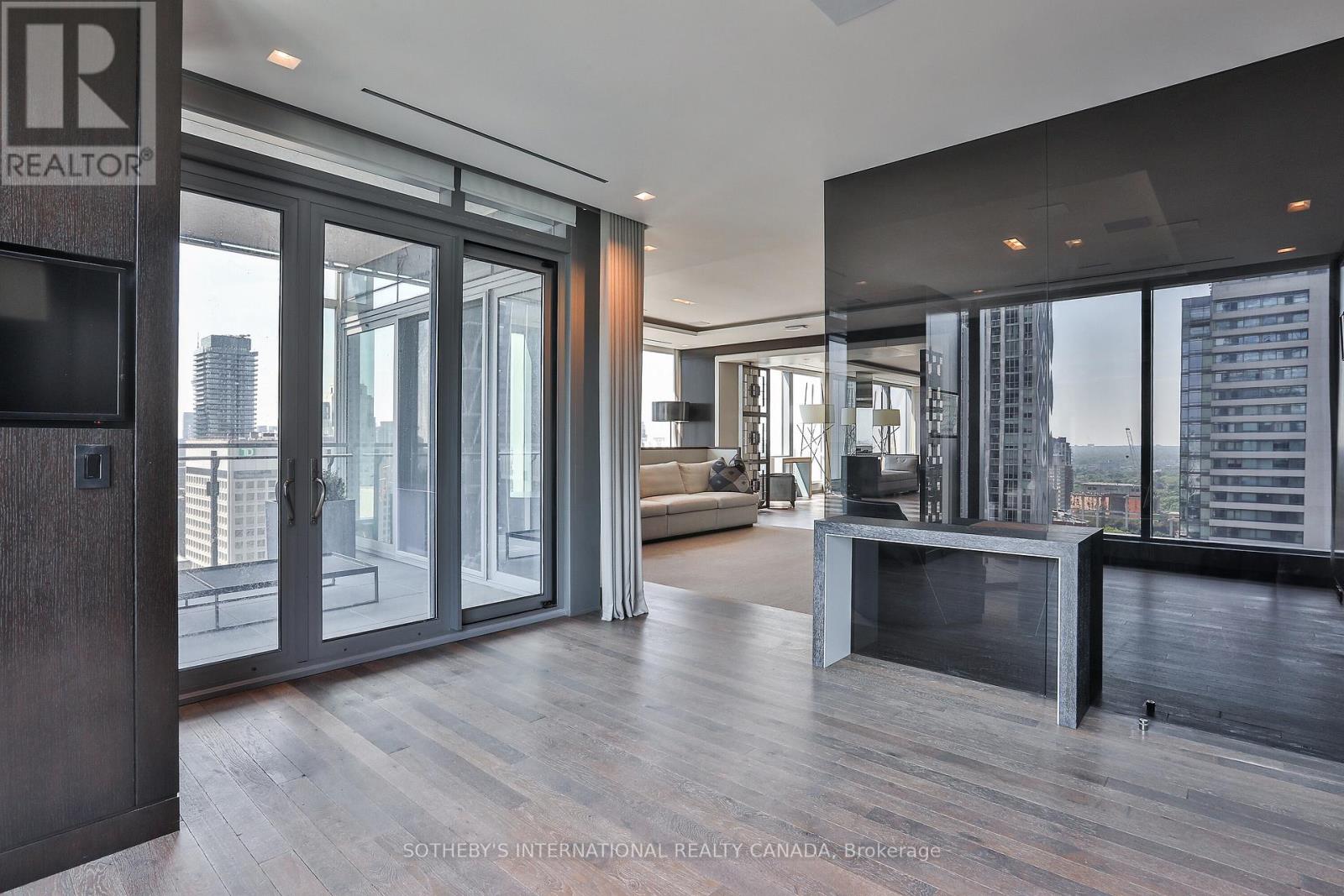 This extraordinary suite at the Four Seasons Private Residences in Yorkville redefines luxury living in the heart of Toronto. This is not just a residence but an elevated lifestyle reserved for a select few. Created by merging two units into a single masterpiece, the suite spans approximately 5000 square feet with soaring 10' ceilings, presenting the scale and poise of a home in the sky. Enter via two private elevators directly into an elegant foyer of epoxied and honed marble, then step into luminous living spaces framed by floor-to-ceiling windows with sweeping south-west-east unobstructed views and two expansive private terraces.The culinary centrepiece is a chef inspired kitchen featuring custom Kobi cabinetry, two waterfall edge Statuario marble islands and fully integrated Subzero and Miele appliances. Rich walnut and Xorel panels, Moncer custom Herringbone Oak Hardwood flooring and a floating fireplace showcase meticulous design throughout. Four generous bedrooms and five bathrooms - including a primary ensuite with heated floors, Vola plumbing fixtures, honed Calacatta Oro epoxy filled mosaic detailing and large walk in closet - offer sanctuary and luxury in equal measure.Comfort and ambiance are seamlessly managed via two hvac units with concealed returns and linear vents. Residents enjoy world class Four Seasons services: 24/7 concierge, full service spa, valet parking, indoor pool, state of the art gym and wellness centre, room service, house keeping and culinary options include Cafe Boulud and D bar lounge, all in a secure refined environment (id:64974)