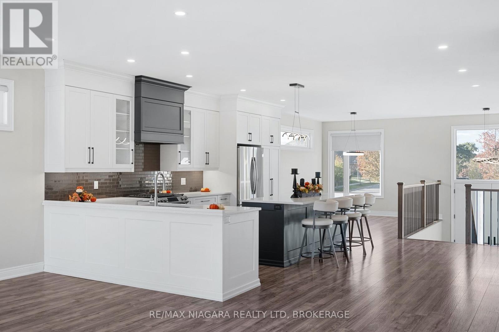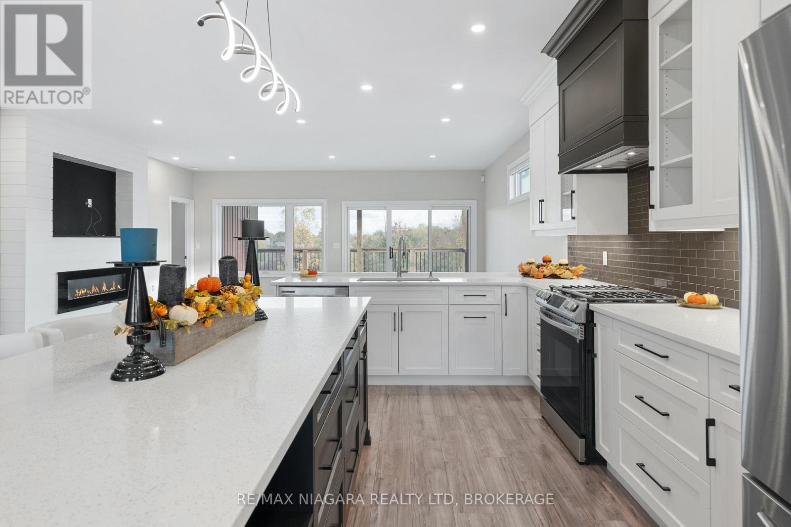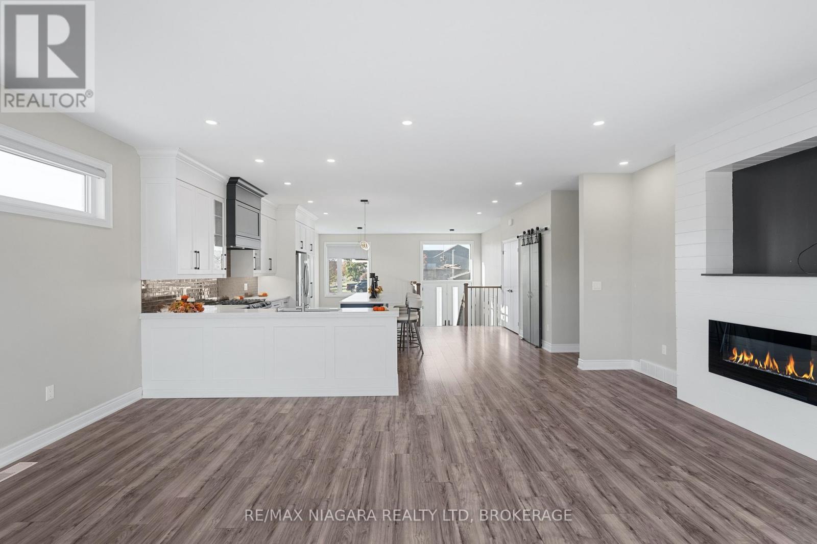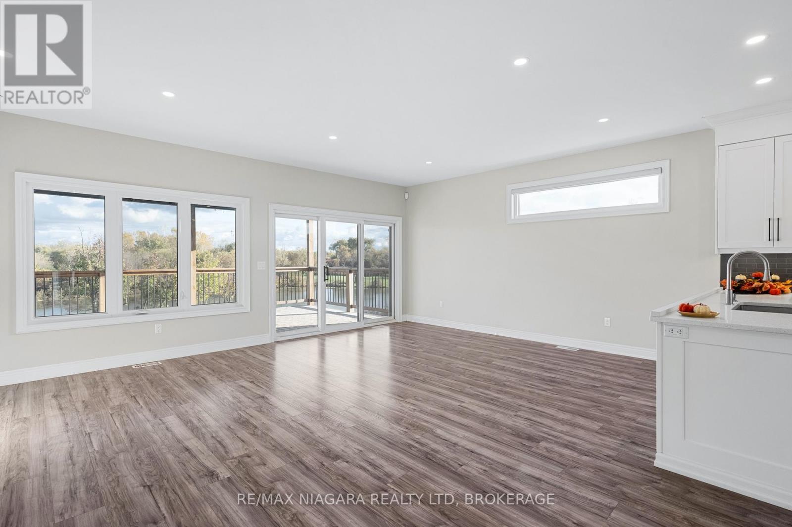 Luxury waterfront living on the Welland River. This exceptional raised bungalow offers 2+2 bedrooms, 2+1 bathrooms, and over 2,600 sq. ft. of beautifully finished living space thoughtfully designed to accommodate multi-generational living while maintaining comfort and style.The bright, open-concept main level features a custom kitchen with quartz island, a spacious great room with a wall-mounted fireplace, and direct access to a covered deck overlooking a stunning riverbend view. The primary suite provides a private retreat with a spa-inspired ensuite, complete with a walk-in glass and tile shower and a freestanding soaker tub. The fully finished walkout lower level offers a self-contained living area with a full kitchen, two bedrooms, a 3-piece bathroom, and a large recreation space with direct access to the waterfront patio-ideal for extended family or guests. Elegant finishes throughout - rare opportunity to enjoy modern living in a tranquil waterfront setting in Niagara. (id:64974)
