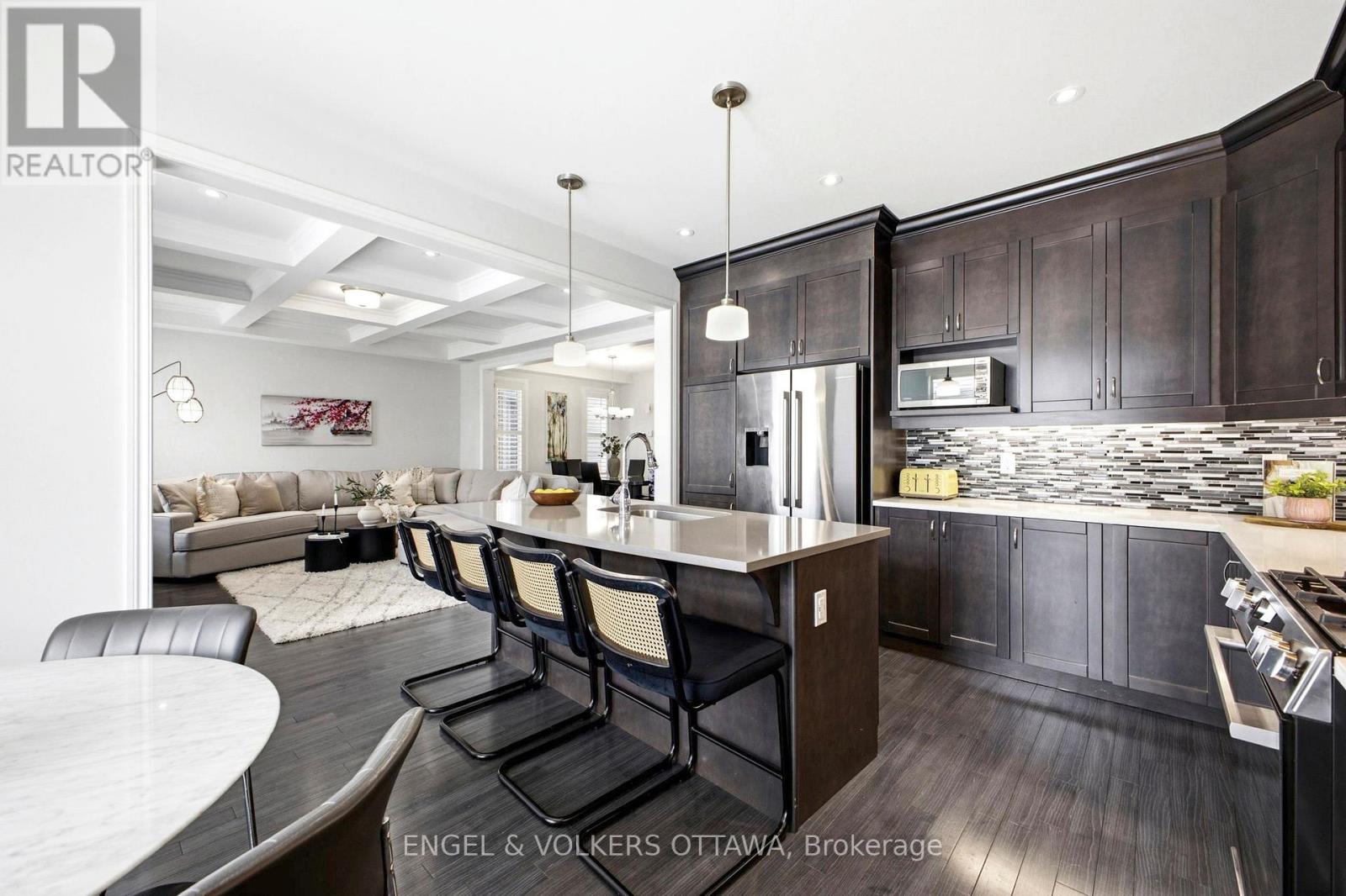 Welcome to this beautifully maintained Mattamy Parkside home, offering 2,721 sq. ft. of thoughtfully designed living space above grade, plus a fully finished basement offering an additional ~900 sq. ft. of living space. Situated on a 36' x 88' lot in a mature, established community, this 4 bedroom, 5 bathroom residence is ideal for growing or multigenerational families. The main level features hardwood flooring, a versatile den ideal for a home office, library, or playroom, and an inviting living room with coffered ceilings and a gas fireplace. The spacious kitchen is both functional and elegant, complete with granite countertops, a large island, extended cabinetry, and stainless steel Bosch appliances, including a brand new gas stove. A bright eating area with patio access enhances the space, while a mudroom with garage entry, and two walk-in closets on the main level provide excellent everyday convenience. Freshly painted throughout and featuring custom California shutters throughout the entire home, the space feels bright, cohesive, and truly move-in ready. Upstairs, you'll find a generous laundry room and well-appointed bedrooms, each with their own walk-in closets. The primary suite offers a walk-in closet and a spa-inspired ensuite with a freestanding tub, glass shower, and a double vanity. Two bedrooms share a Jack-and-Jill bathroom, while a fourth bedroom enjoys its own private ensuite bathroom. The fully finished basement (2025) extends the living space with a wet bar, Orion Slim electric fireplace, gym or flex area, and ample storage - perfect for both entertaining and everyday living. Outside, the fully fenced backyard offers a private setting for relaxation or gatherings. Located in a vibrant, family-friendly neighbourhood, just steps from parks including River Mist Park, walking trails, and several schools. Close to the Minto Recreation Complex, Stonebridge Golf Club, grocery stores, shopping along Strandherd, and only minutes to the charm of Manotick. (id:64974)